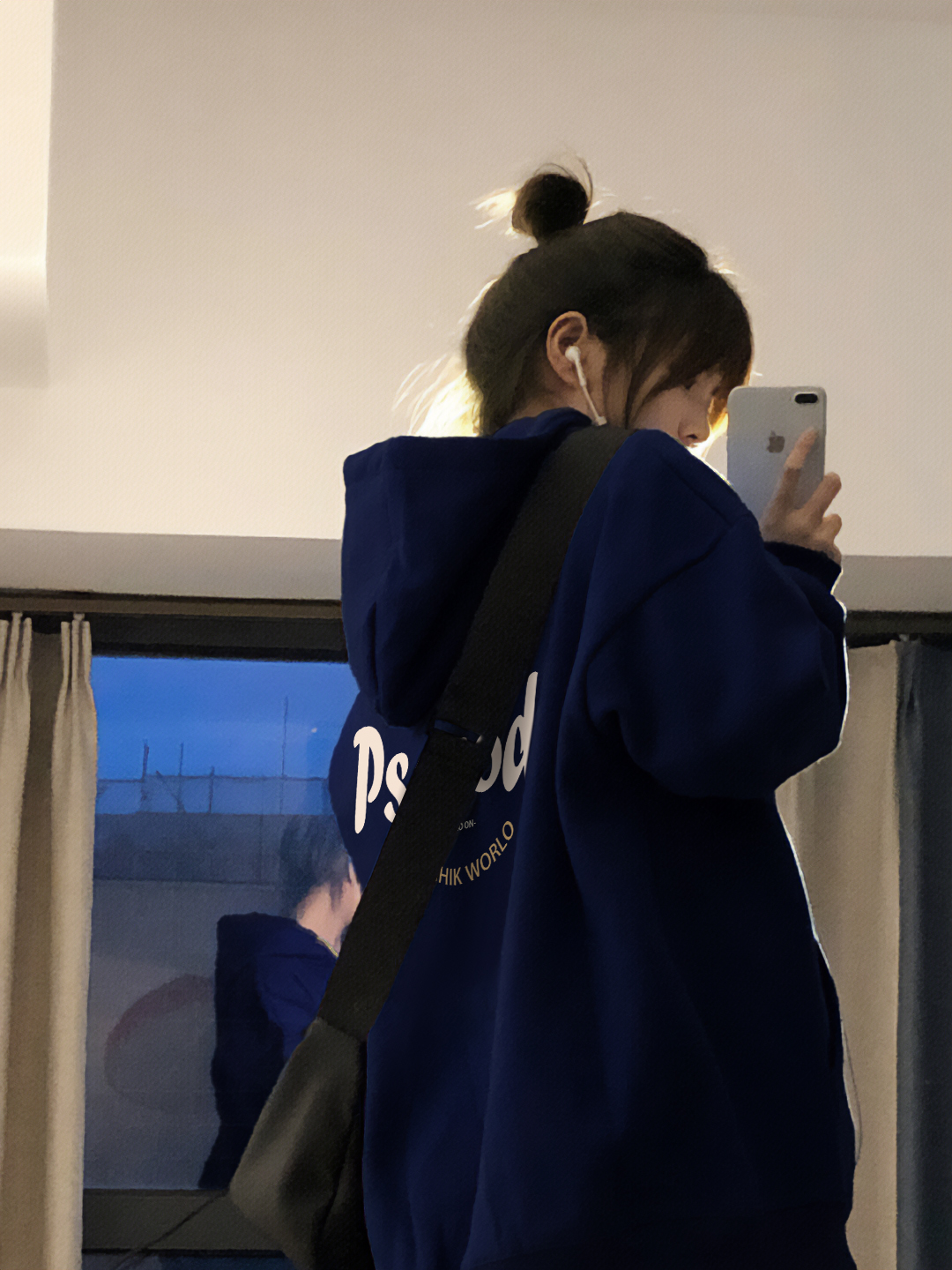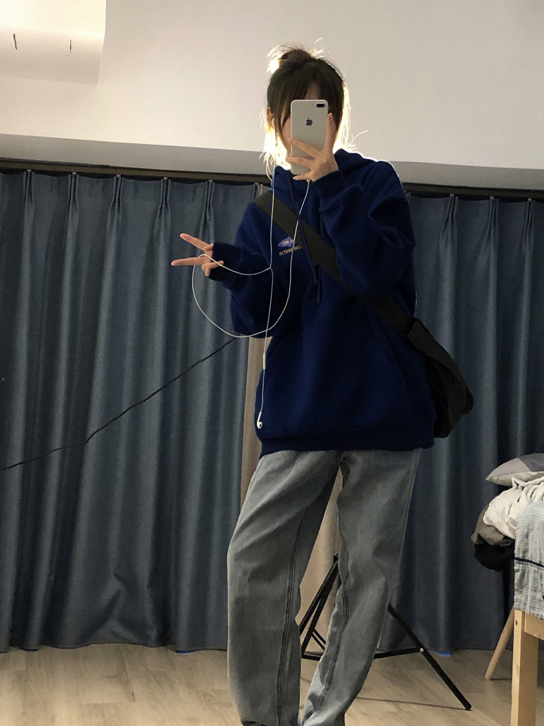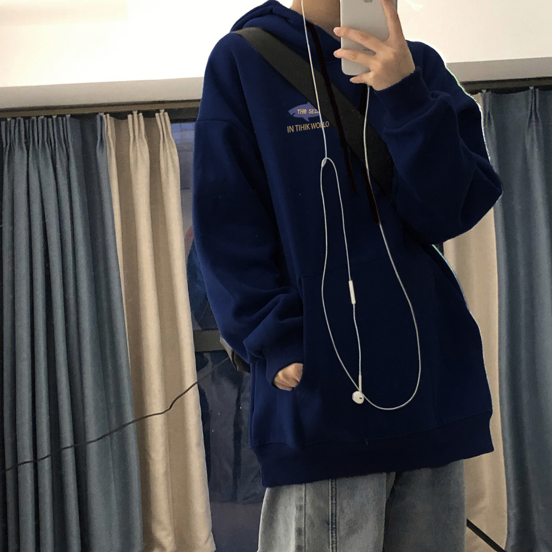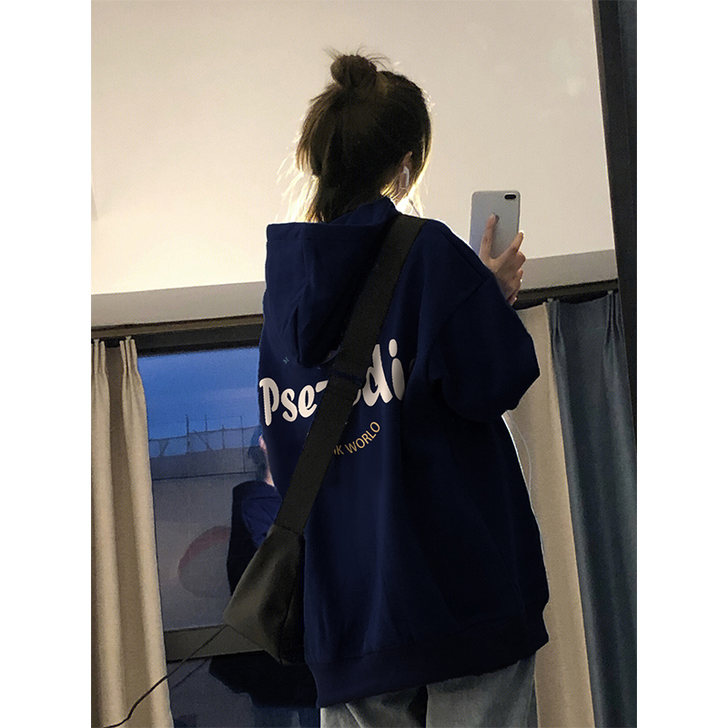 藏青色連帽oversize銀狐絨衛衣外套女春秋2023年新款薄款帽衫上衣