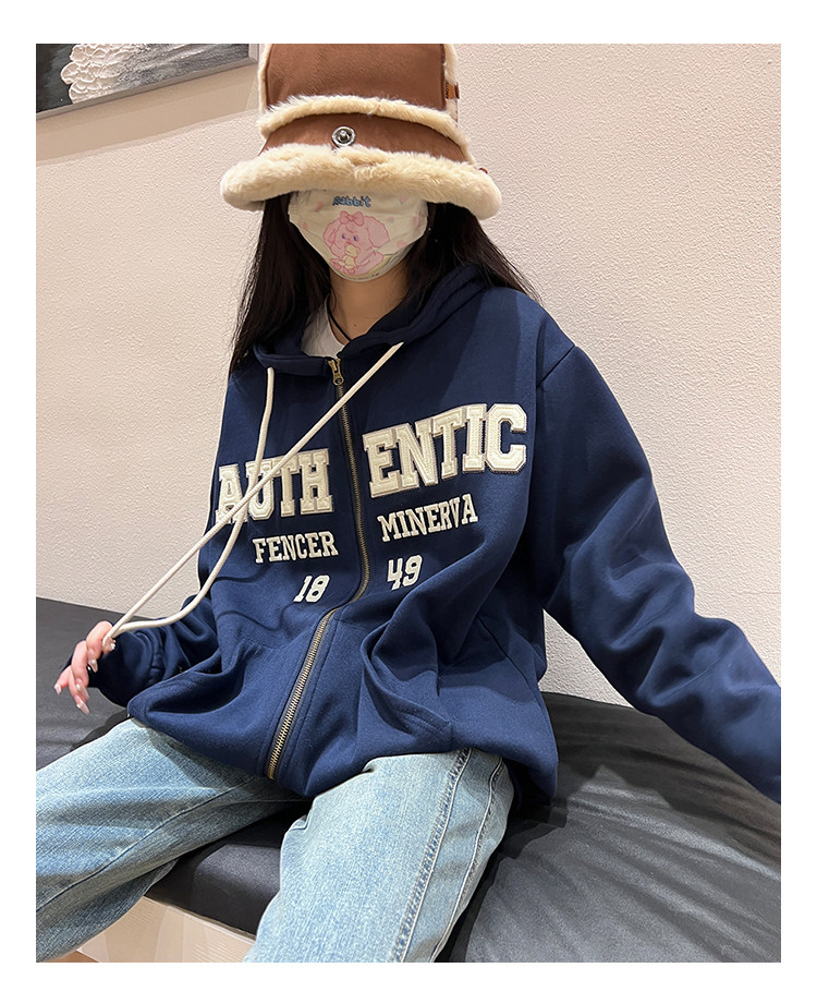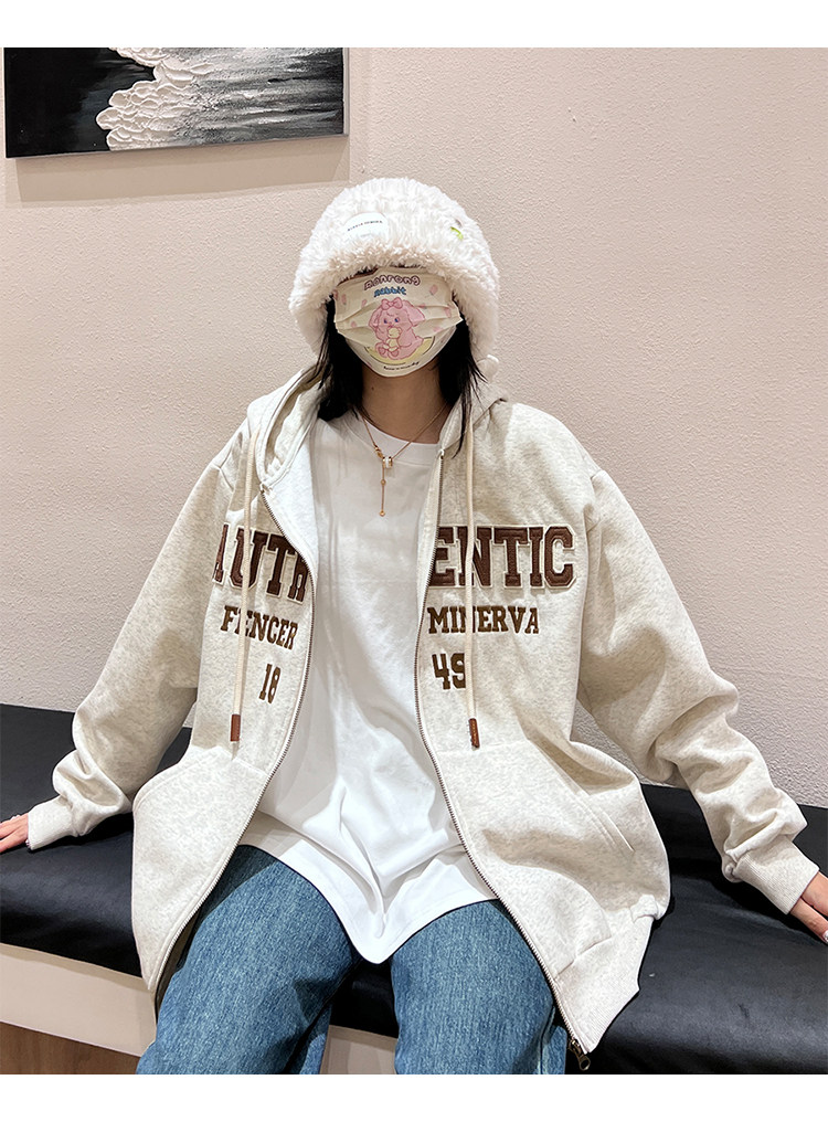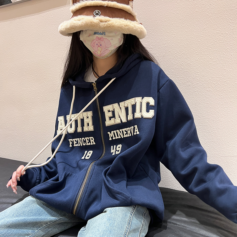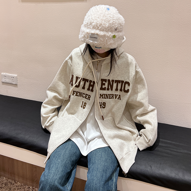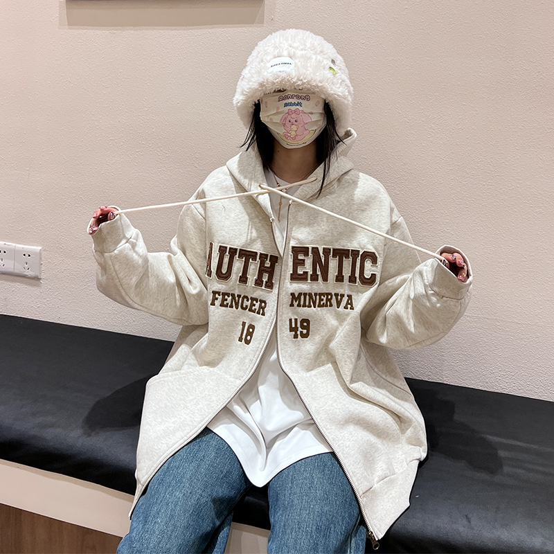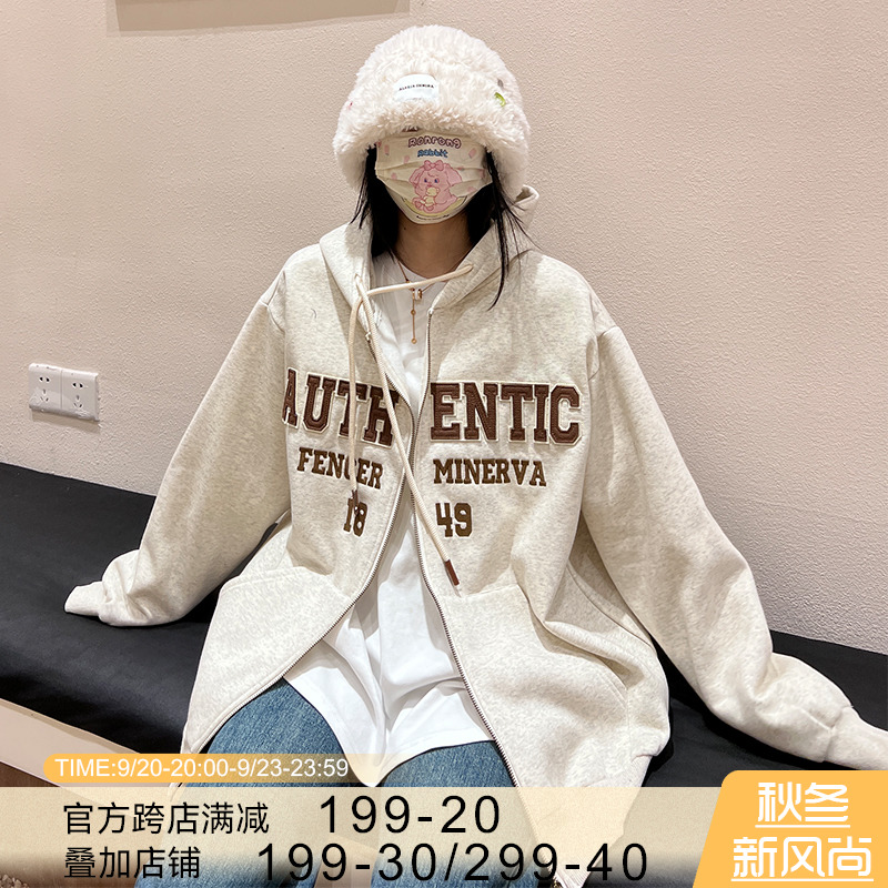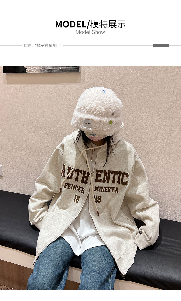 橘子樹在哪兒字母刺繡薄絨開衫連帽運動衫女秋季美式復古bf帽衫外套