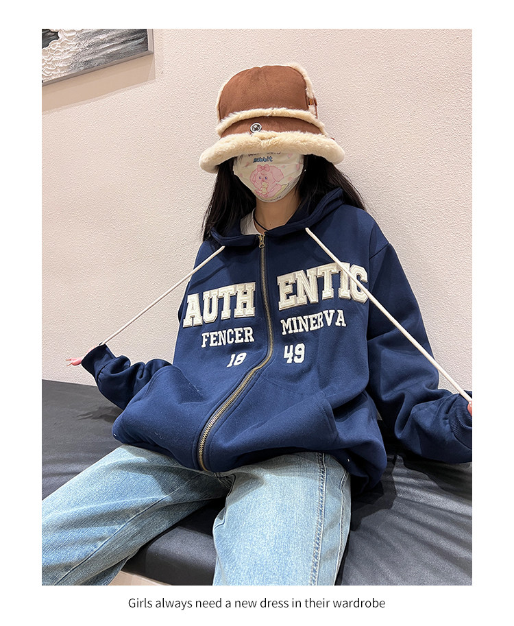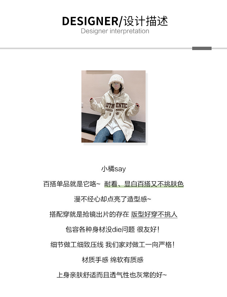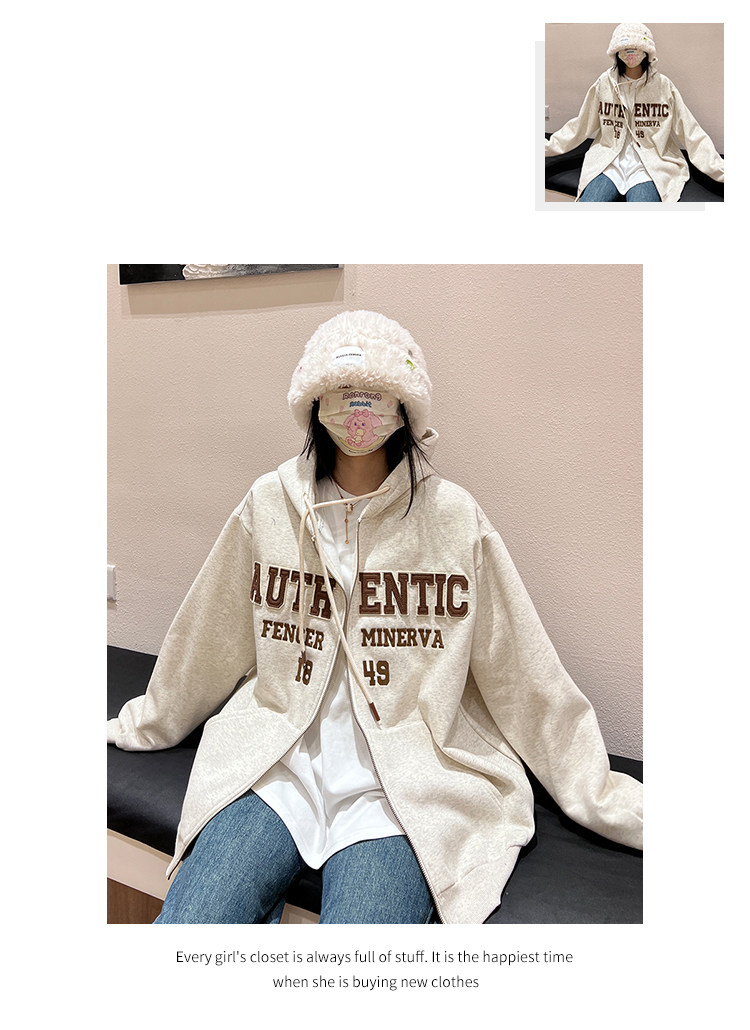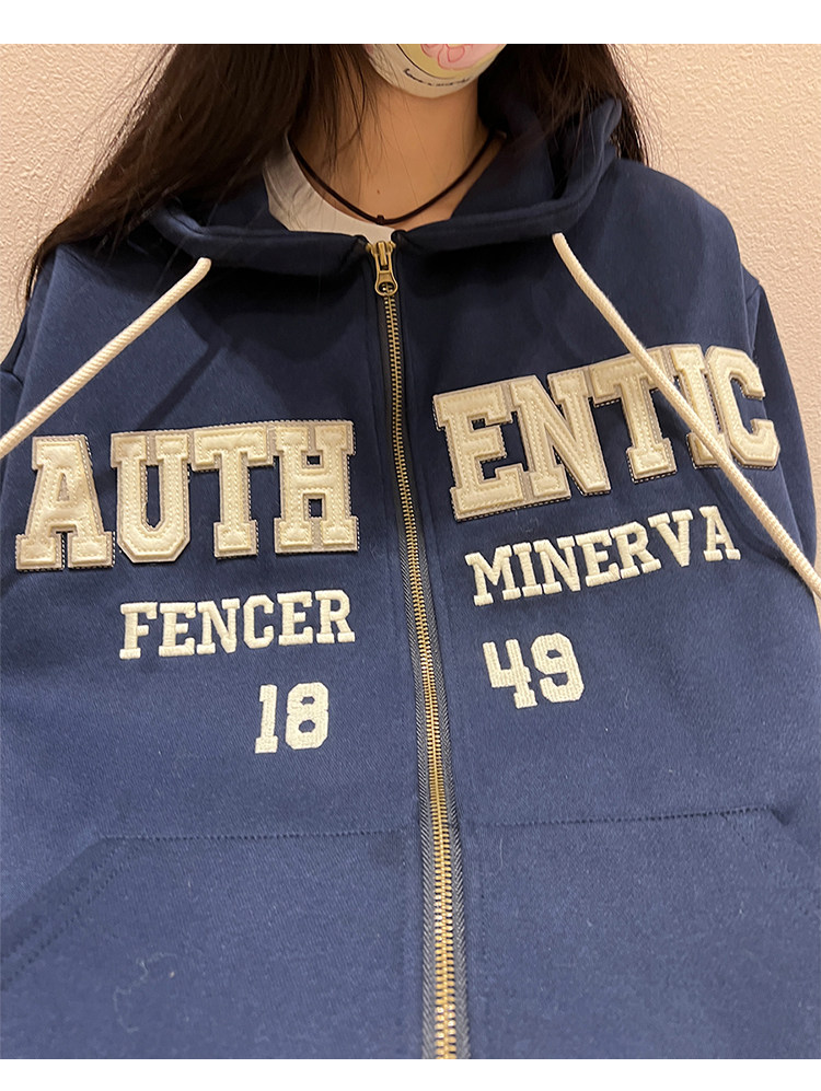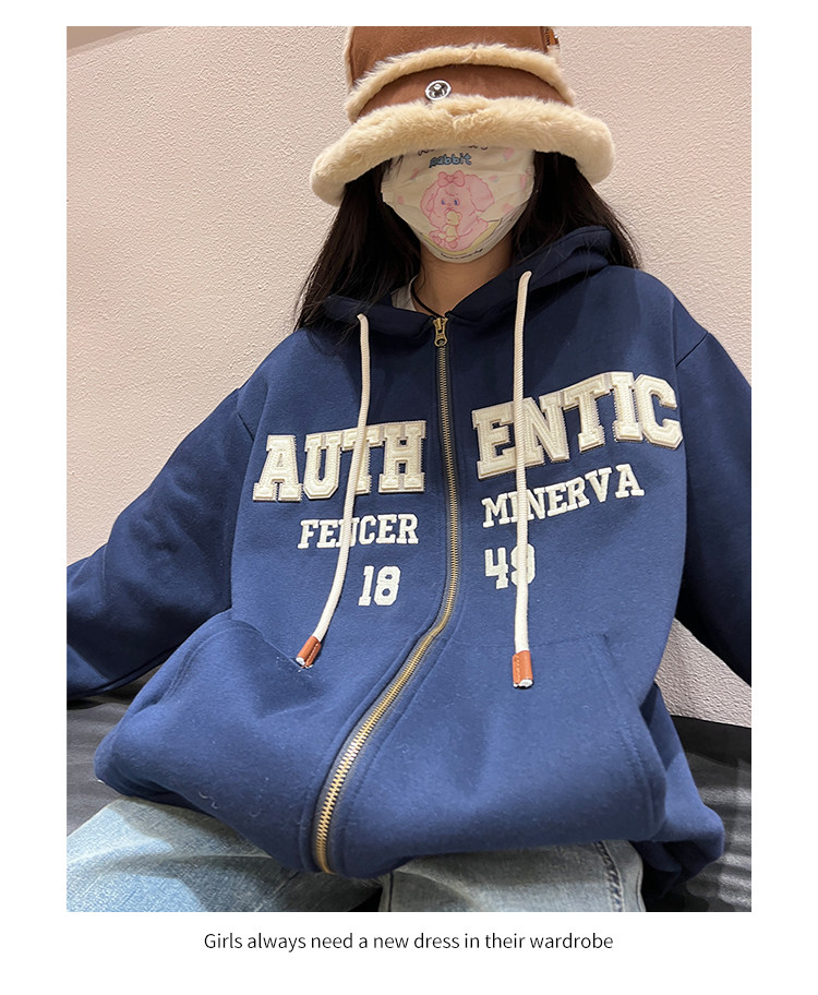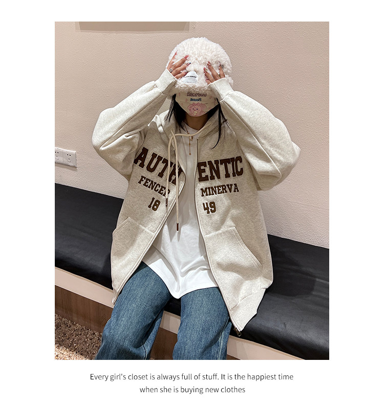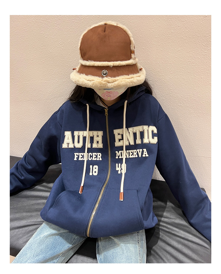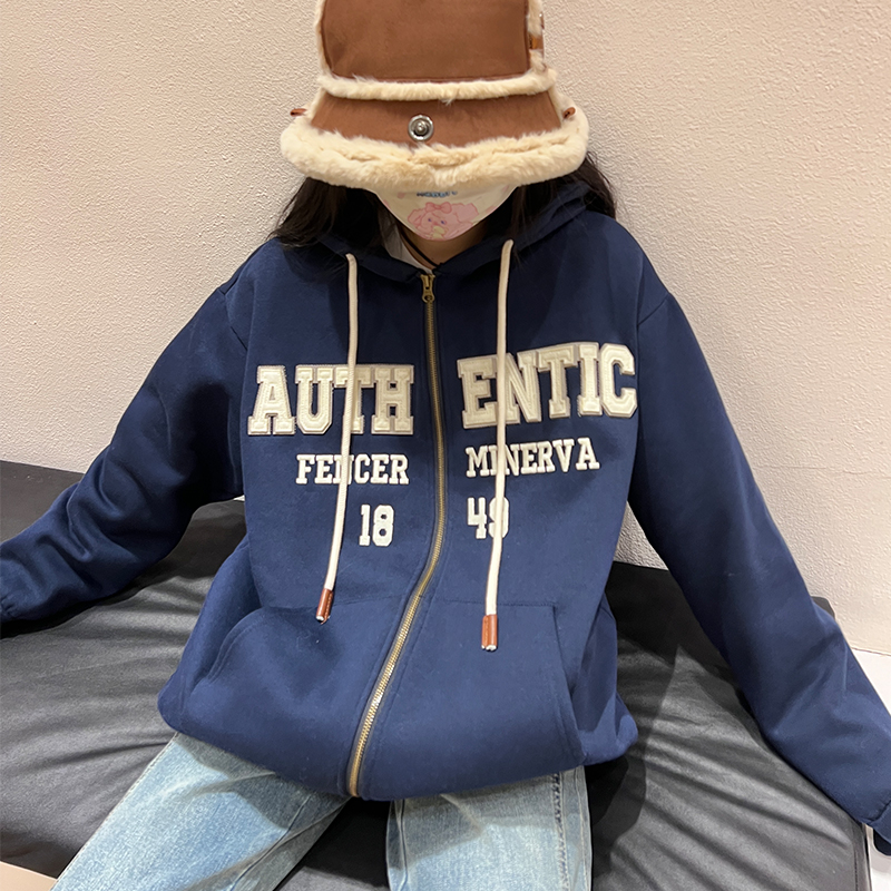 橘子樹在哪兒字母刺繡薄絨開衫連帽運動衫女秋季美式復古bf帽衫外套