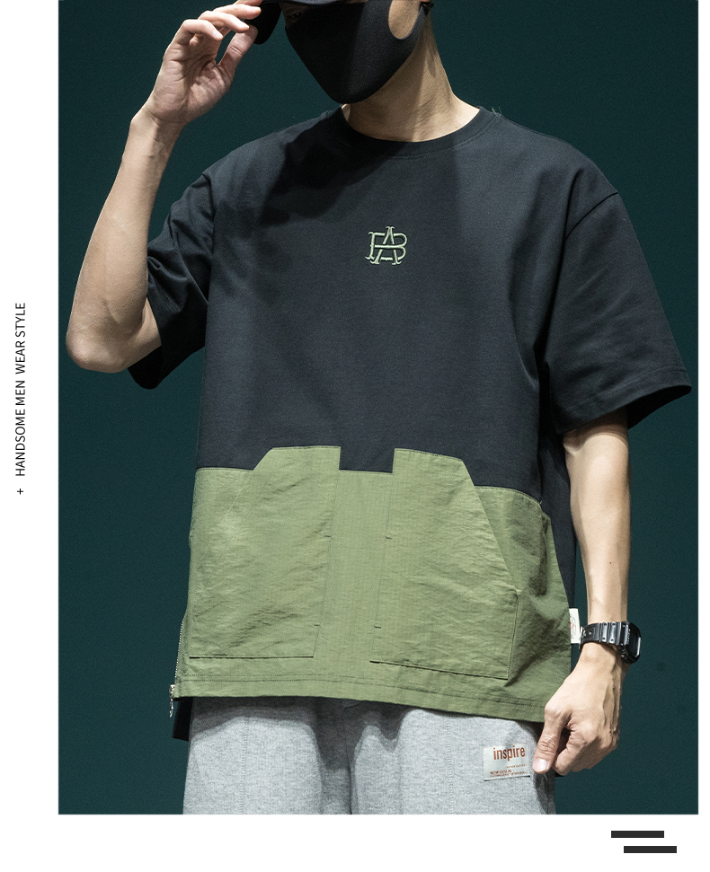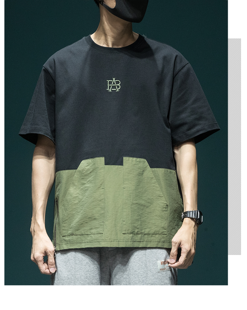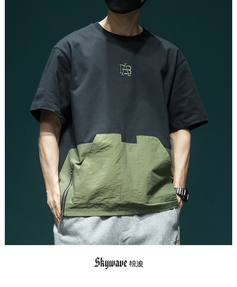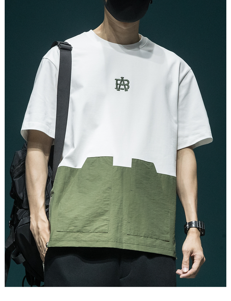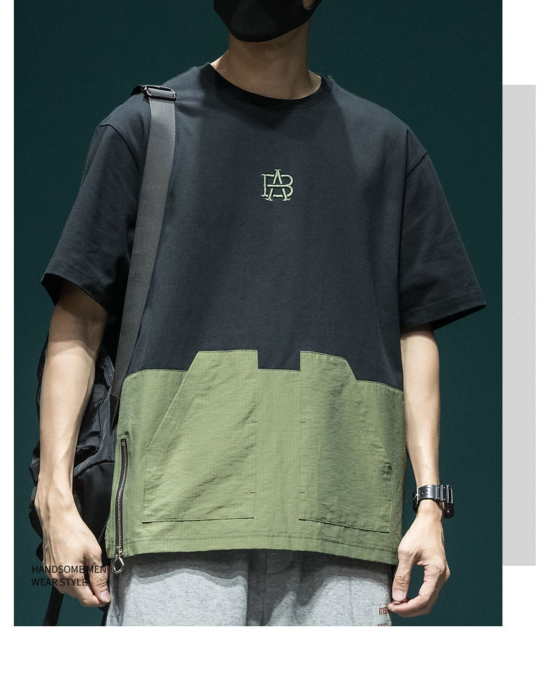 撞色拼接設計感工裝短袖男日系復古寬鬆大尺碼胖子口袋休閒圓領T恤