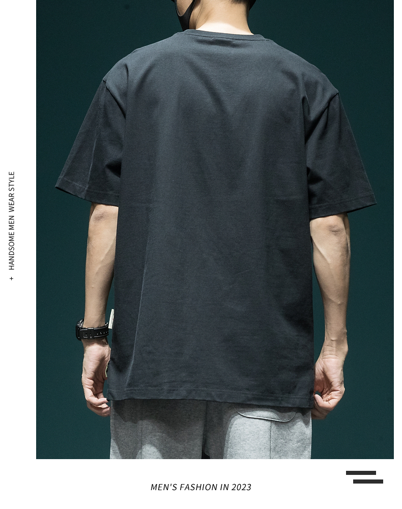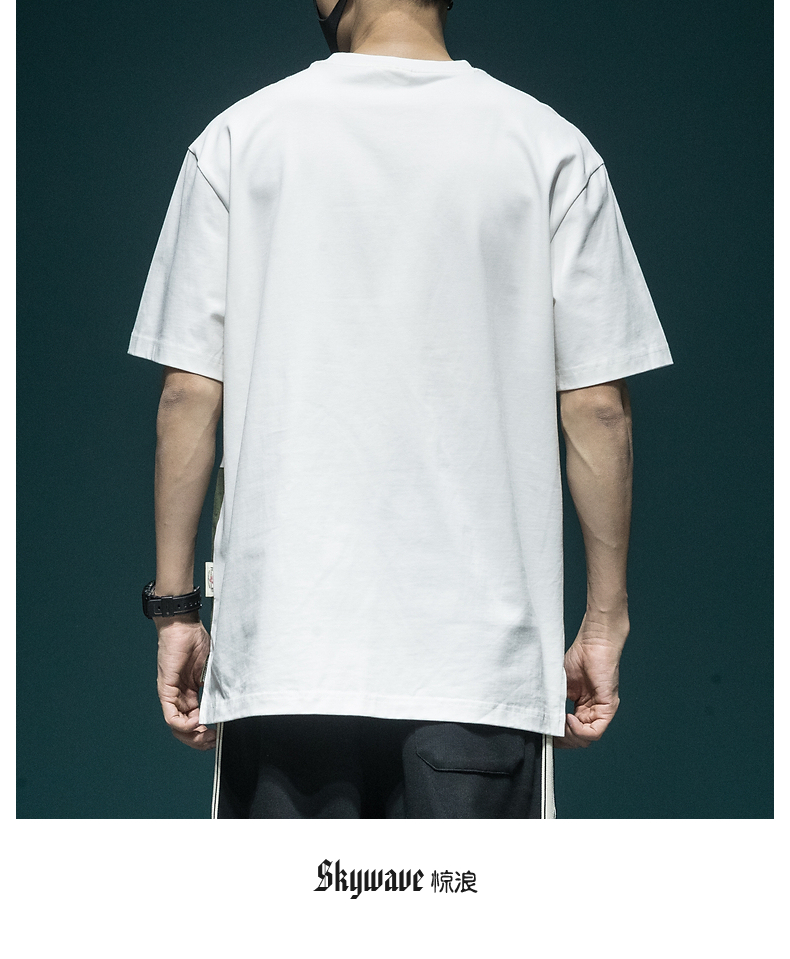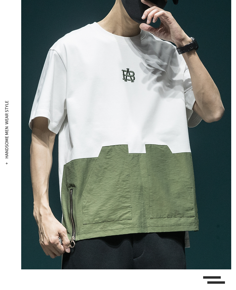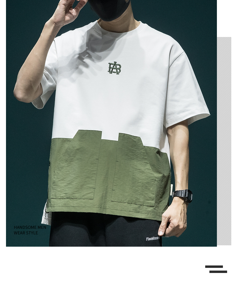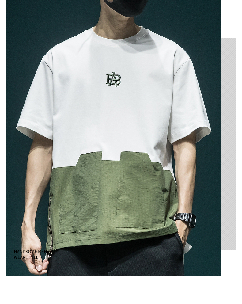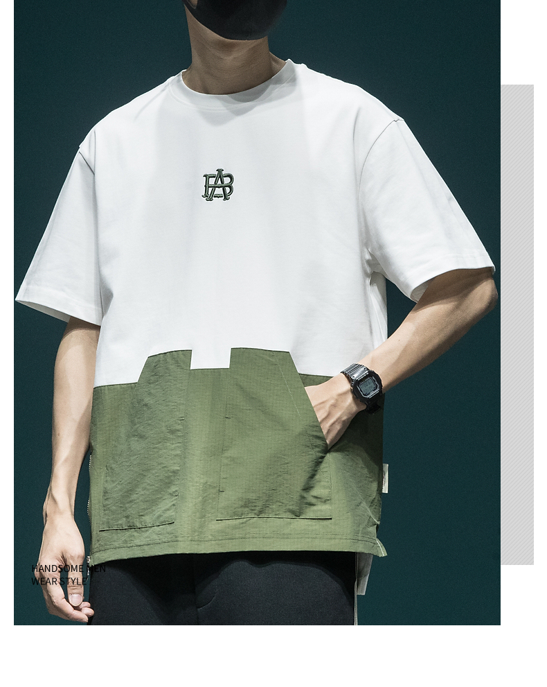 撞色拼接設計感工裝短袖男日系復古寬鬆大尺碼胖子口袋休閒圓領T恤