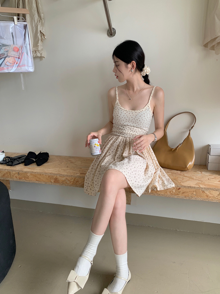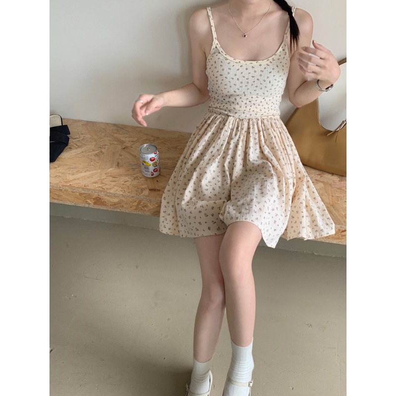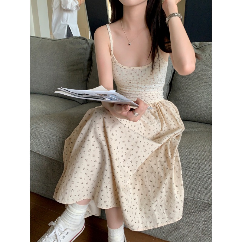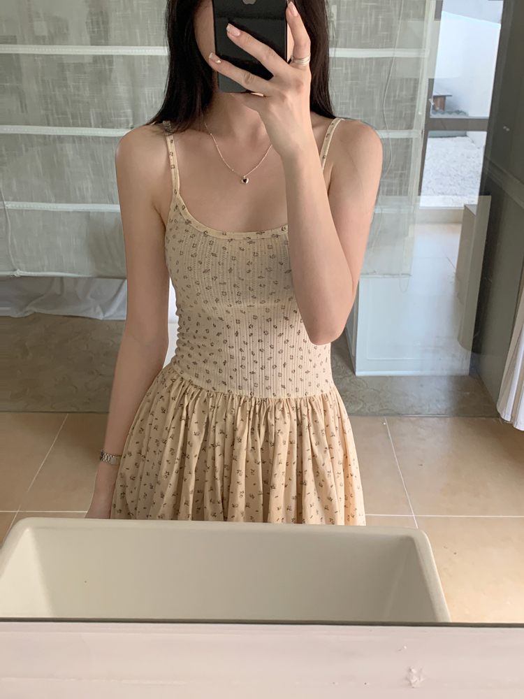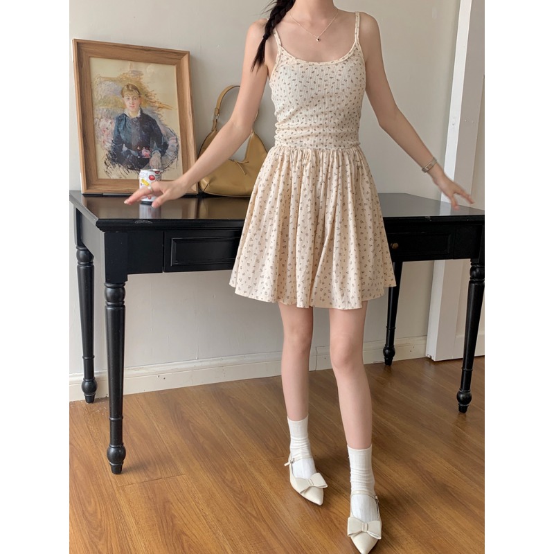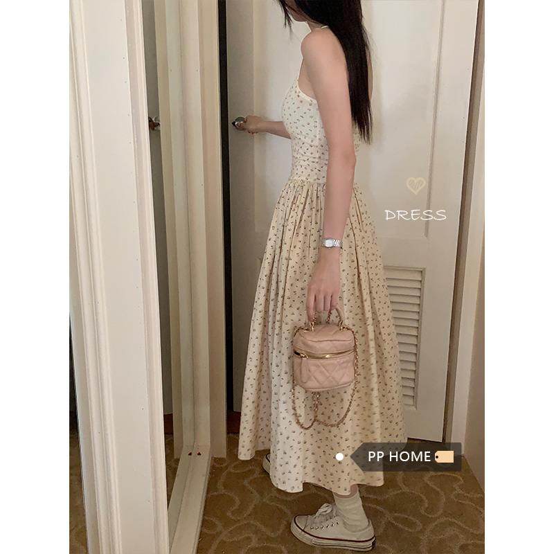 PPHOME甜美氣質~夏日法式低領碎花設計感收腰顯瘦無袖吊帶洋裝