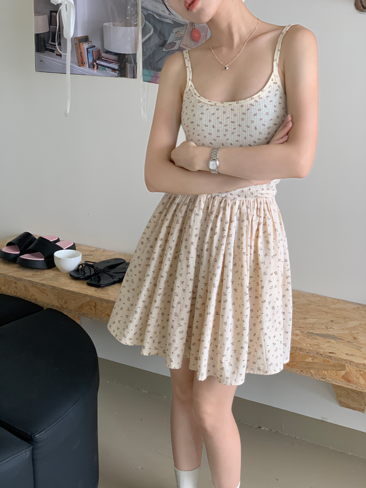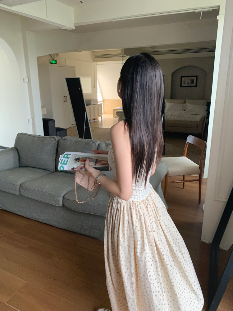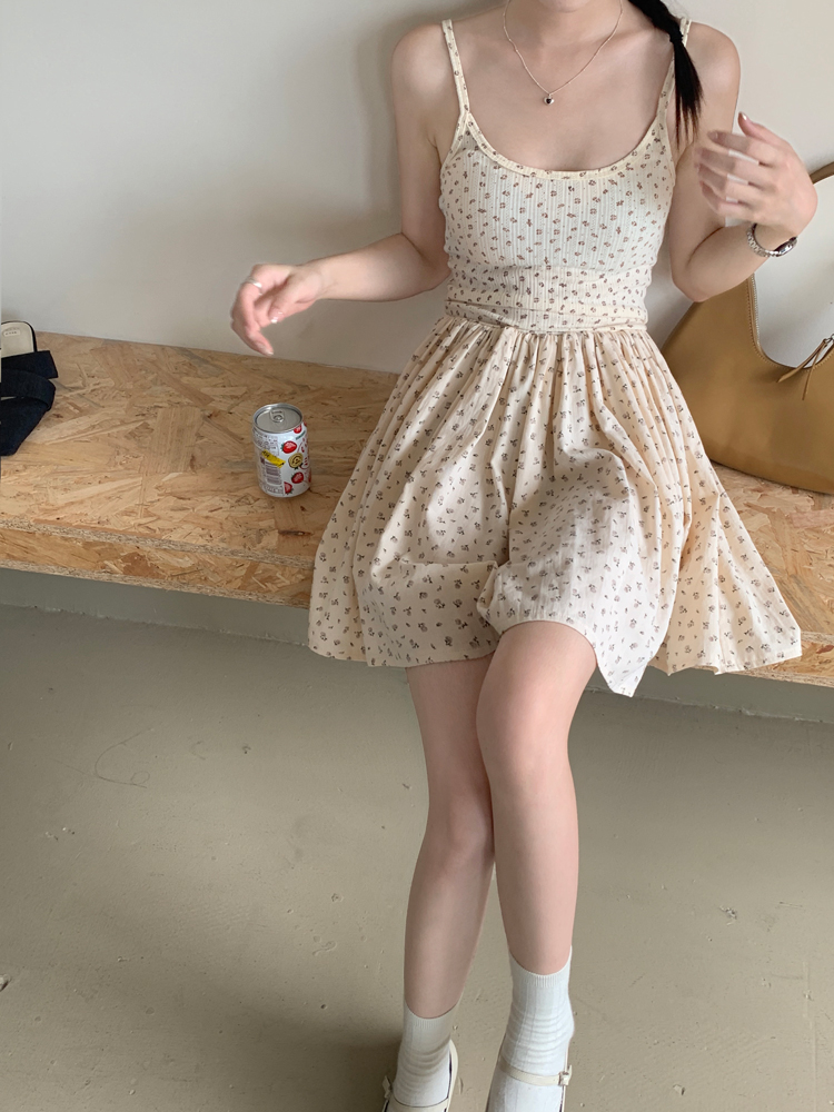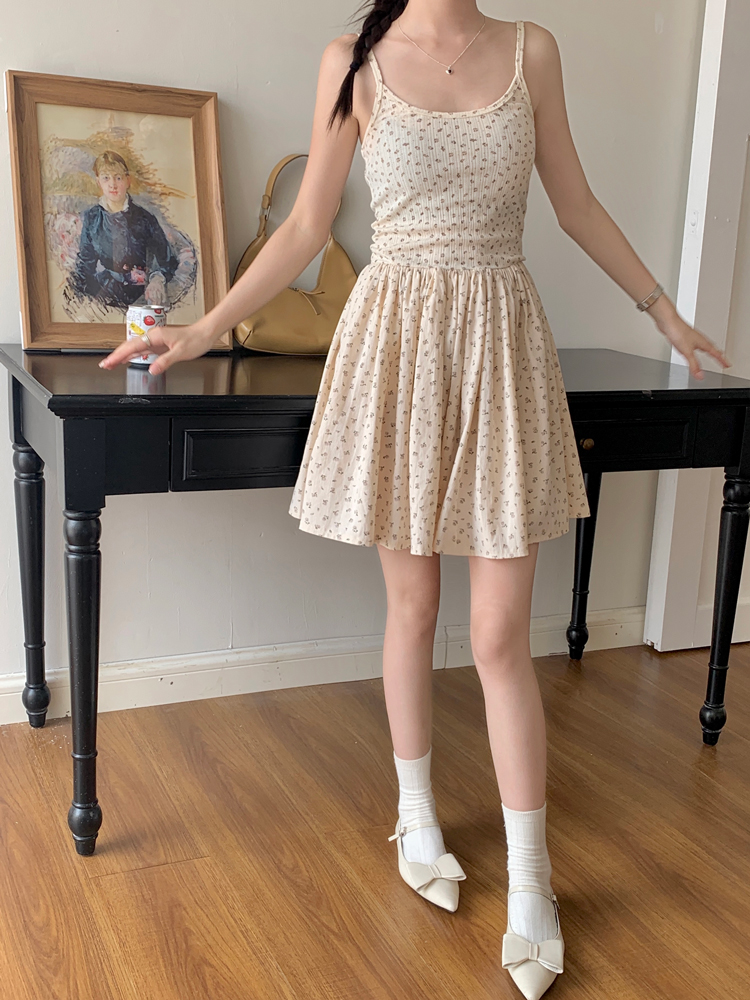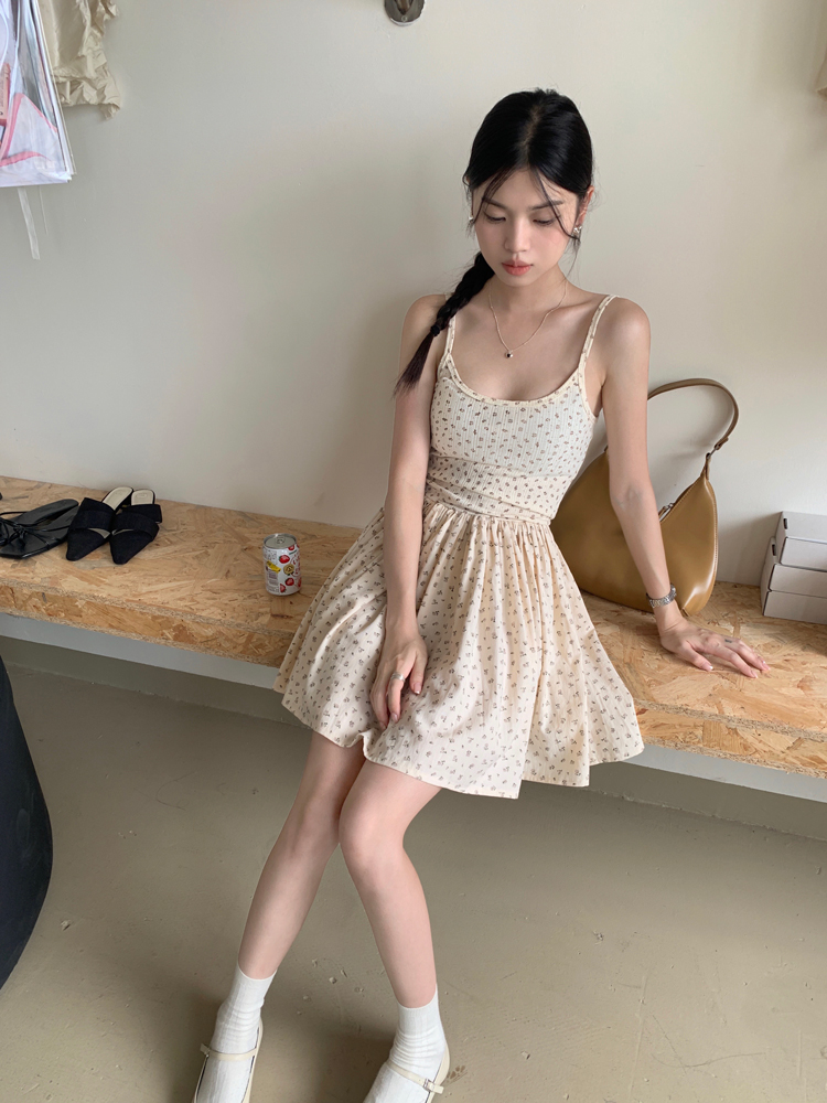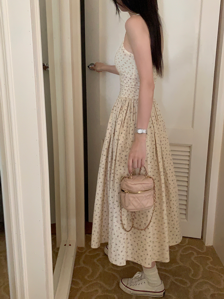PPHOME甜美氣質~夏日法式低領碎花設計感收腰顯瘦無袖吊帶洋裝