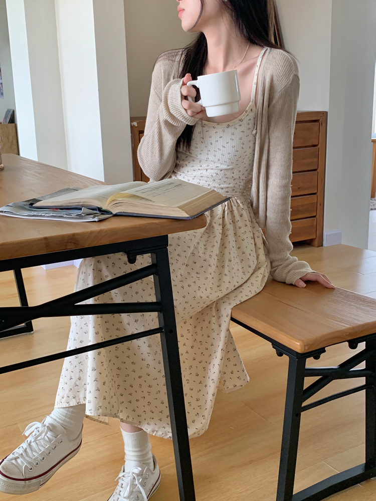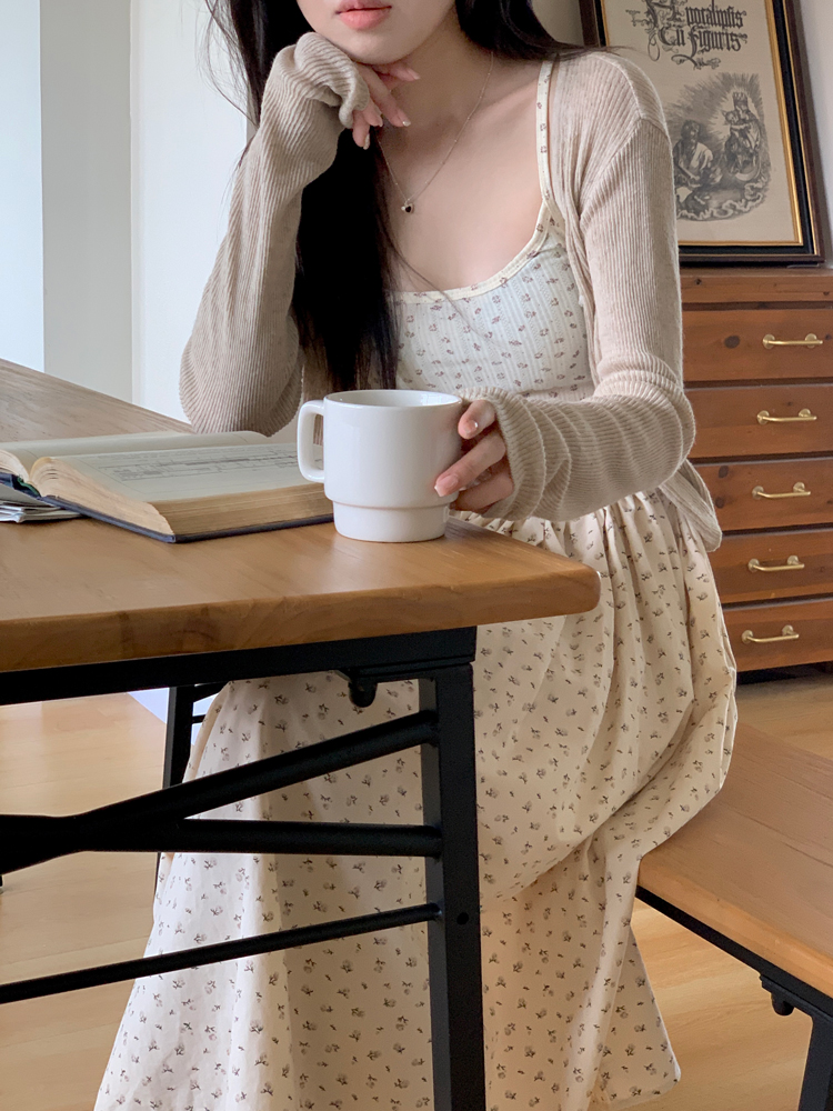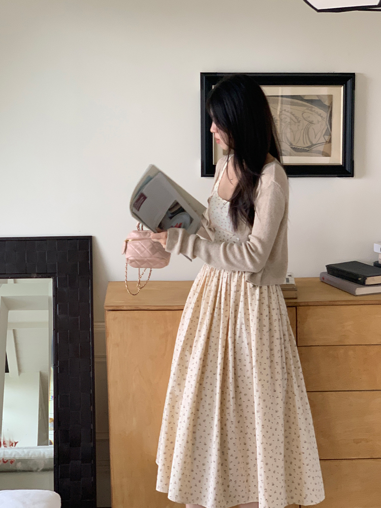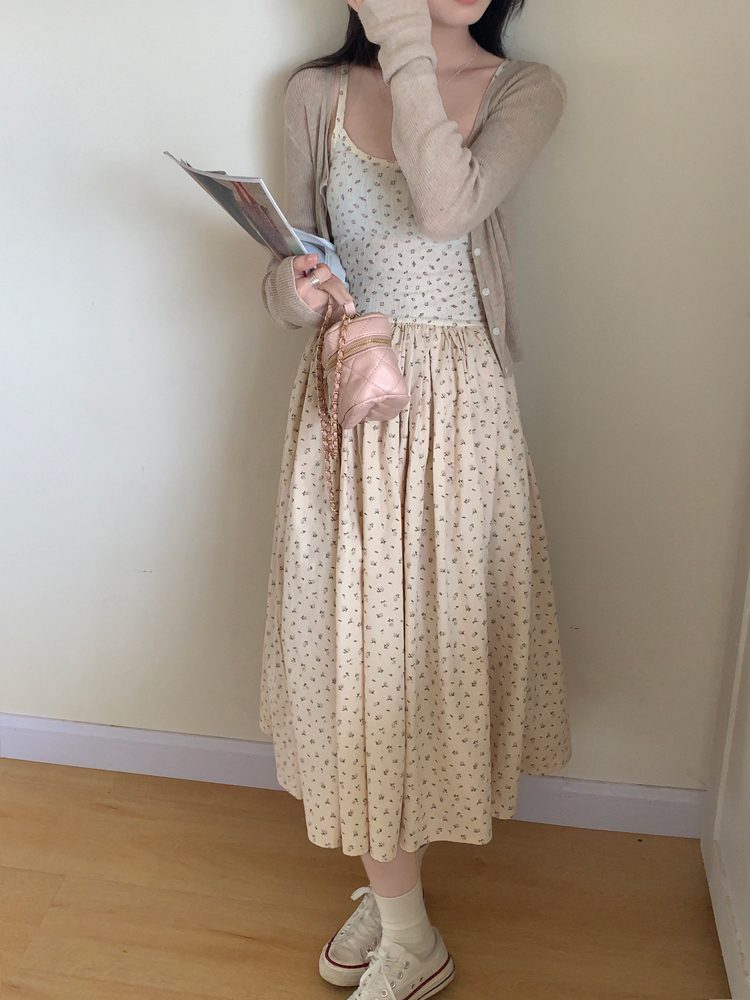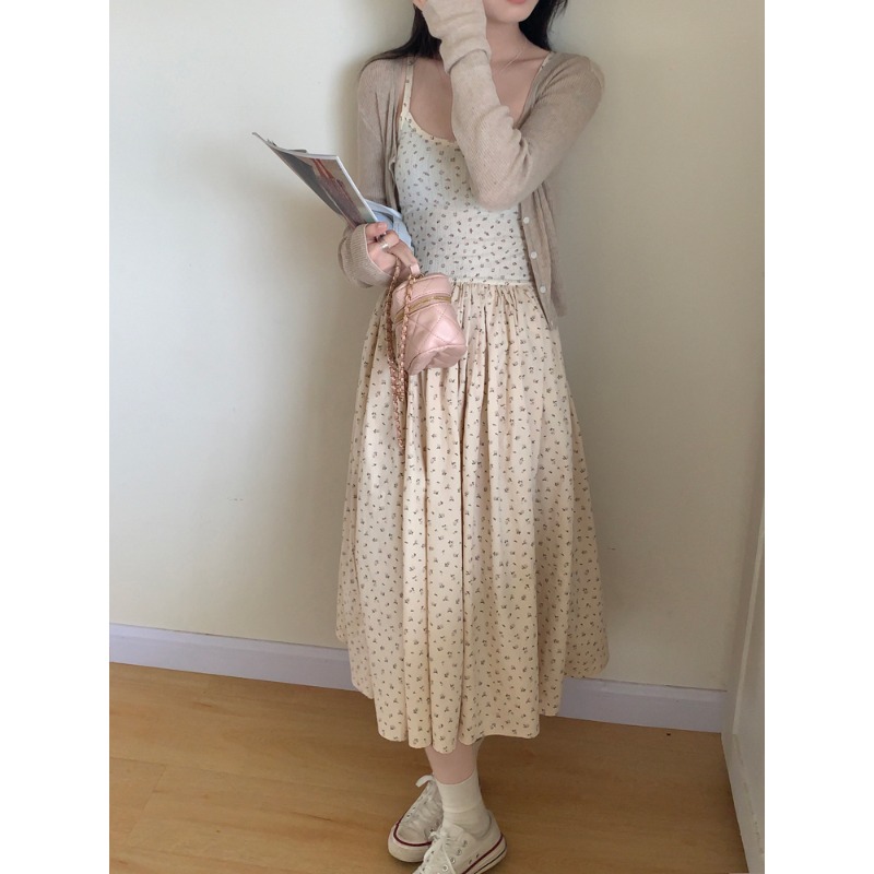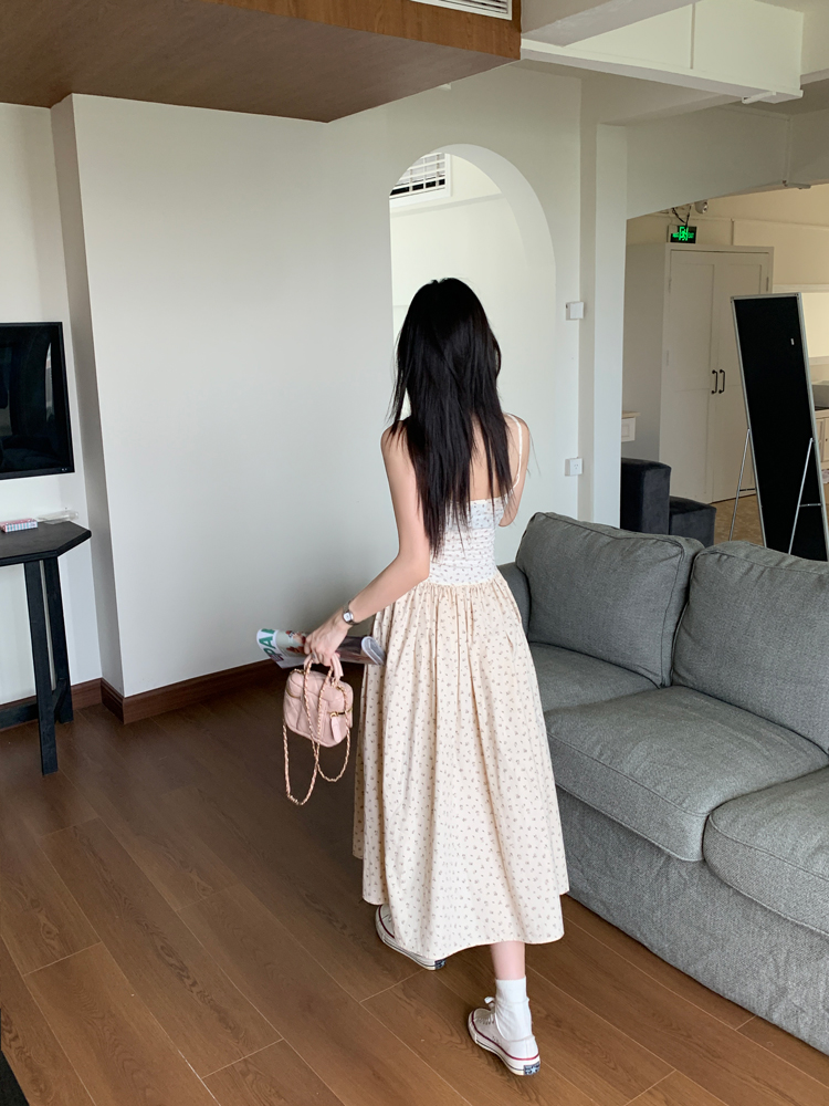 PPHOME甜美氣質~夏日法式低領碎花設計感收腰顯瘦無袖吊帶洋裝