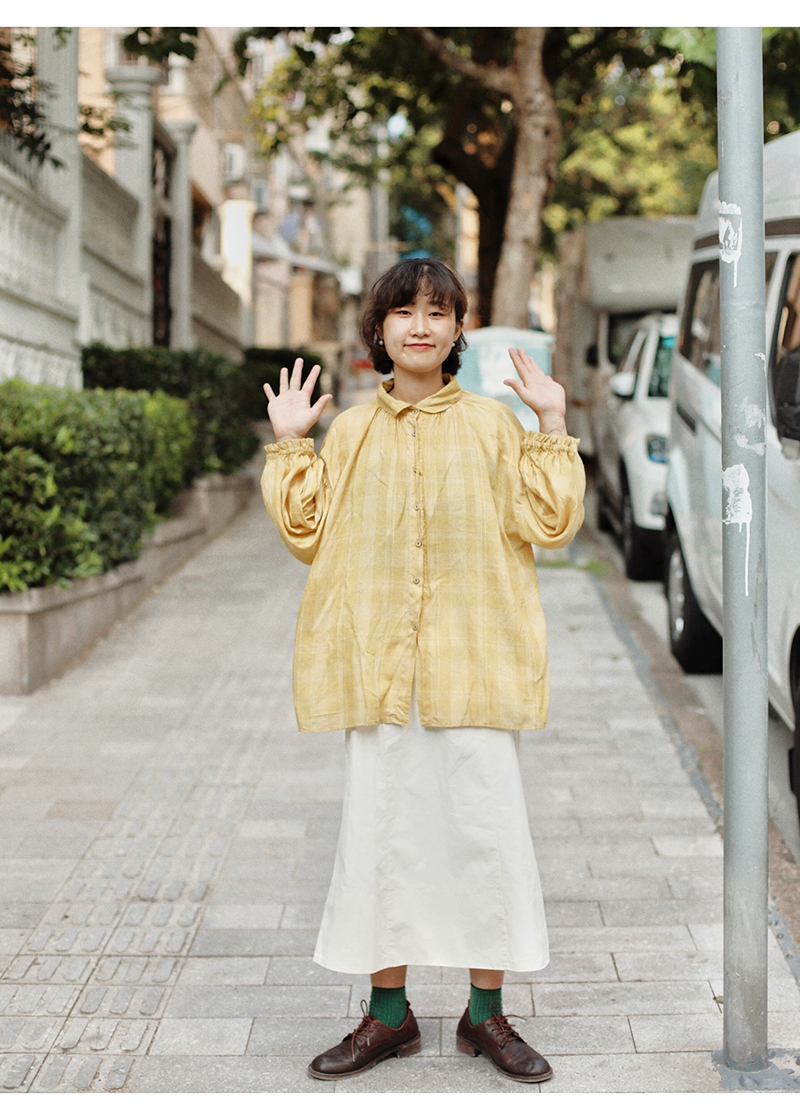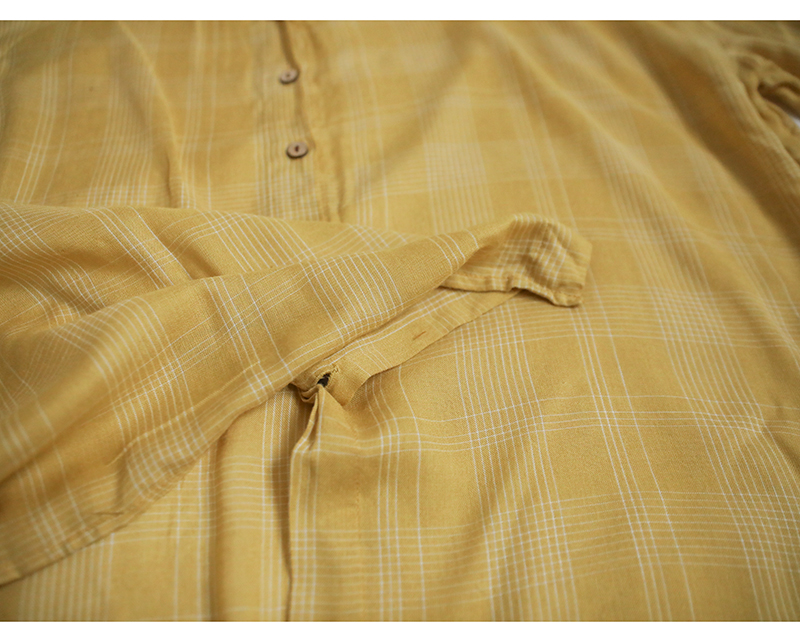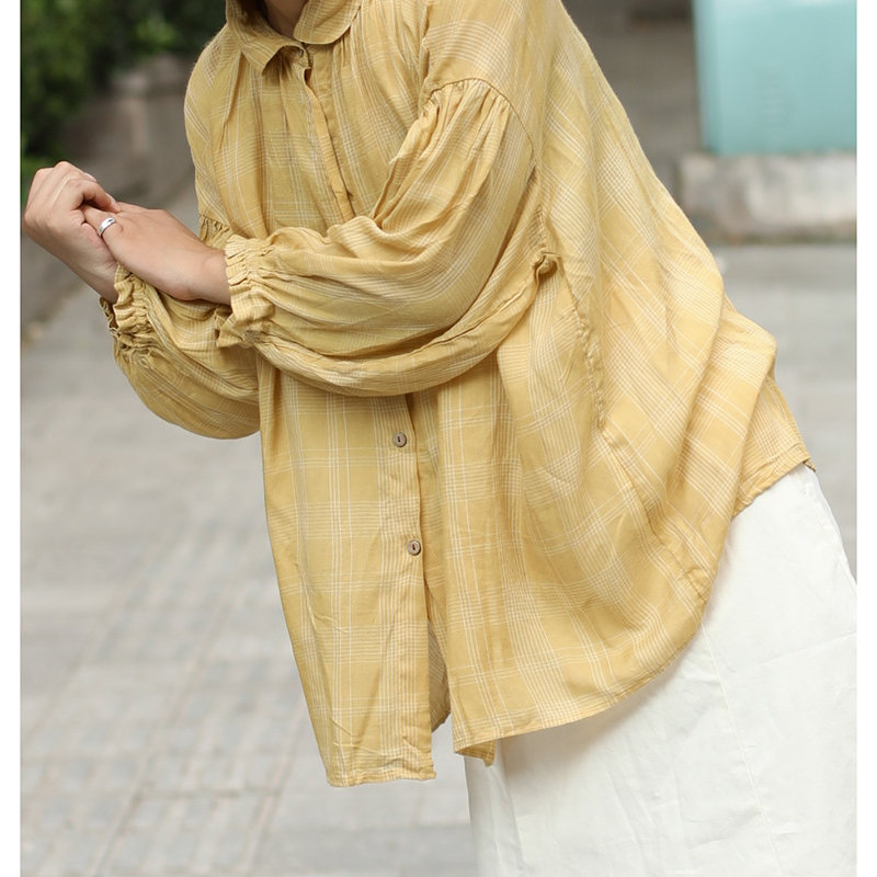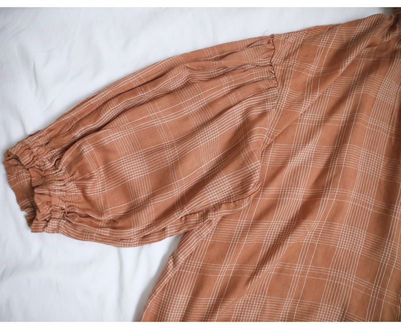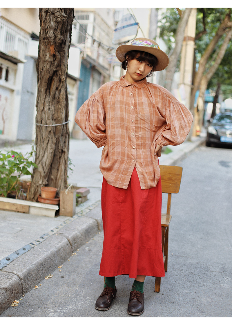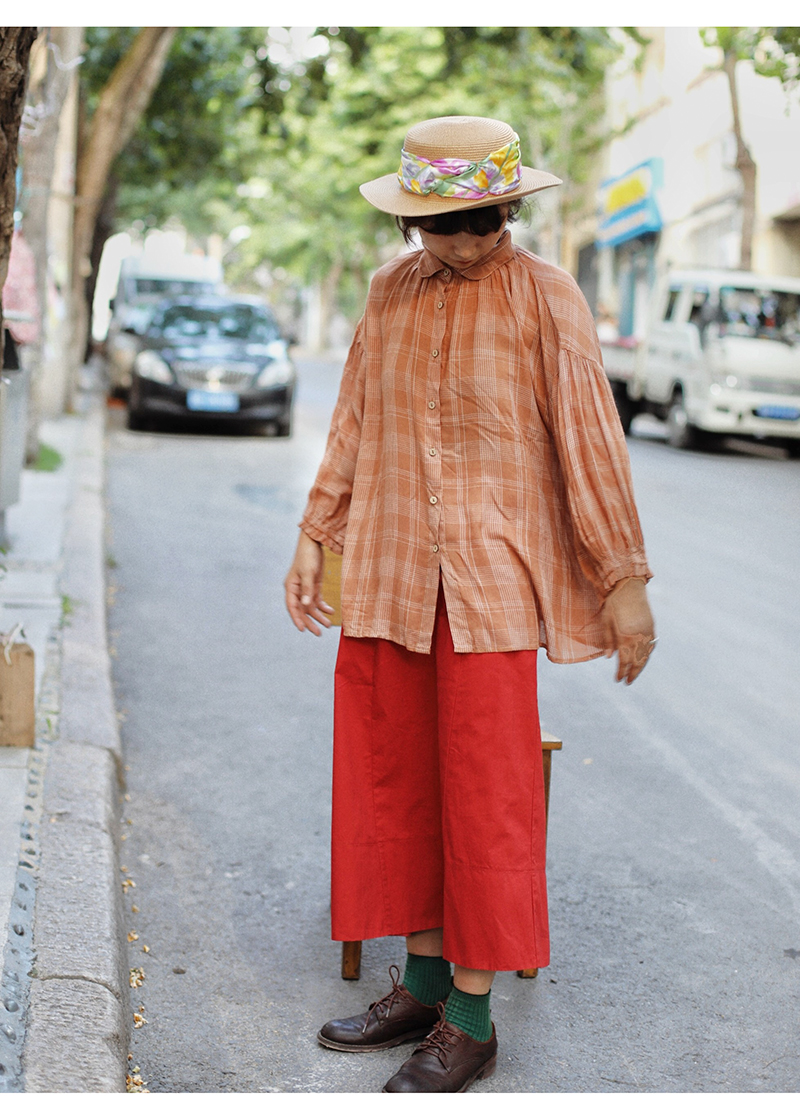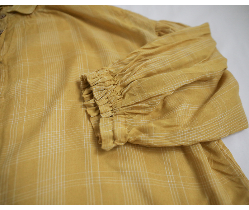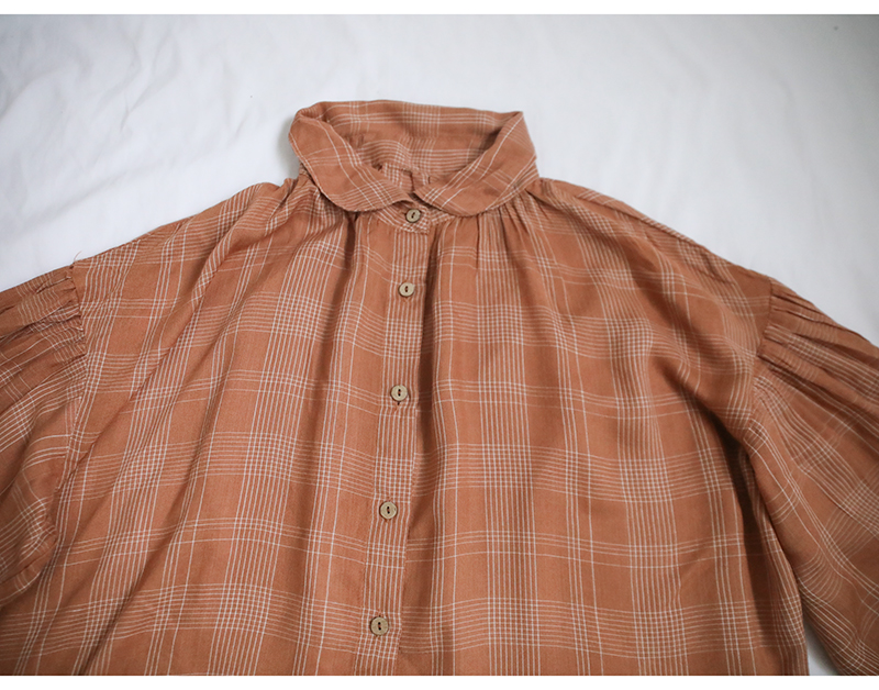 三叔 日單秋款格子襯衫長袖寬鬆復古亞麻上衣柔軟大袖子設計