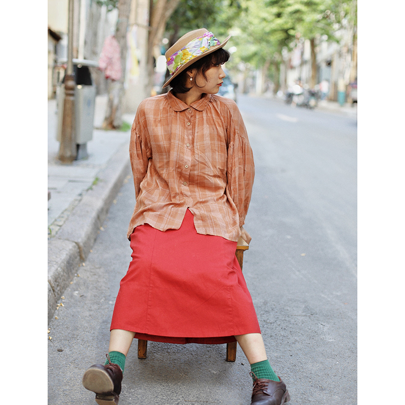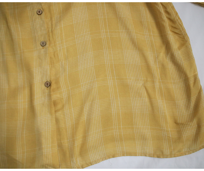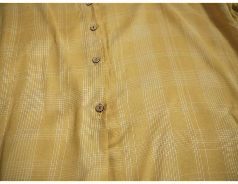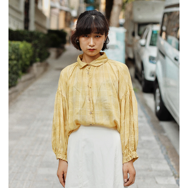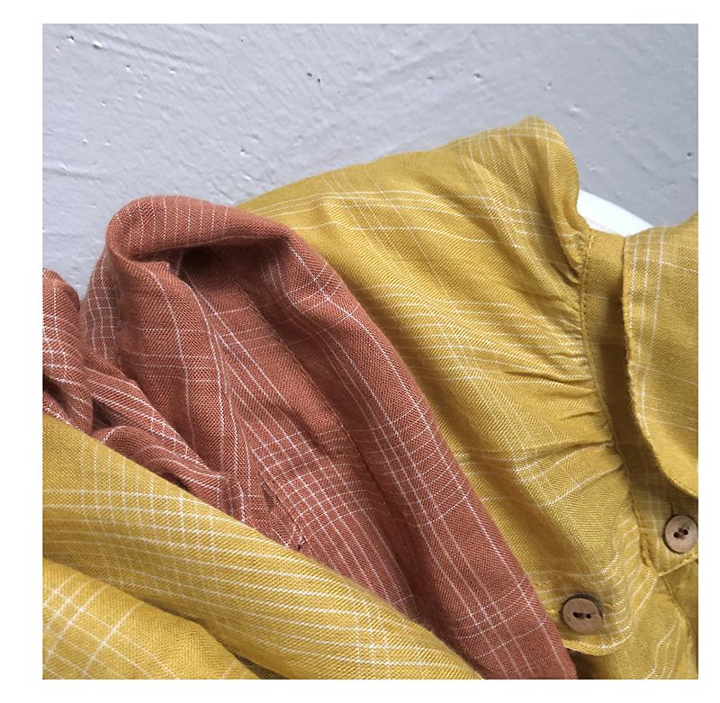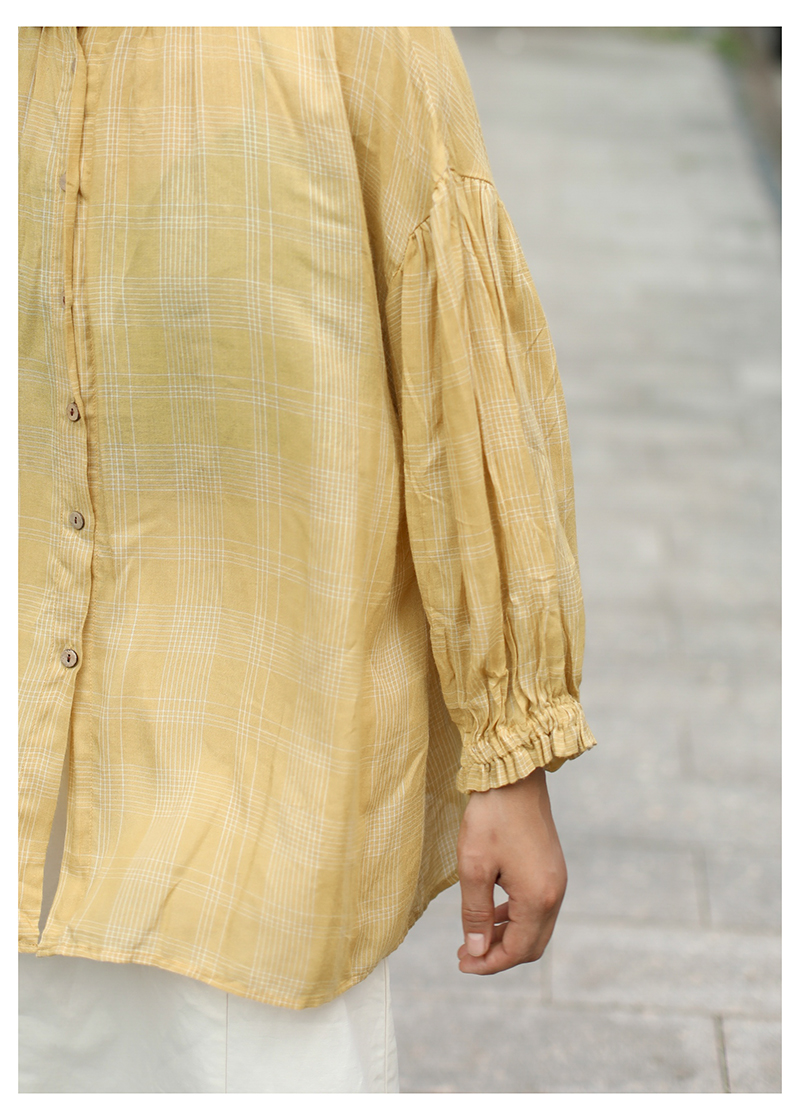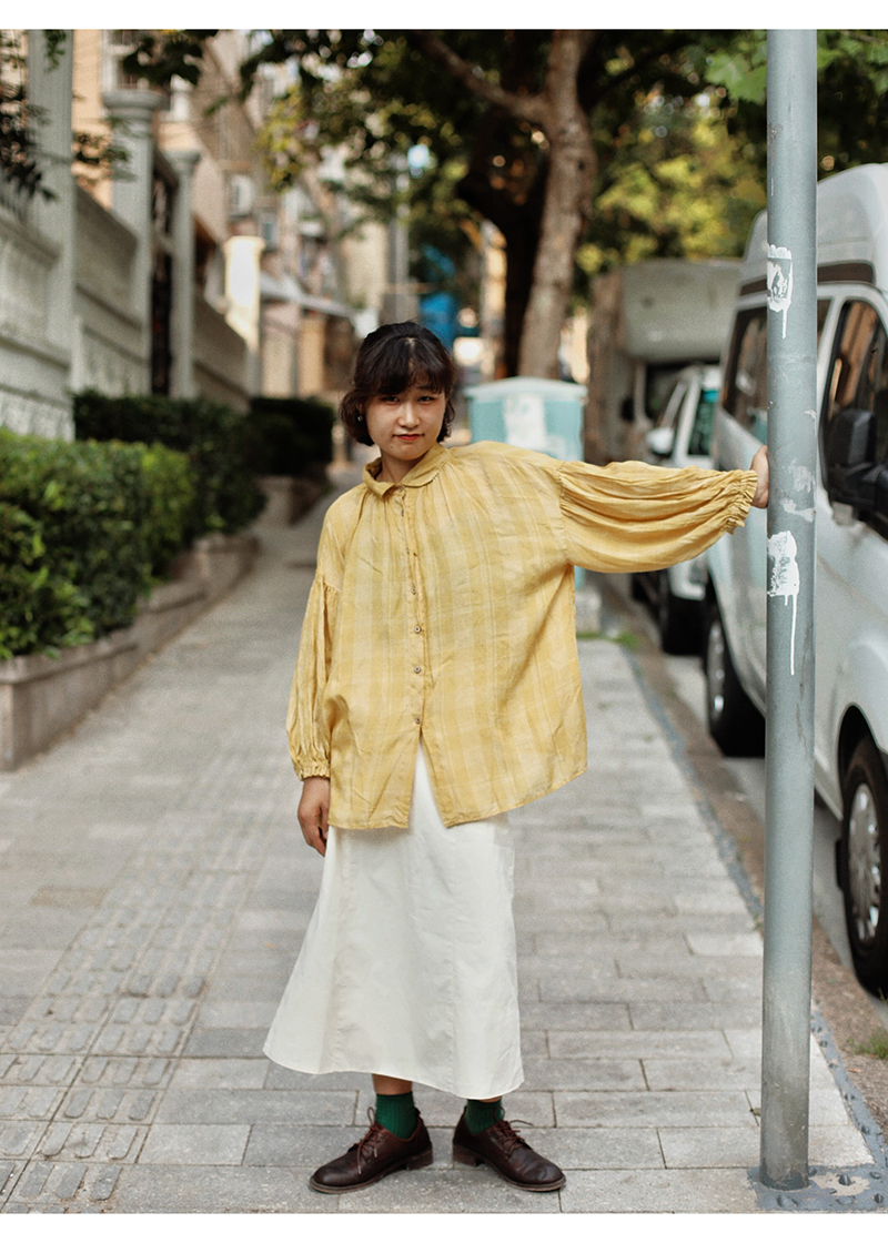 三叔 日單秋款格子襯衫長袖寬鬆復古亞麻上衣柔軟大袖子設計
