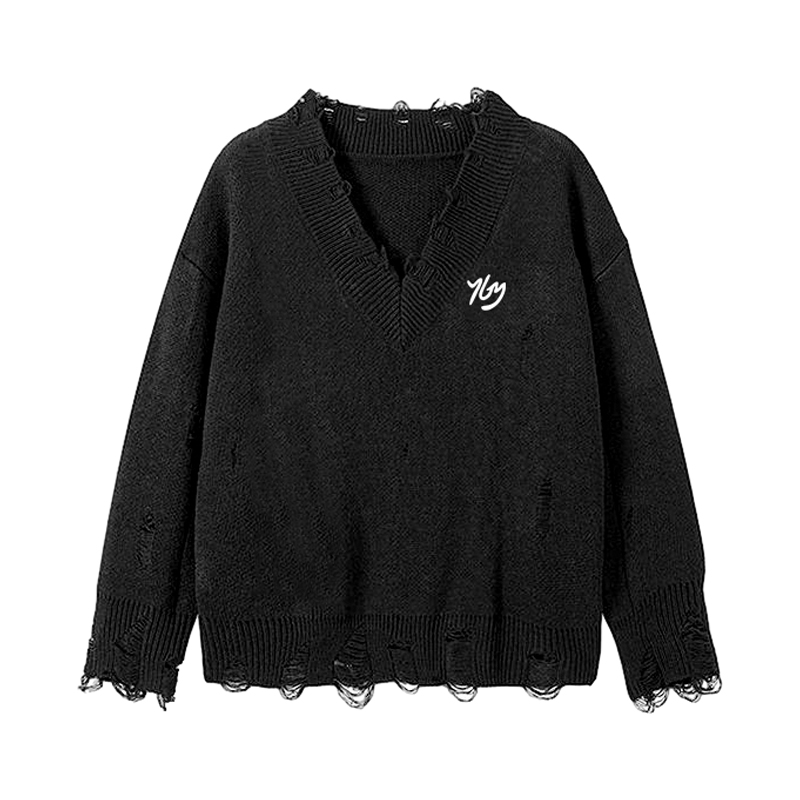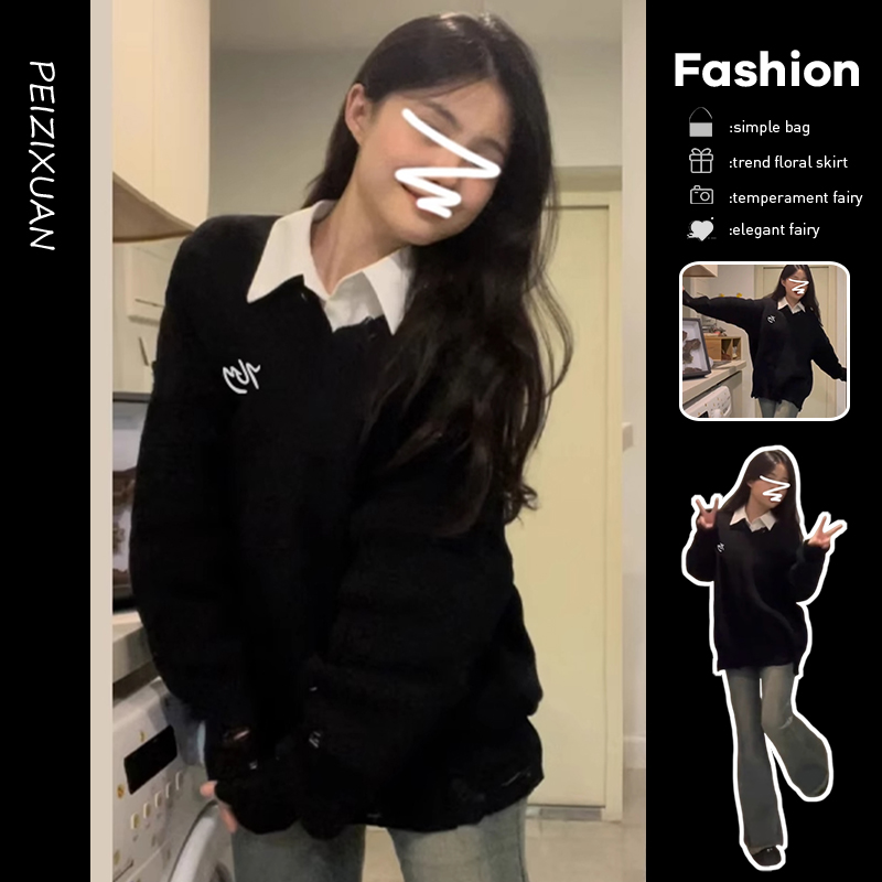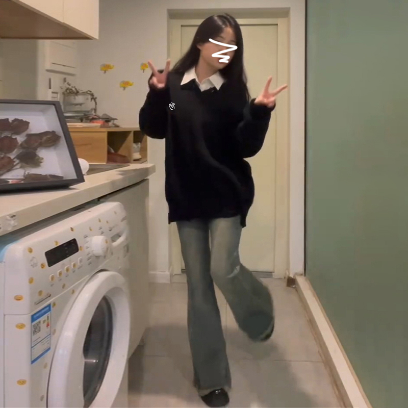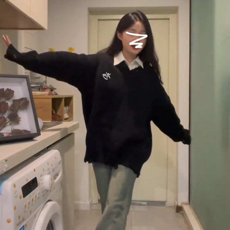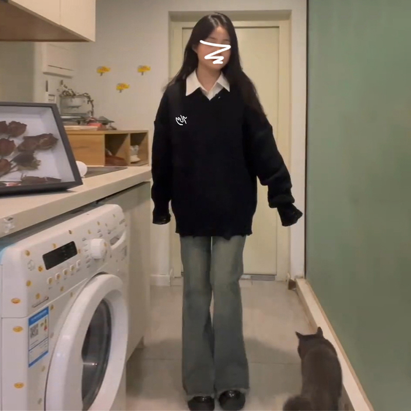 慵懶風黑色針織V領毛衣女秋冬季2023新款軟糯小個子寬鬆套頭上衣