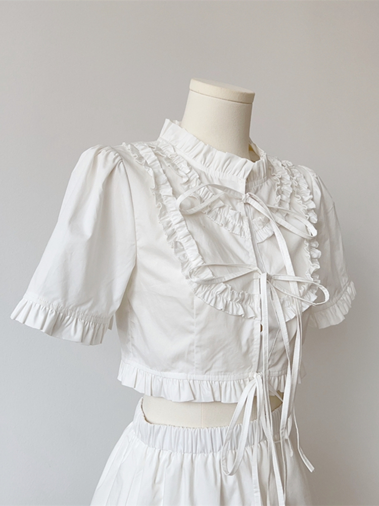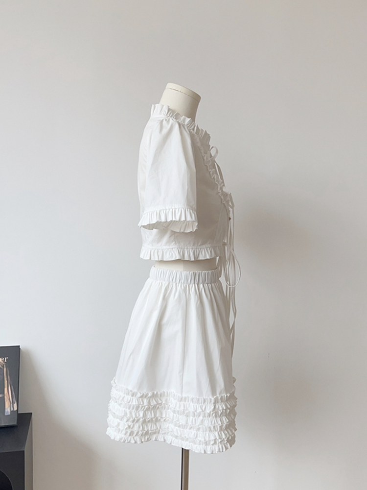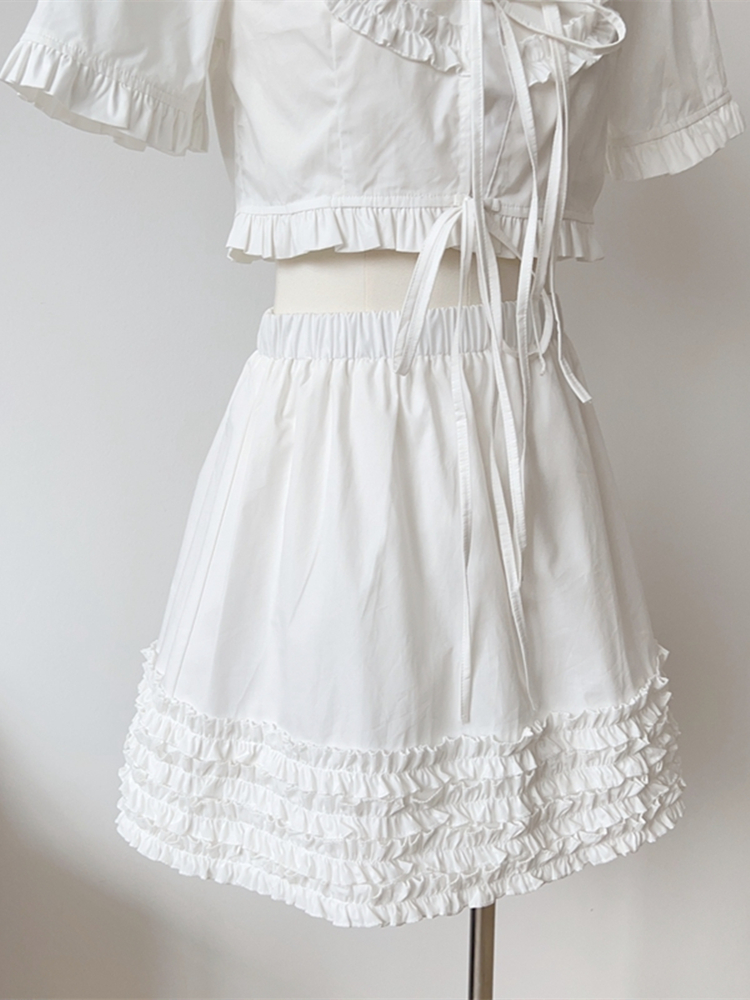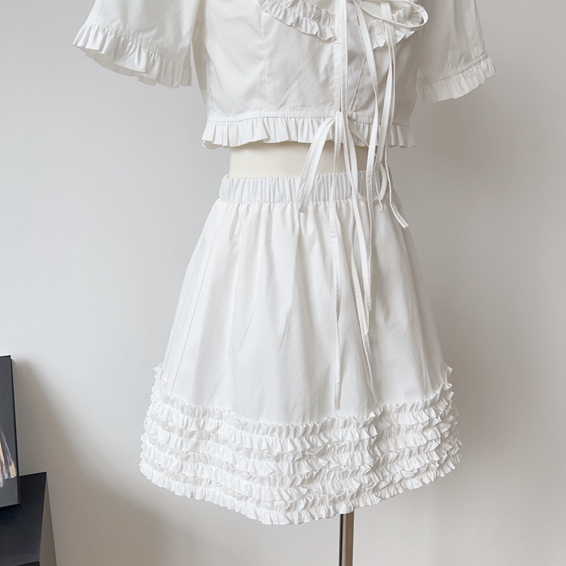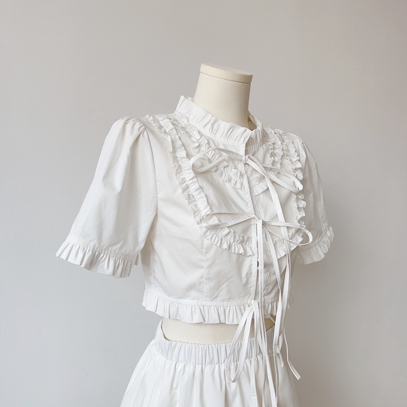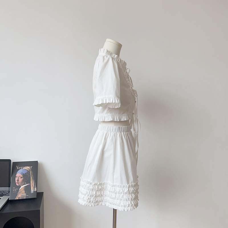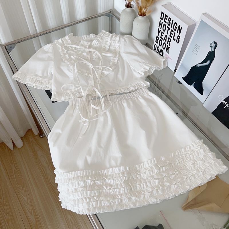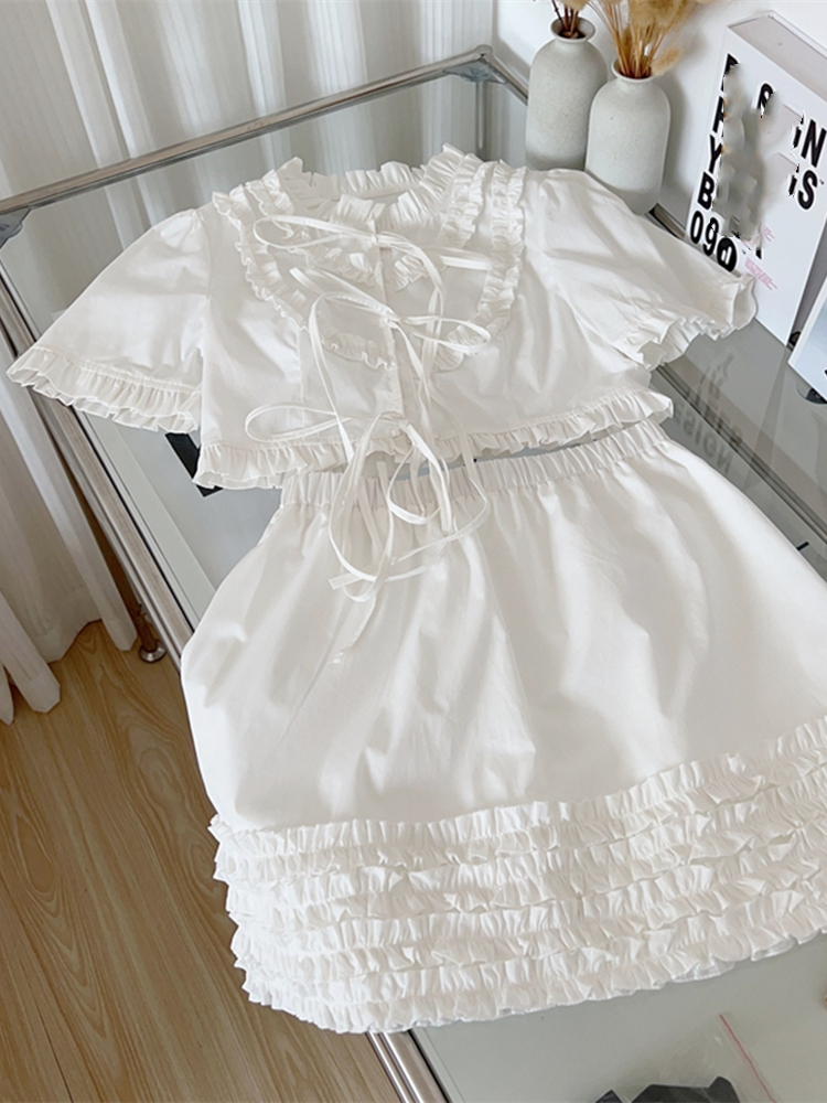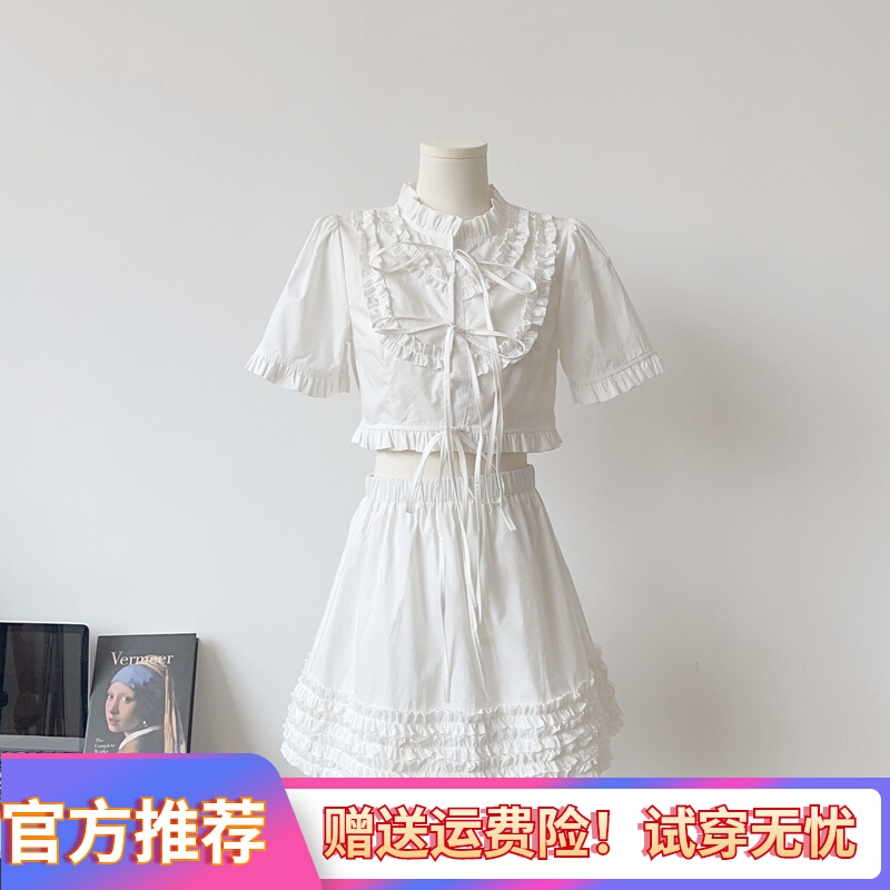 SourceWithU 純白布拉格 小眾法式套裝少女花邊繫帶白色上衣半裙