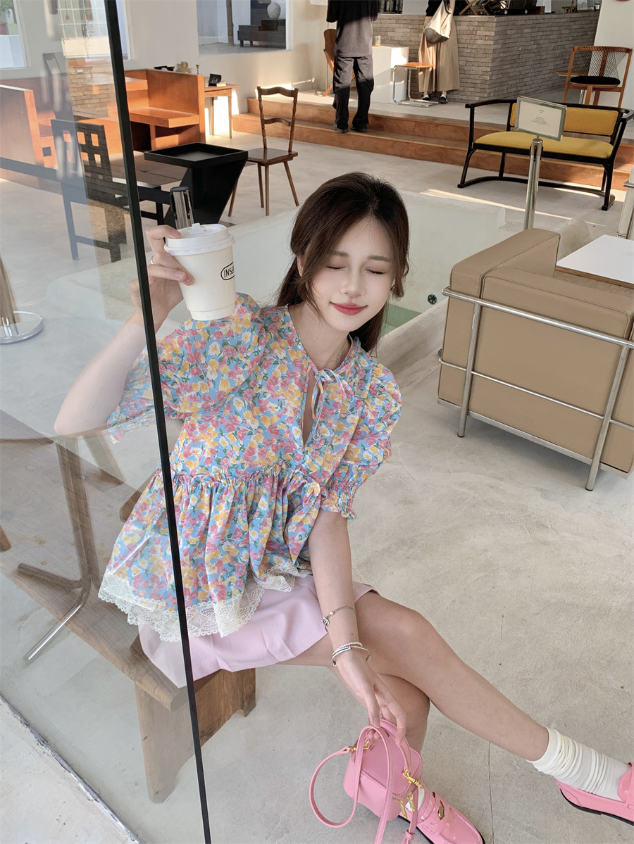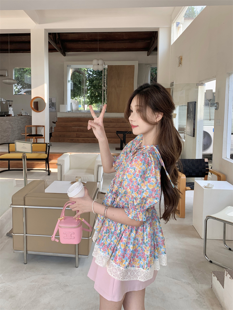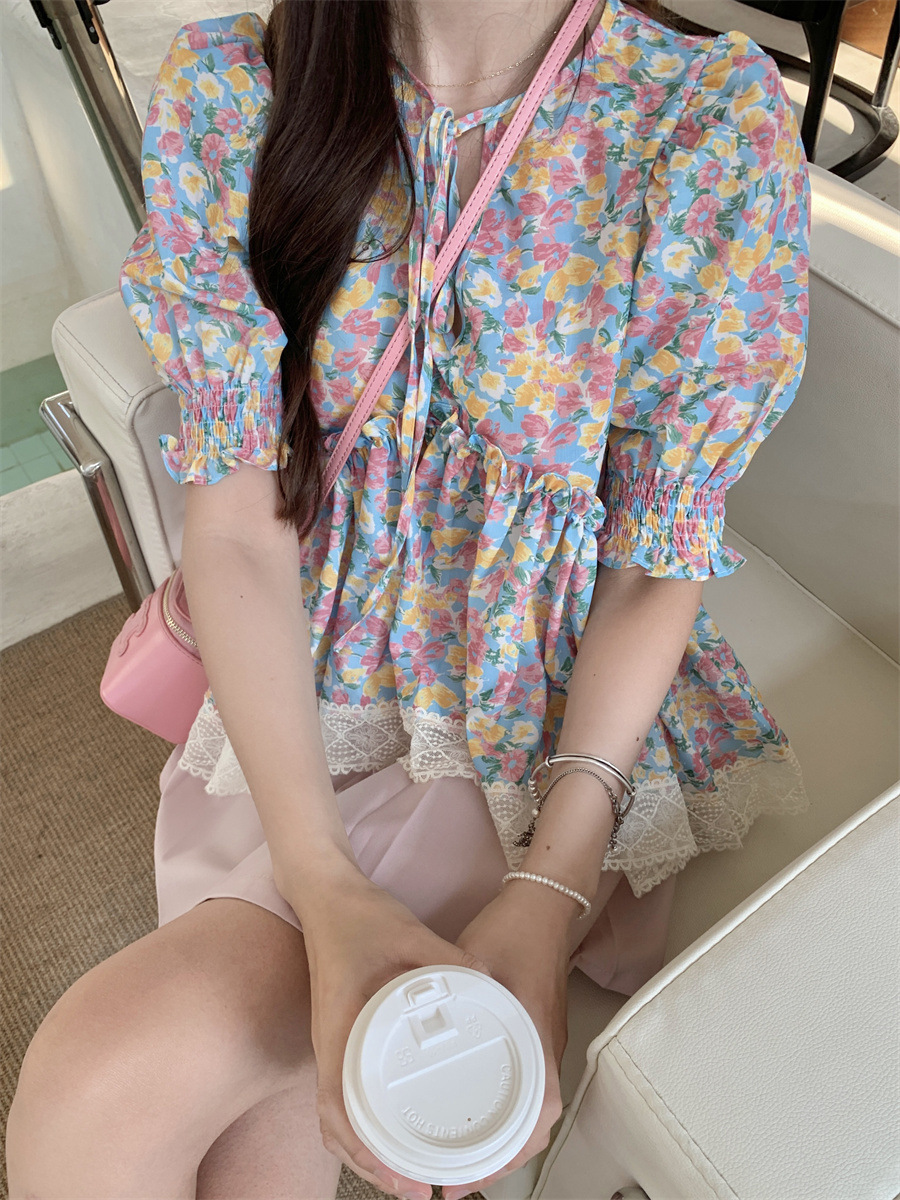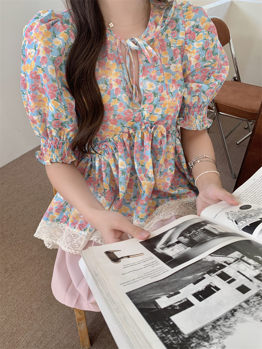 实拍!韩系系带蕾丝花边碎花衬衫减龄复古茶歇小衫女装夏季新款