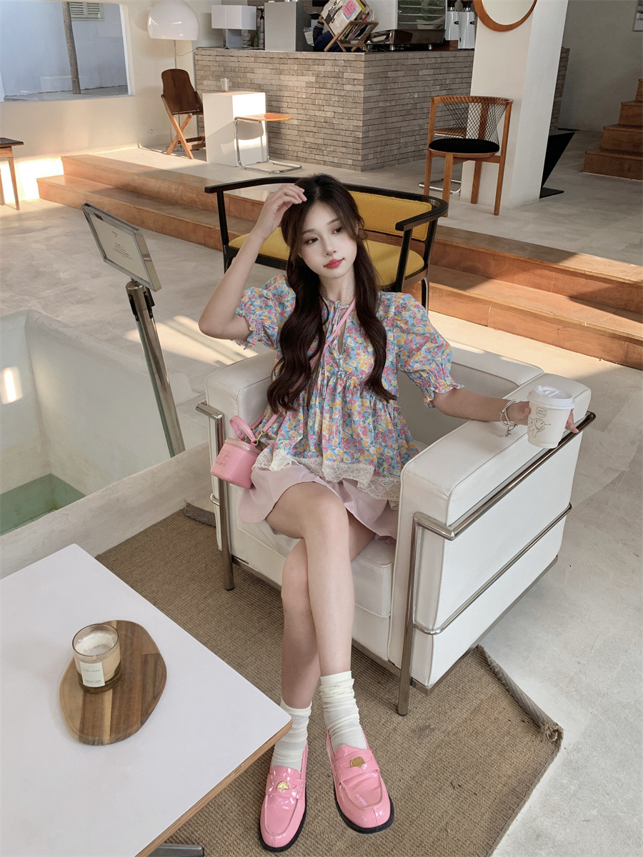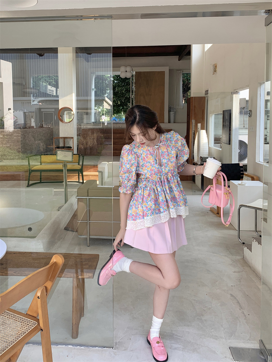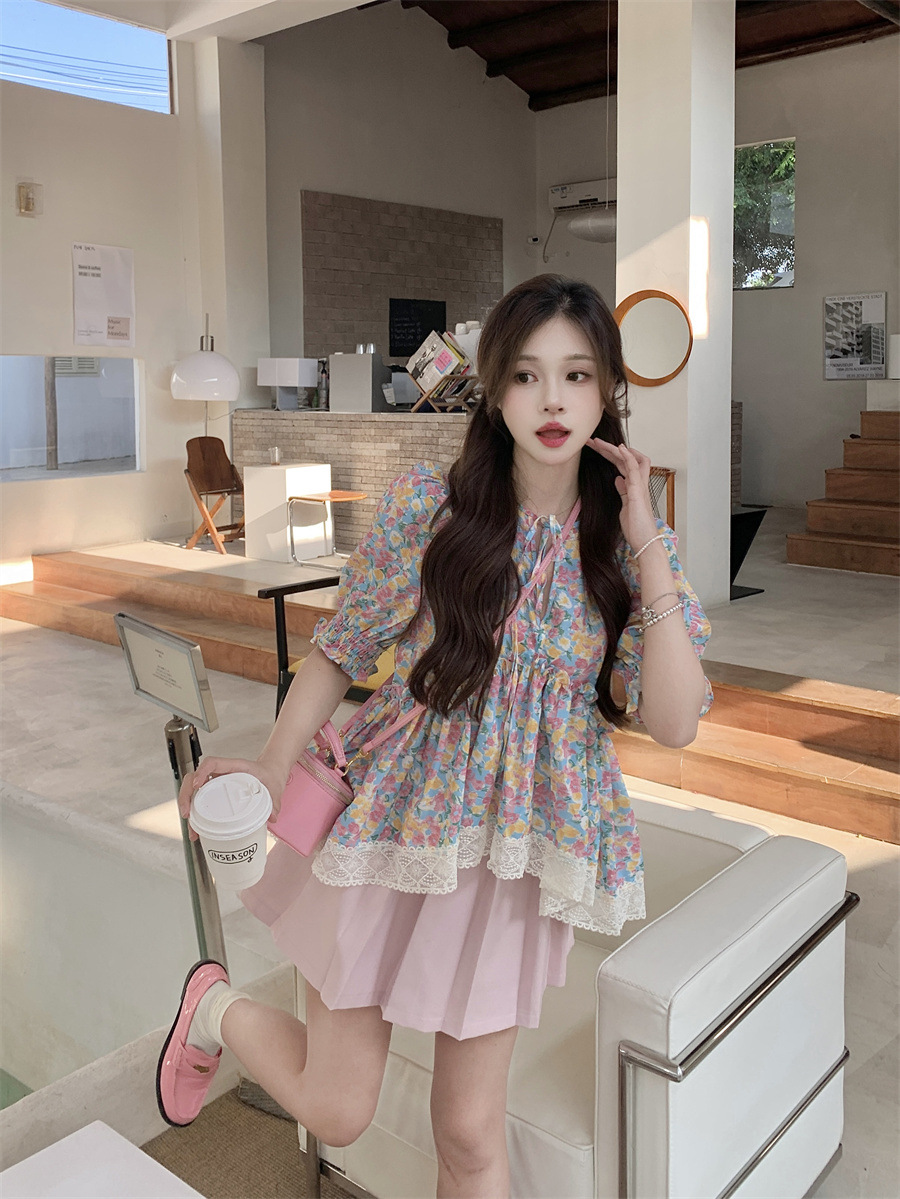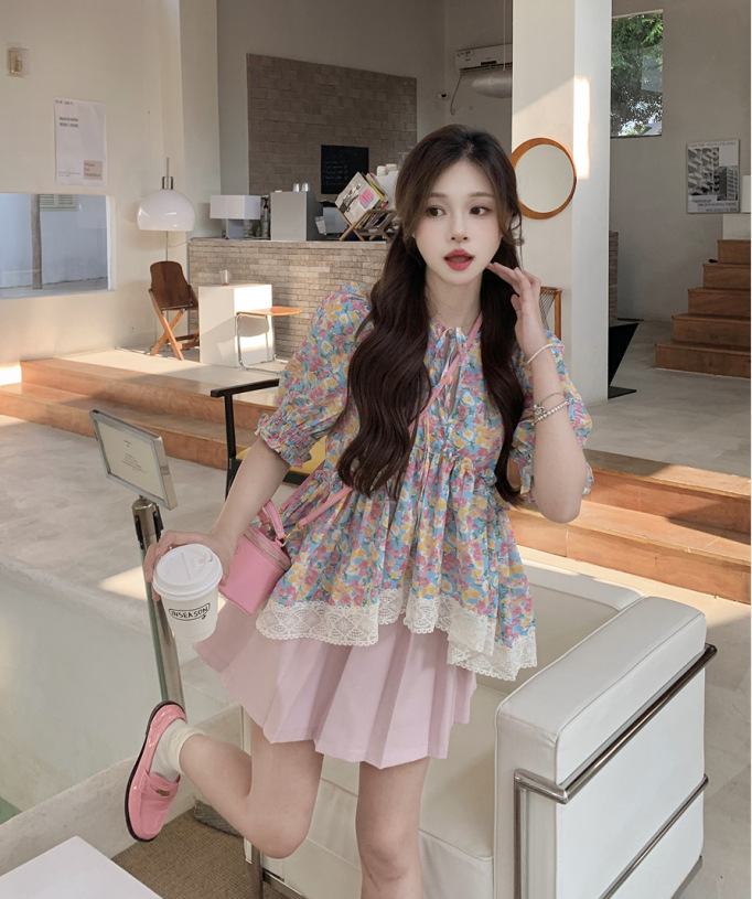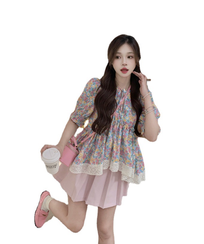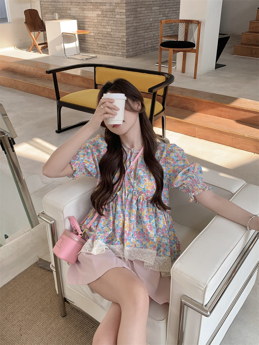 实拍!韩系系带蕾丝花边碎花衬衫减龄复古茶歇小衫女装夏季新款