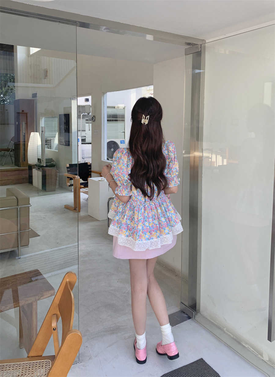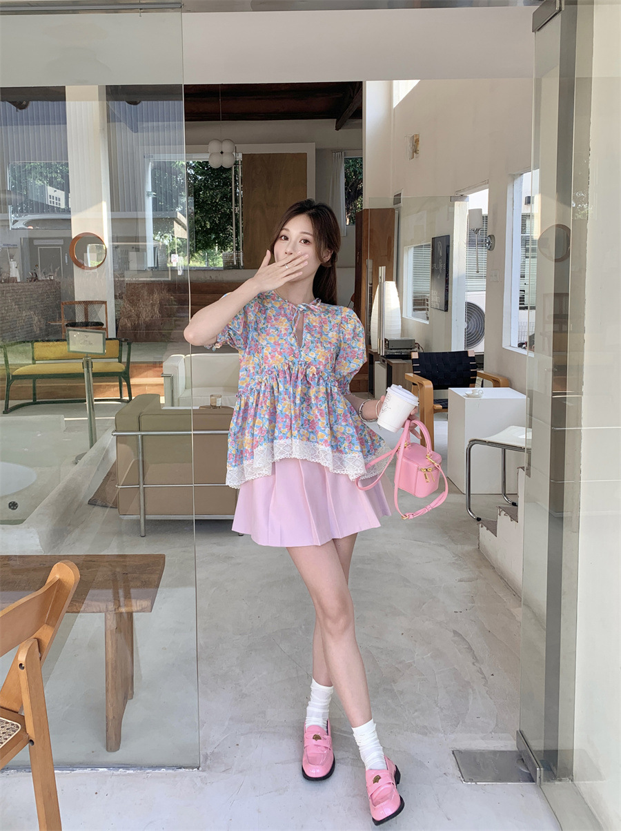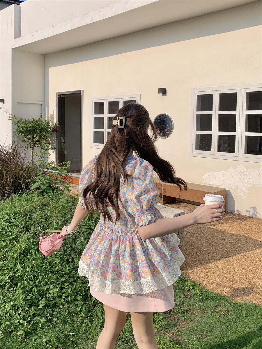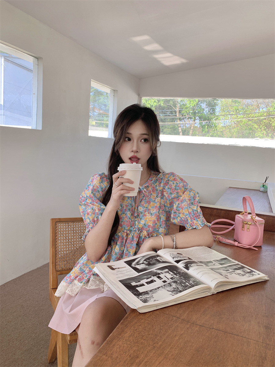 实拍!韩系系带蕾丝花边碎花衬衫减龄复古茶歇小衫女装夏季新款