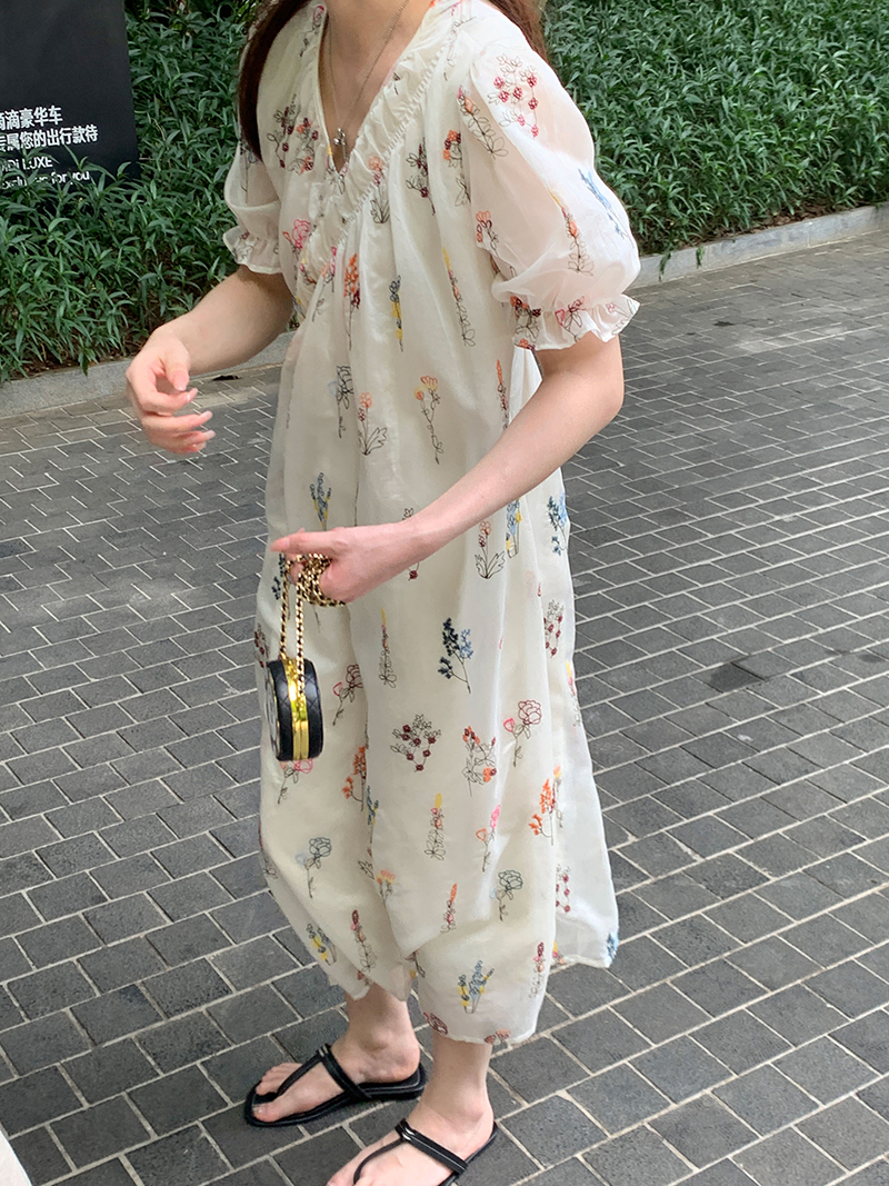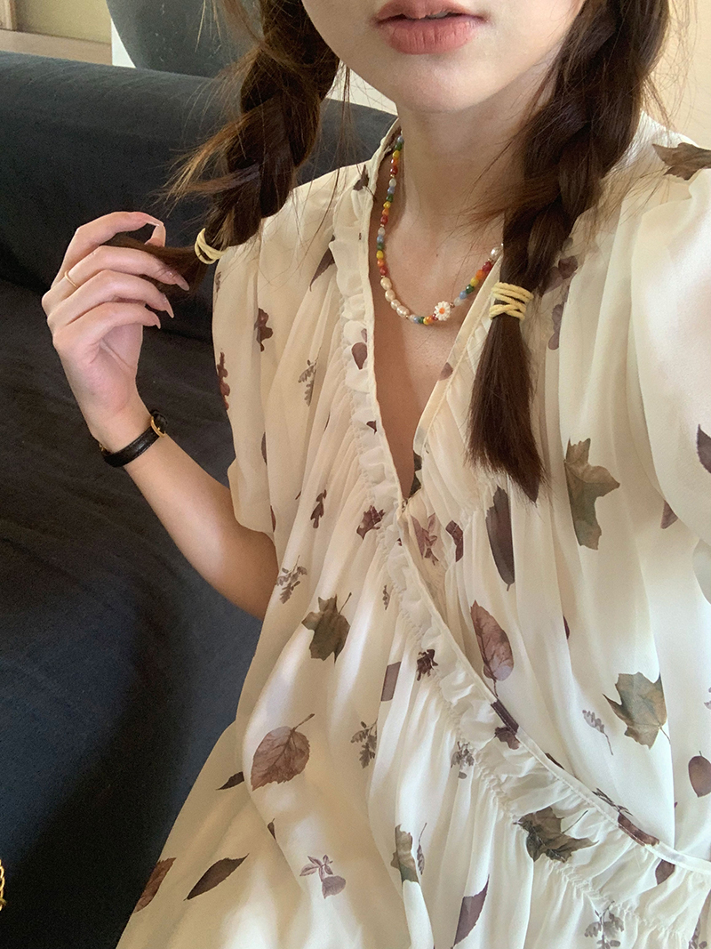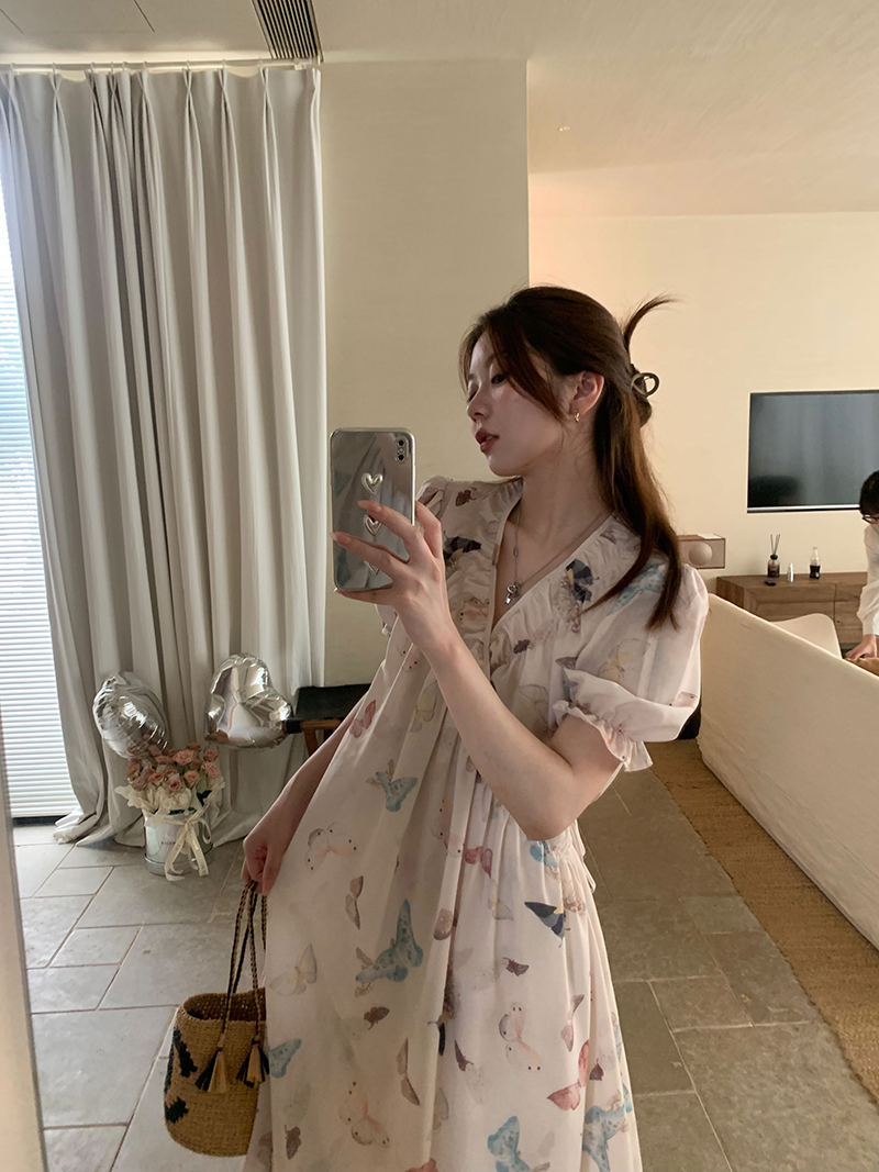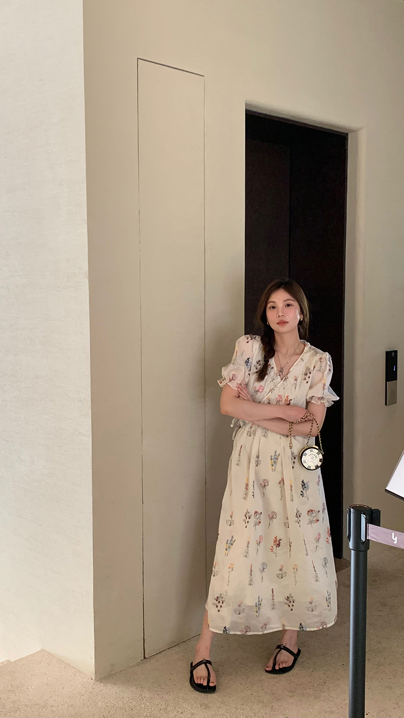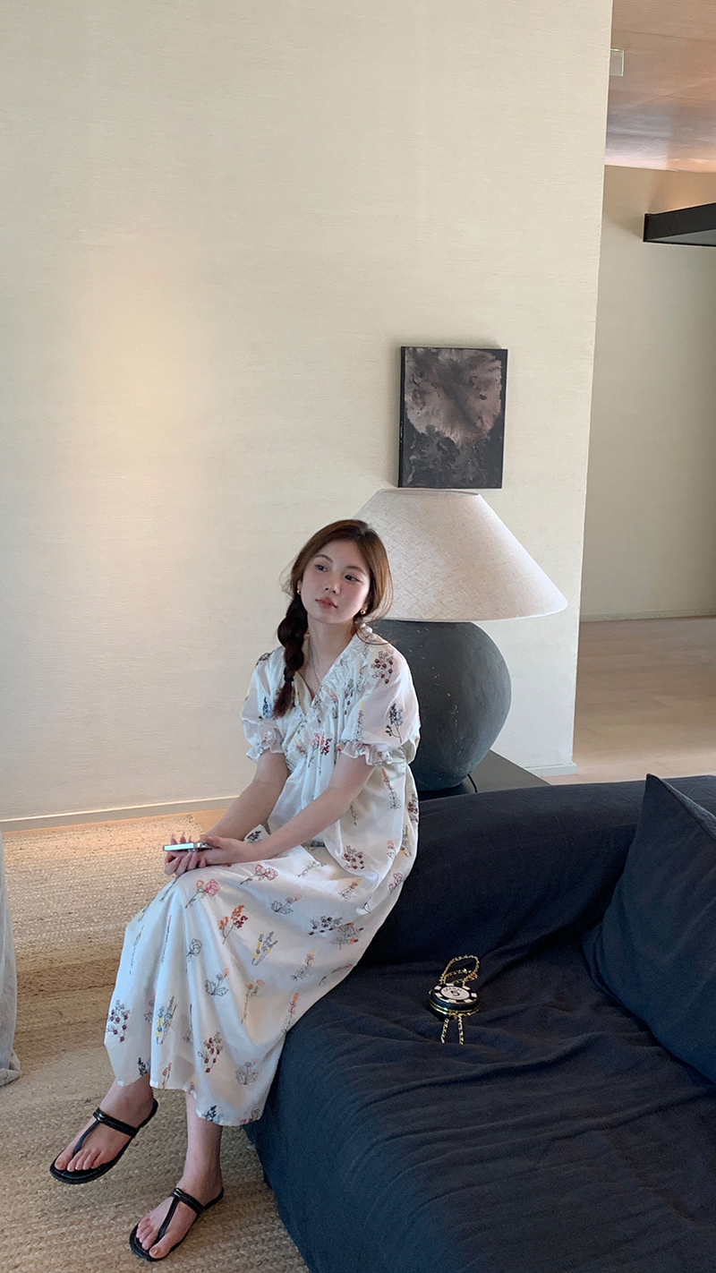 【現貨】im向 cozy鬆弛感三色木耳邊碎花洋裝V領寬鬆燈籠袖裙