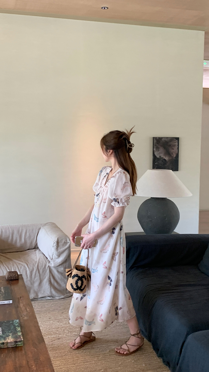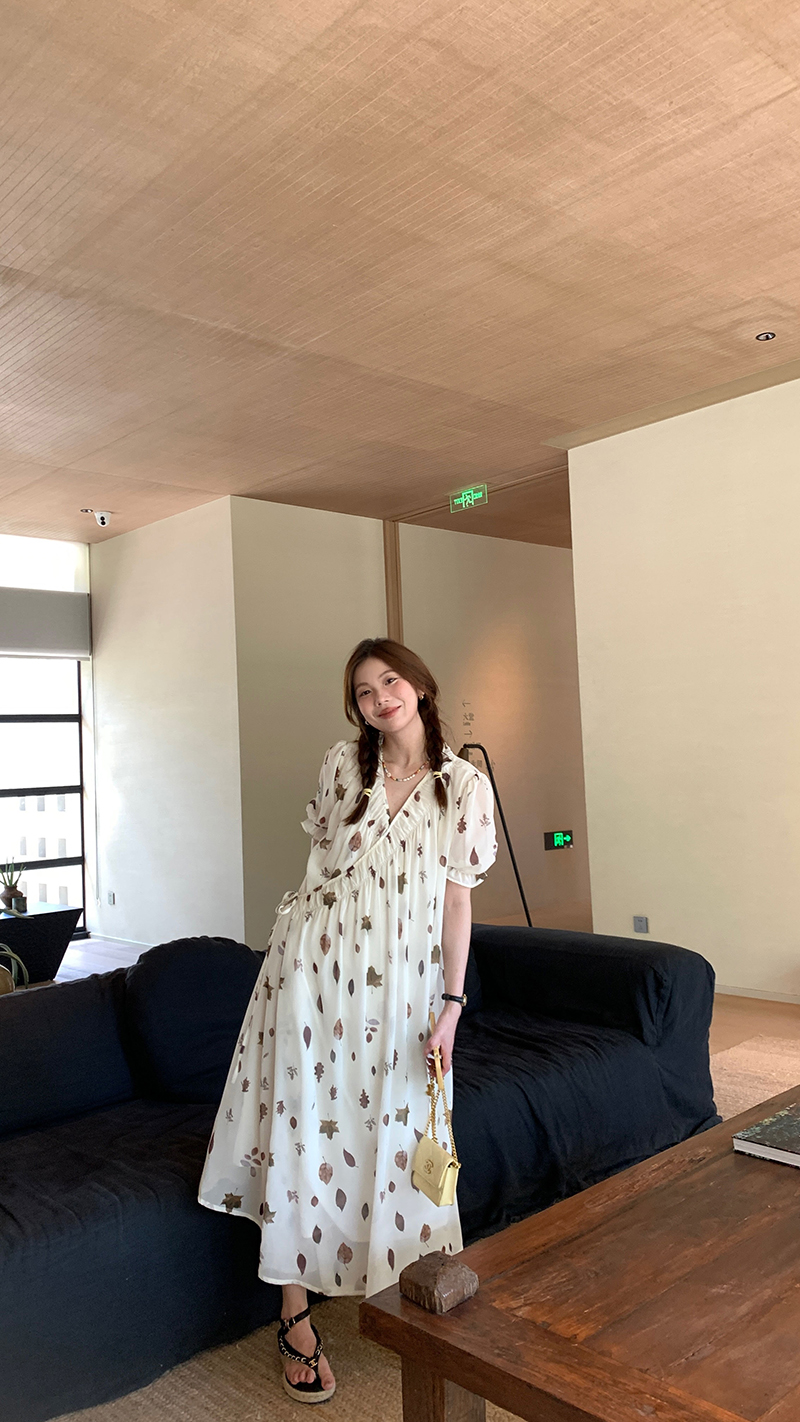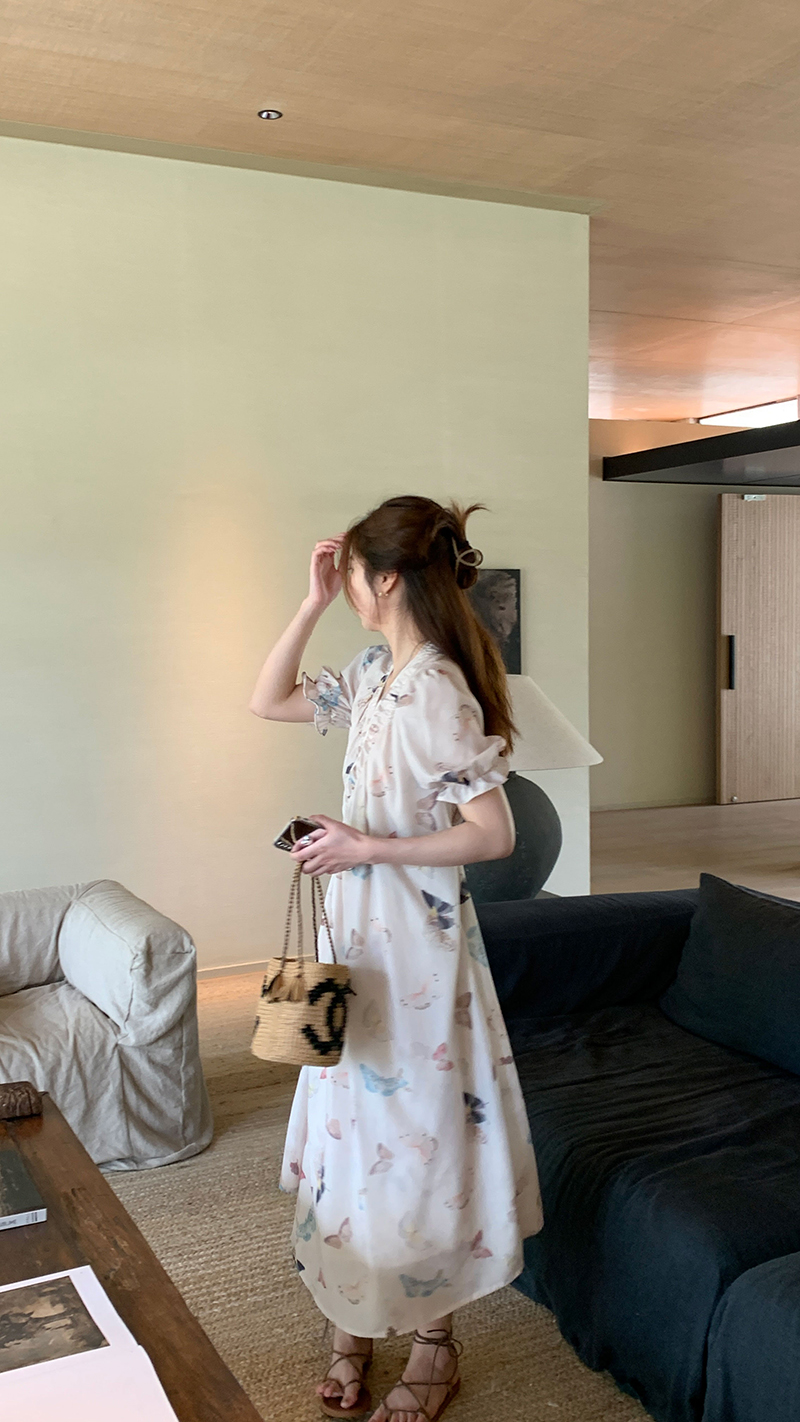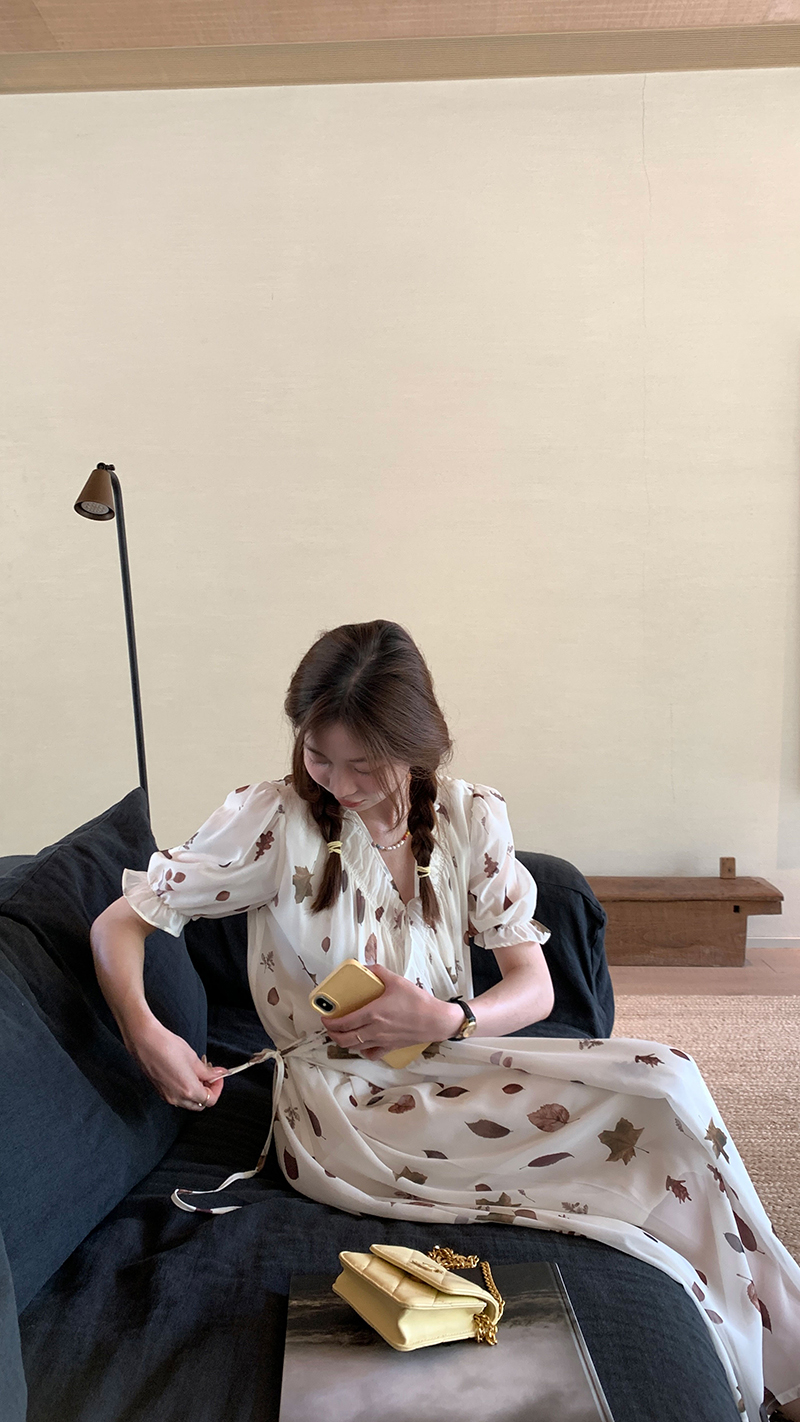 【現貨】im向 cozy鬆弛感三色木耳邊碎花洋裝V領寬鬆燈籠袖裙