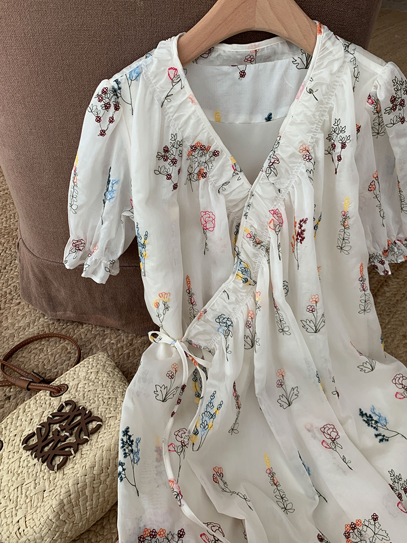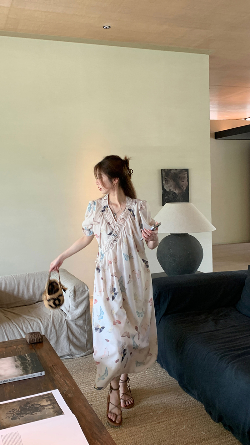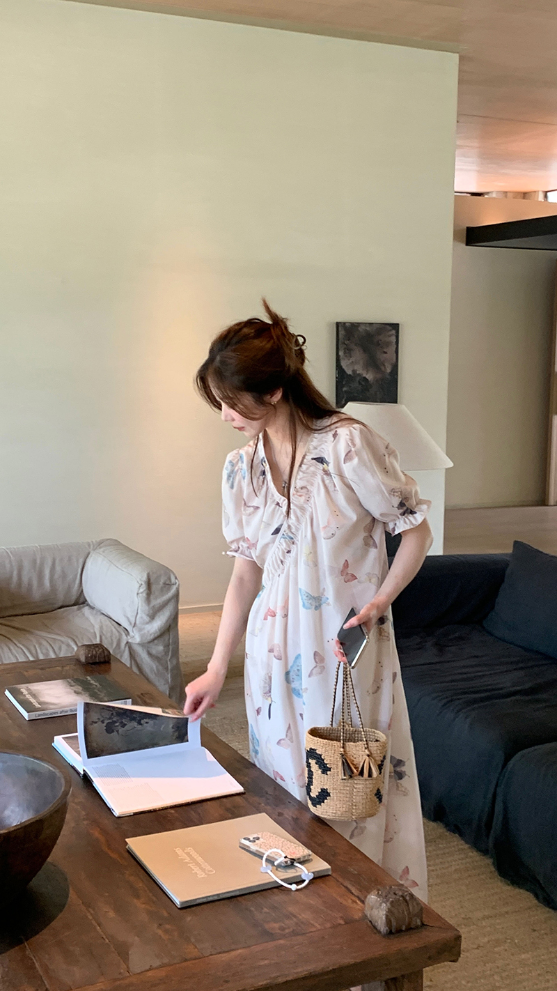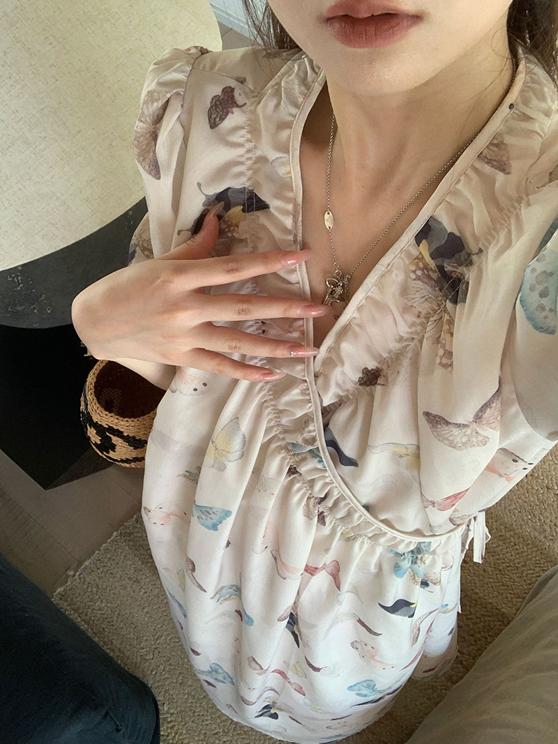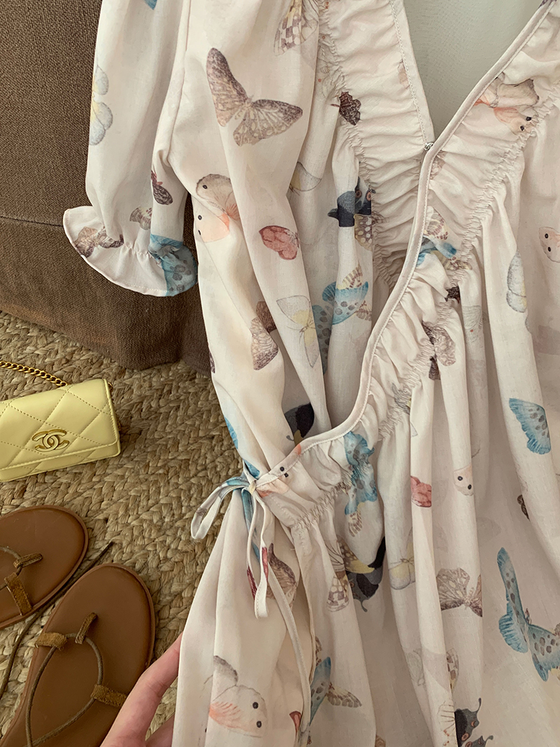 【現貨】im向 cozy鬆弛感三色木耳邊碎花洋裝V領寬鬆燈籠袖裙
