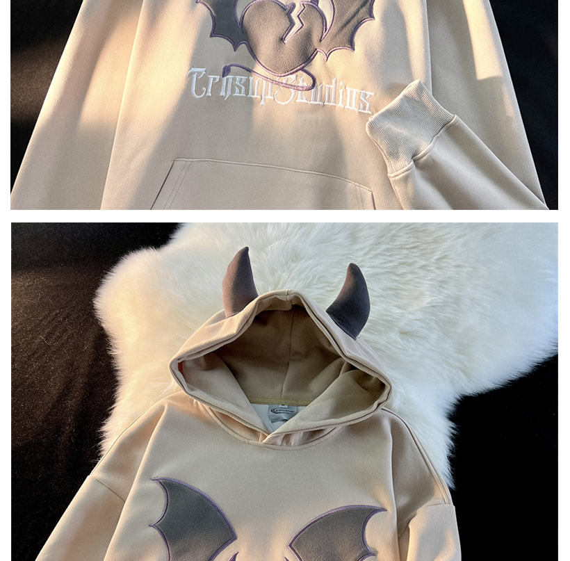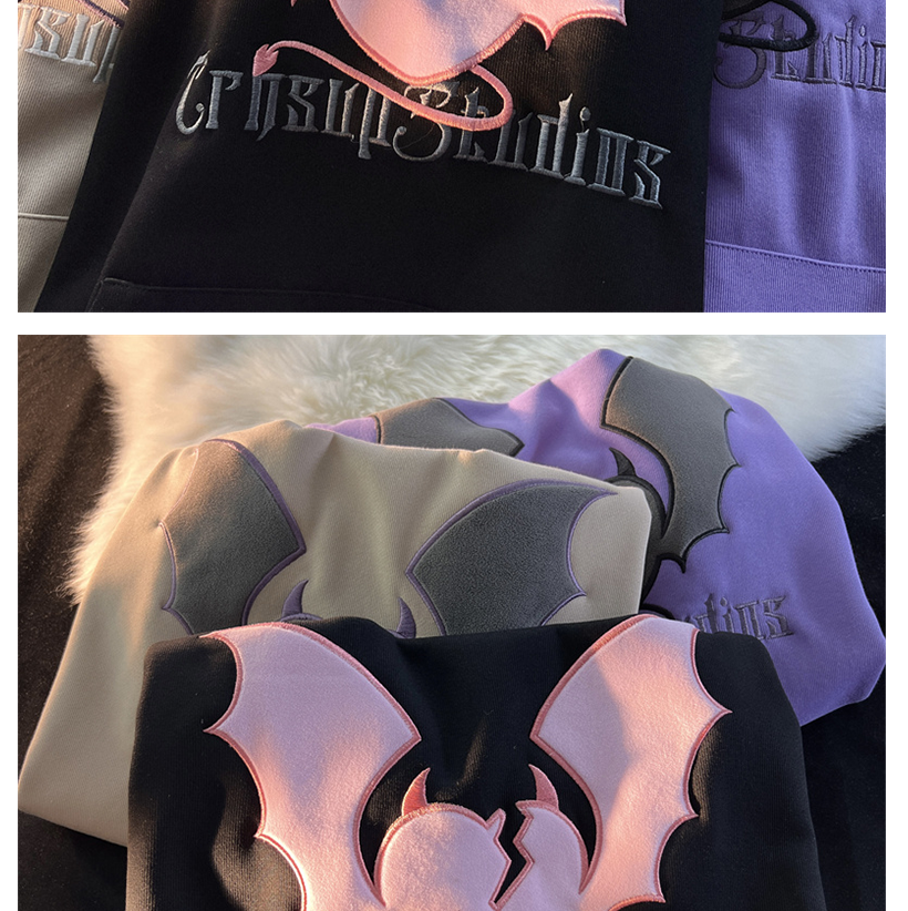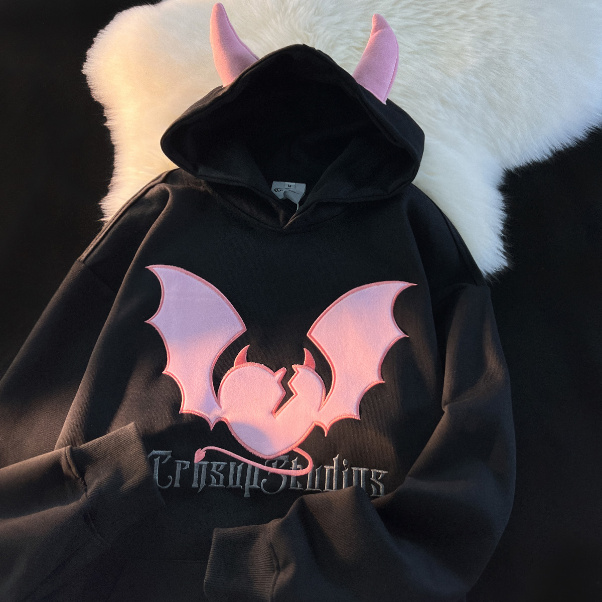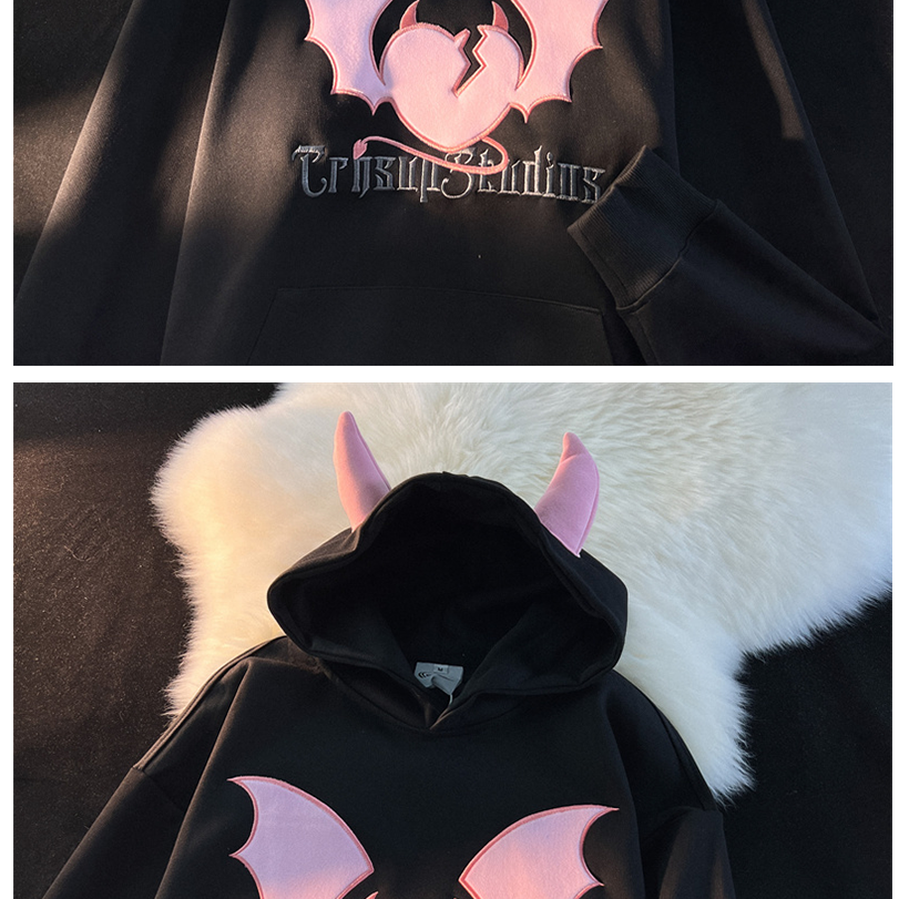 美式復古刺繡小惡魔連帽運動衫女春秋2023新款潮牌oversize高街外套
