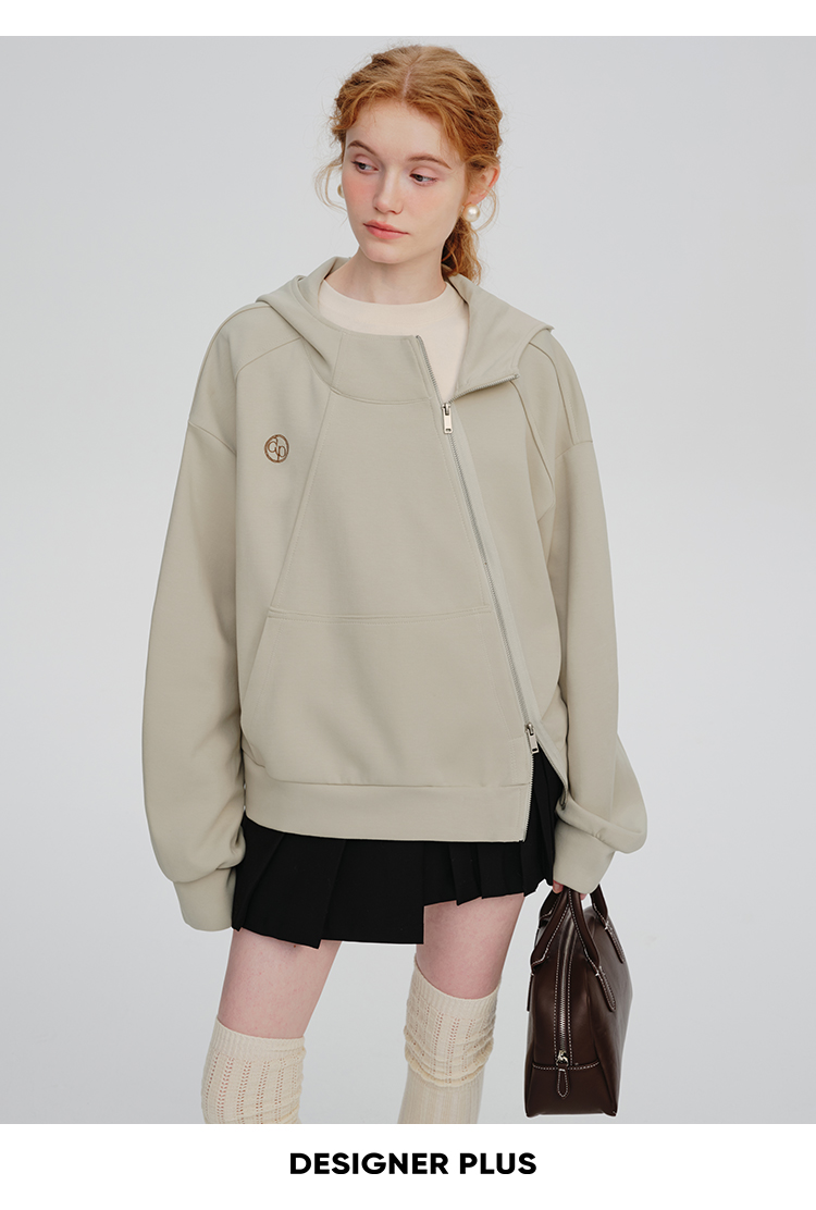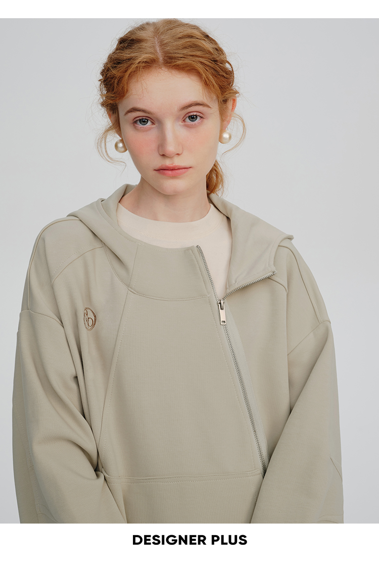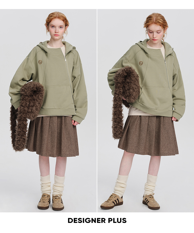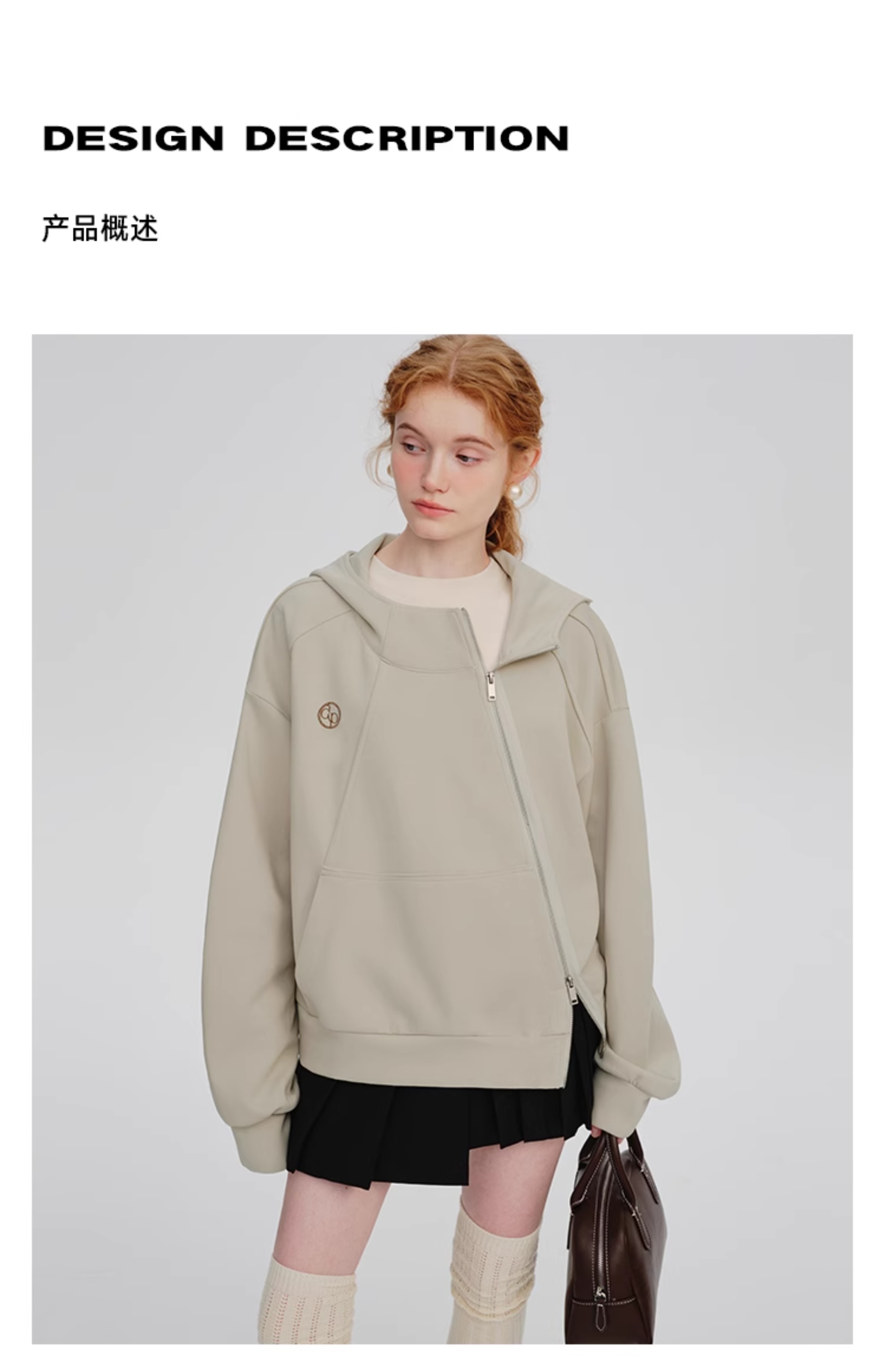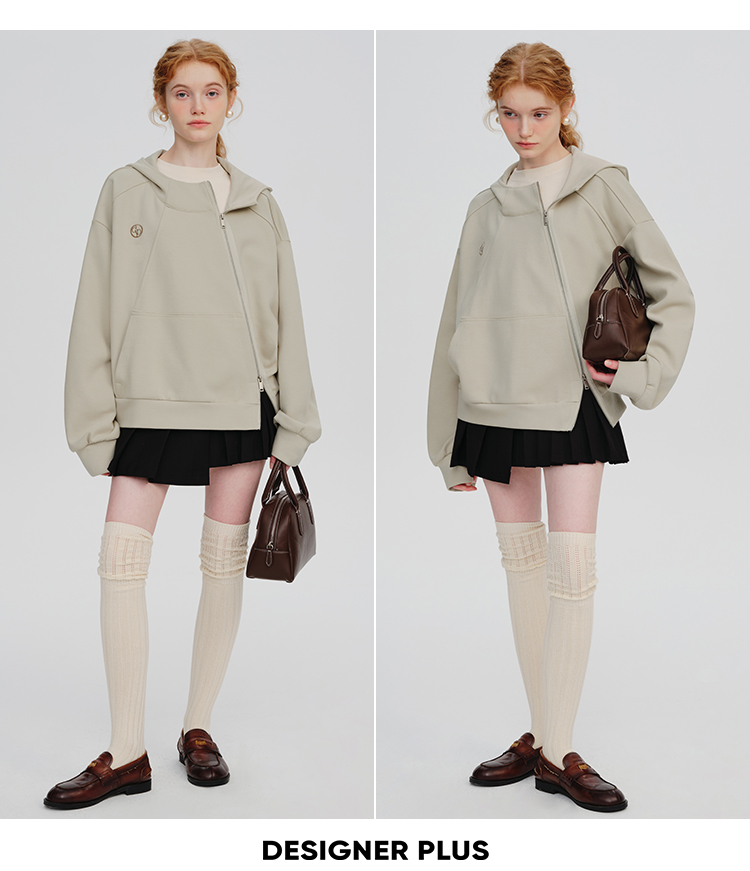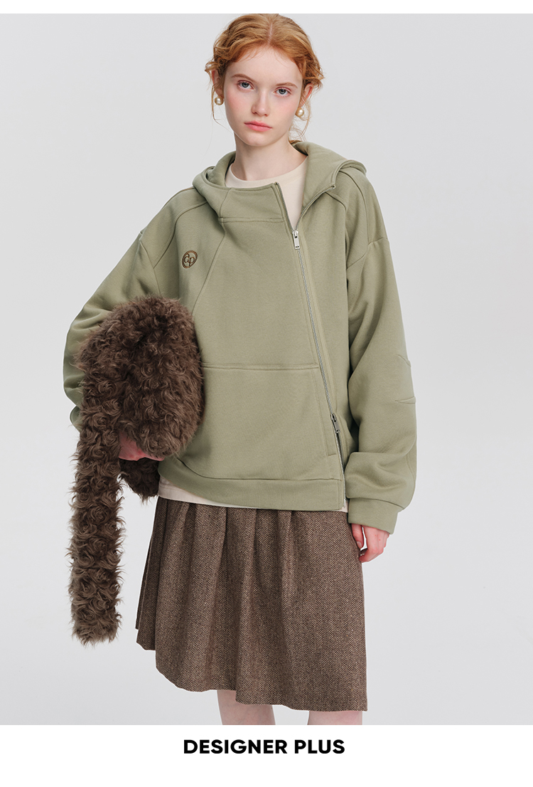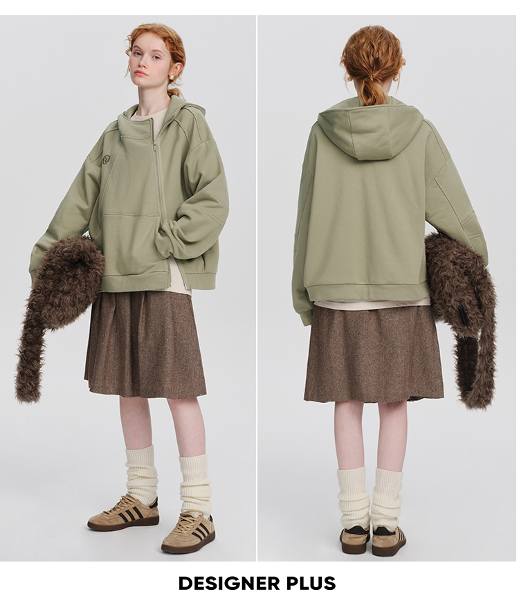 DESIGNER PLUS連帽加絨衛衣女設計感寬鬆斜拉鍊短開衫小個子外套