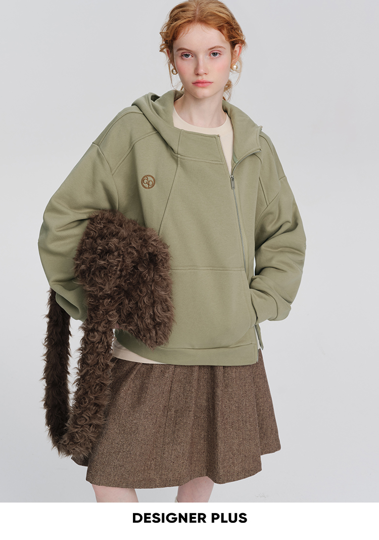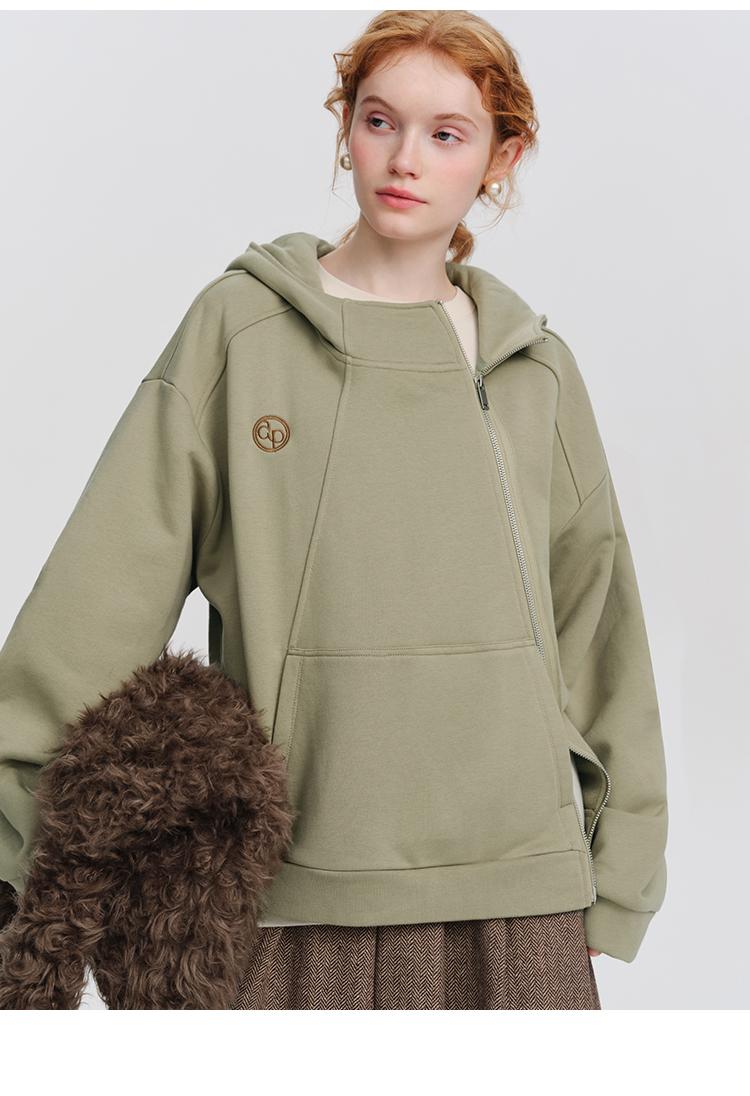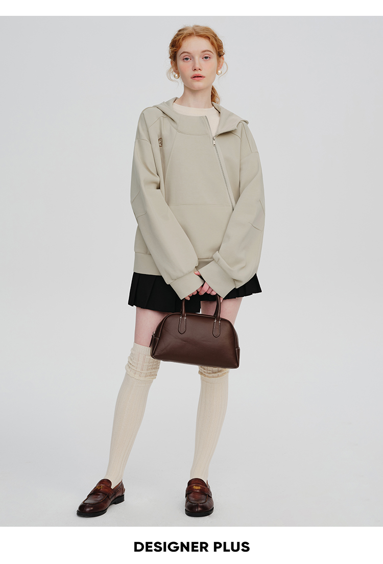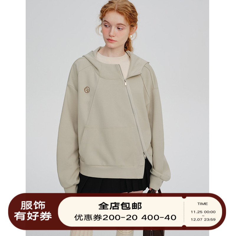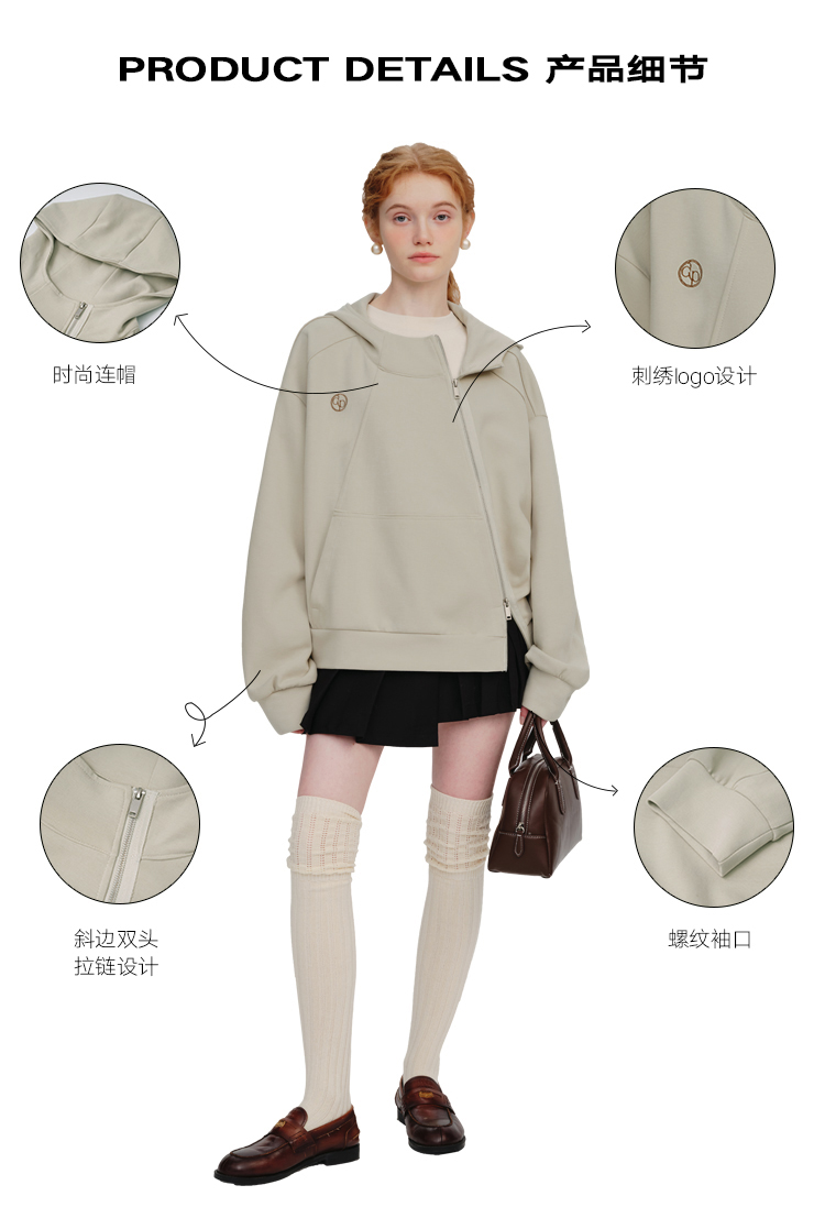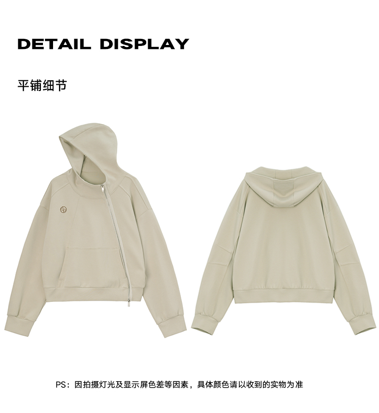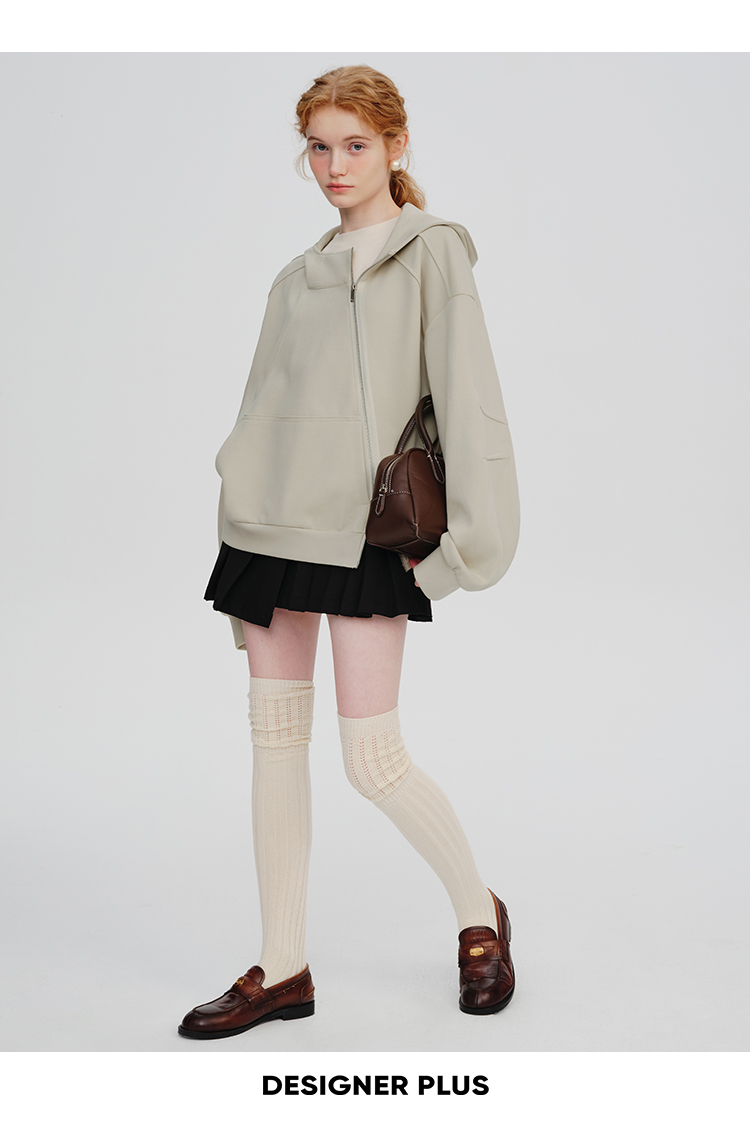 DESIGNER PLUS連帽加絨衛衣女設計感寬鬆斜拉鍊短開衫小個子外套