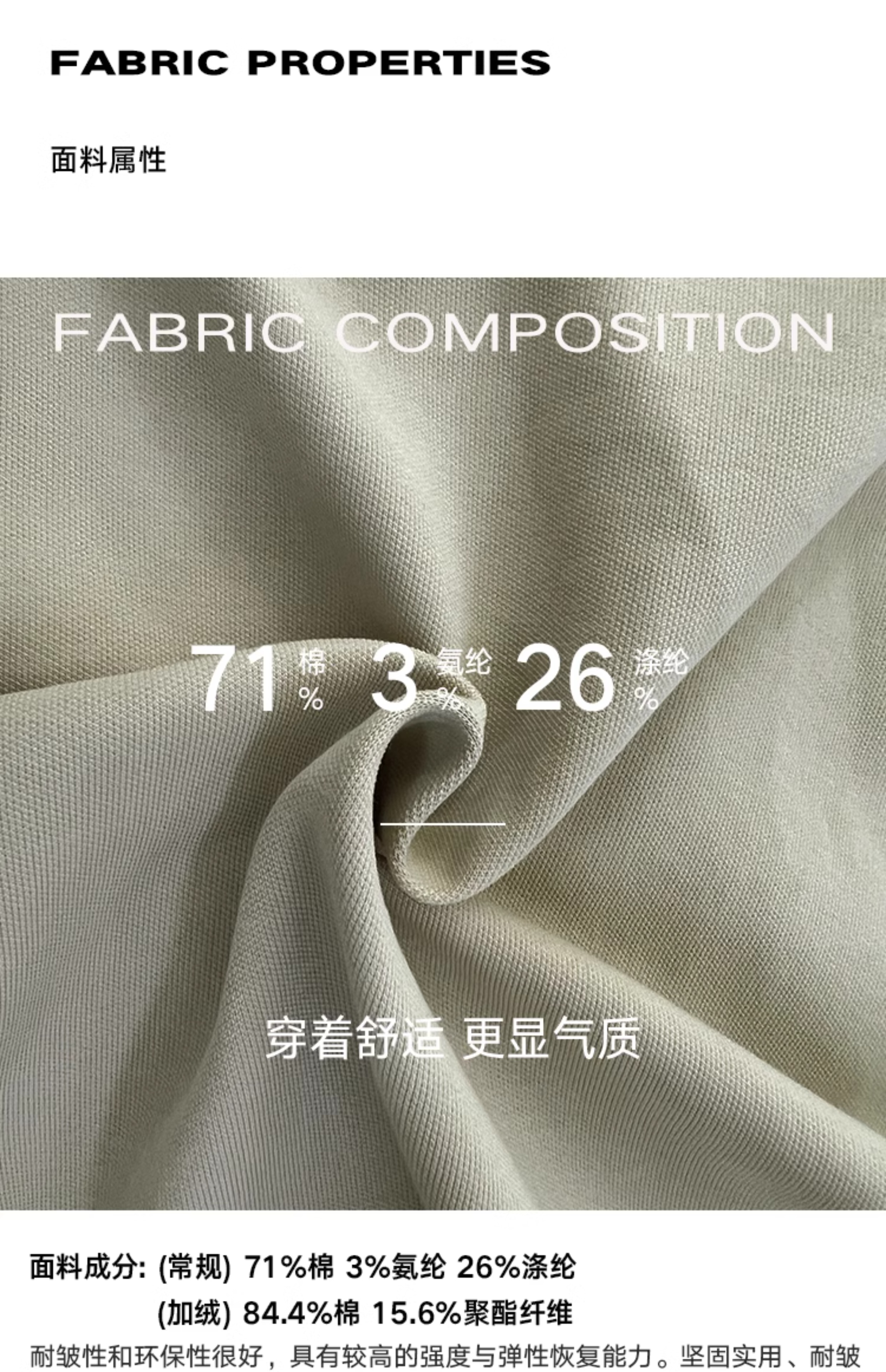 材質成分 棉71% 聚對苯二甲酸乙二酯(聚酯纖維)26% 聚氨酯彈性纖維(氨綸)3%