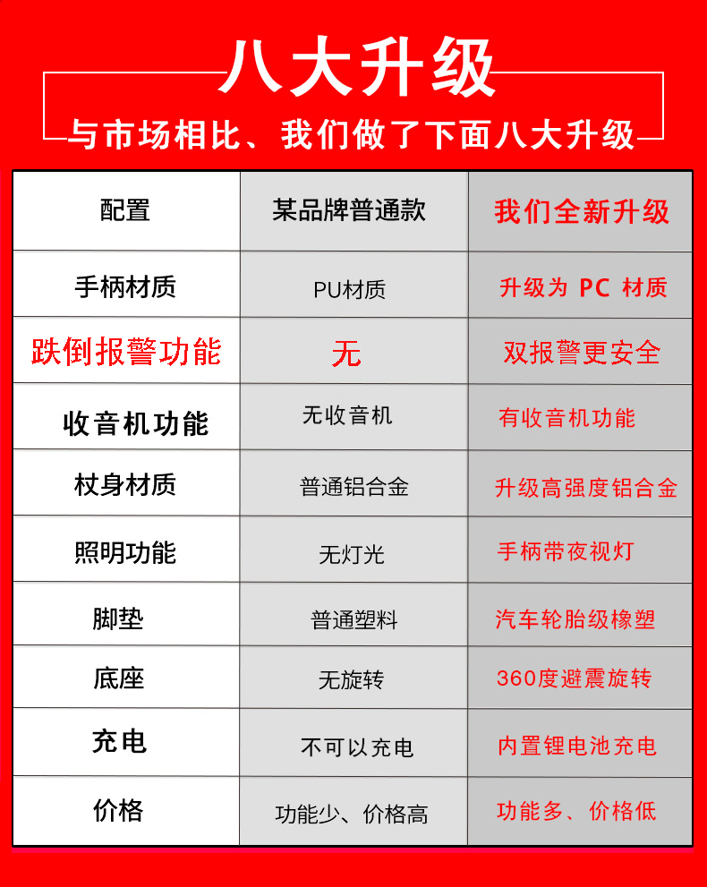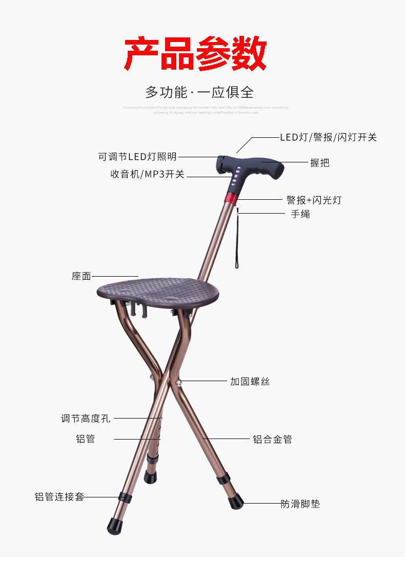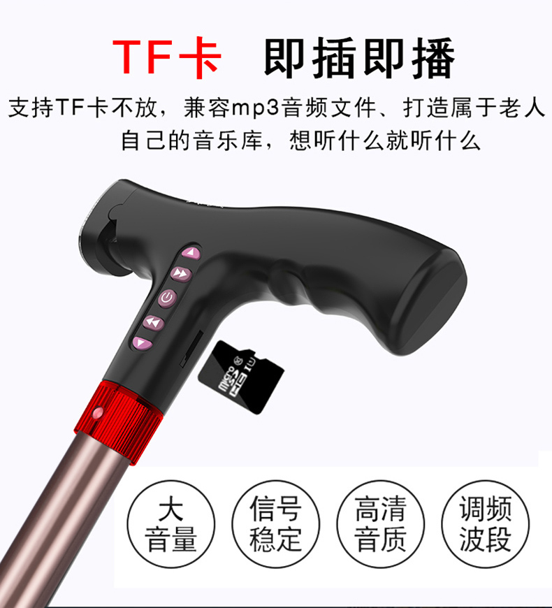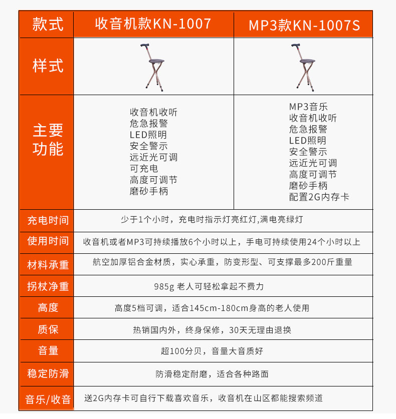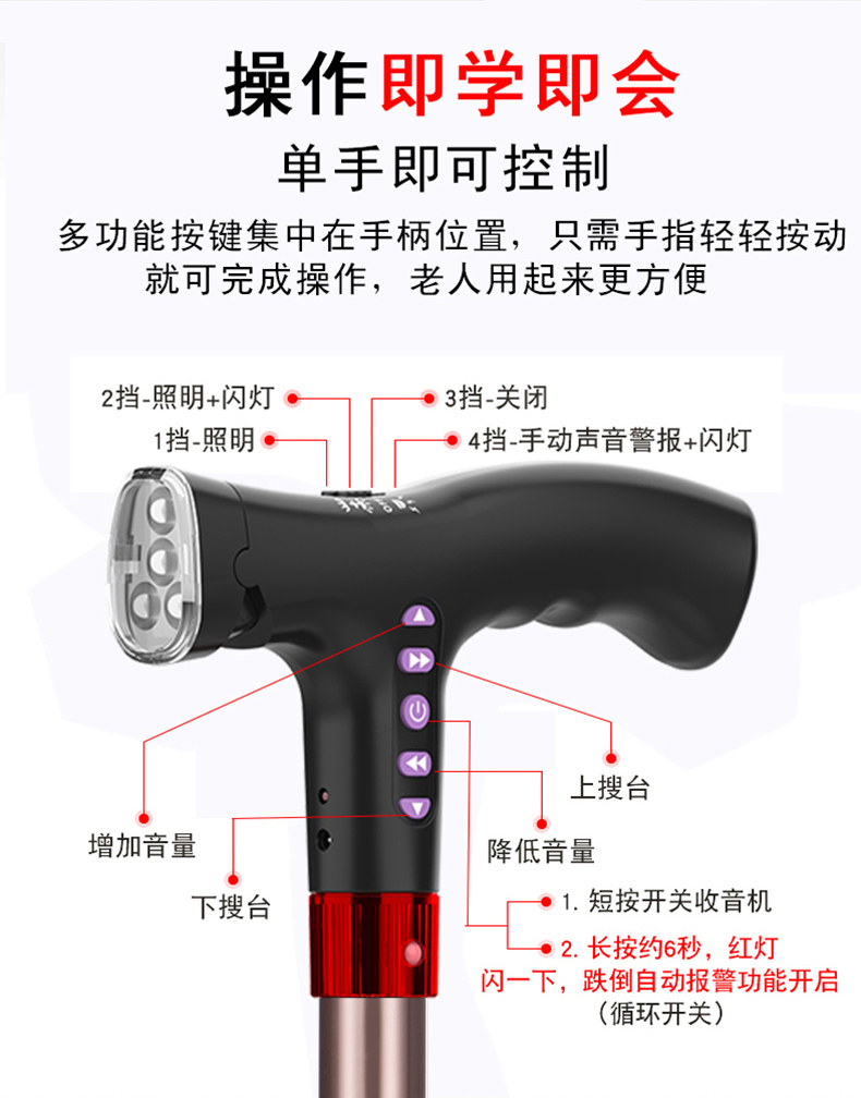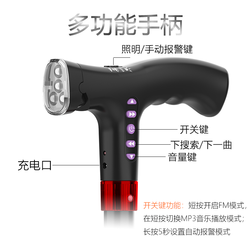 顏色分類 無功能+高度可調款 照明+高度可調款 照明+閃燈警示+收音機【跌倒自動報警】高度可調款 照明+閃燈警示+MP3+收音機【手動報警】高度可調款 照明+配5號電池+高度可調款