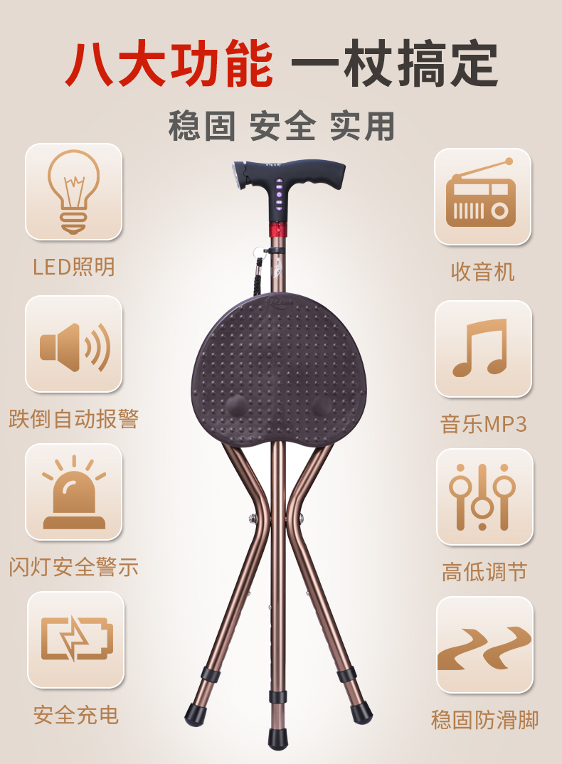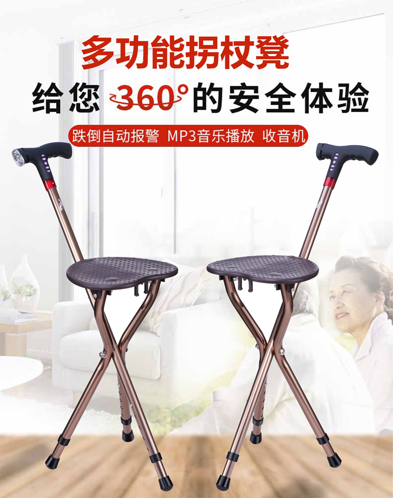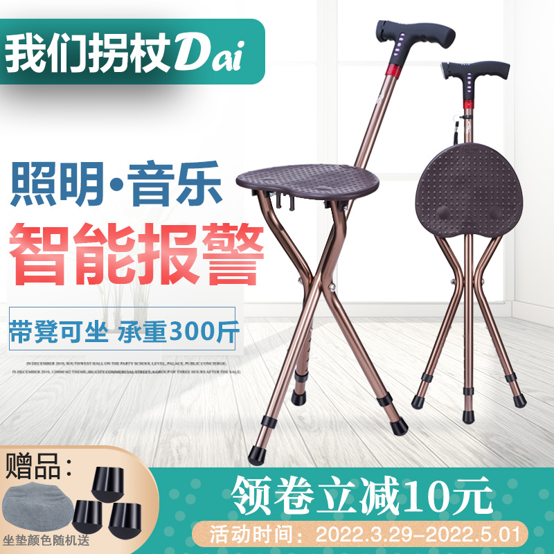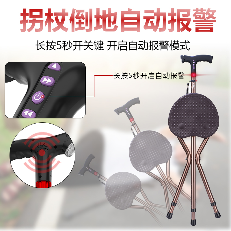 老人柺杖椅子兩用防滑柺棍凳輕便帶坐多功能智能報警摺疊老年手扙
