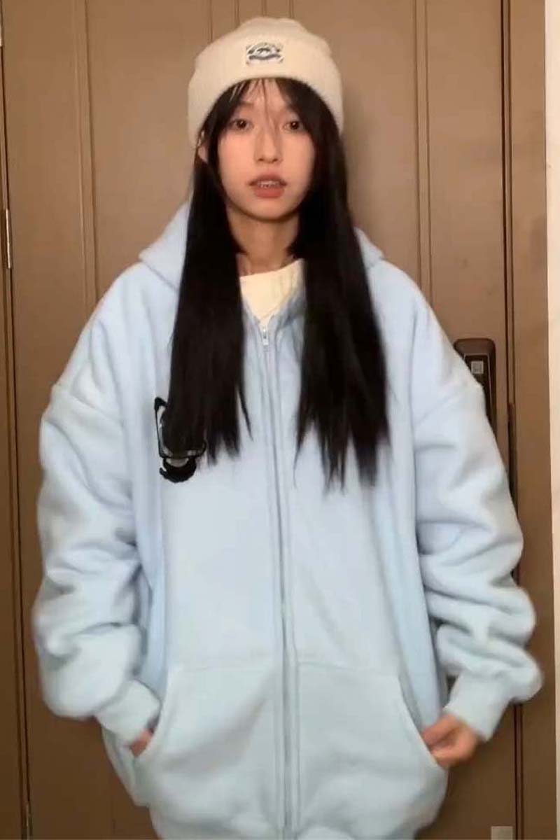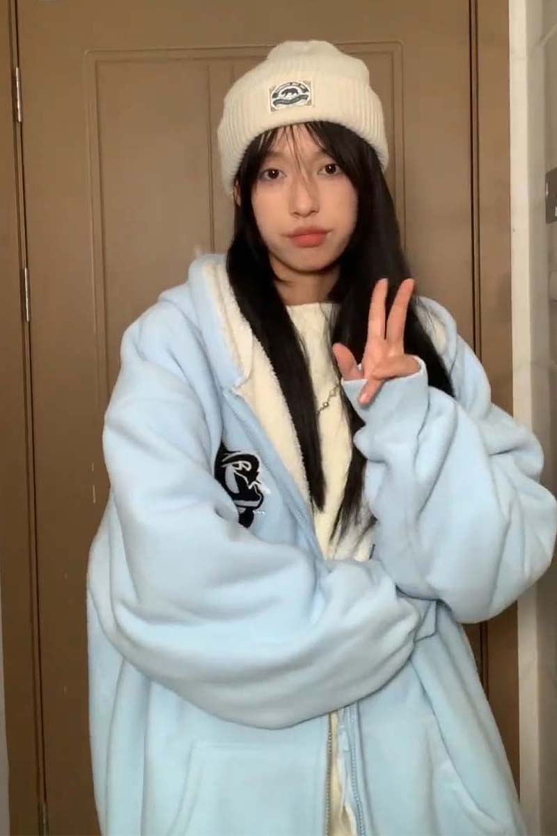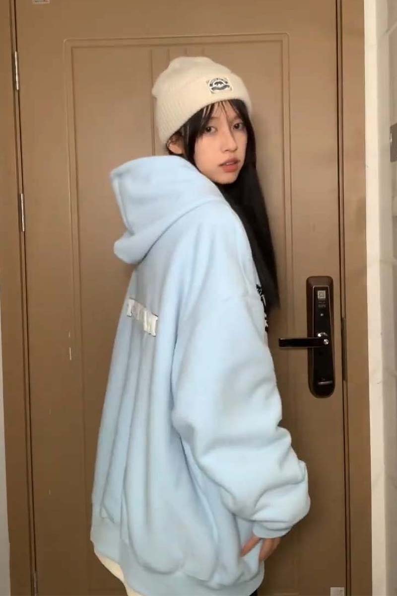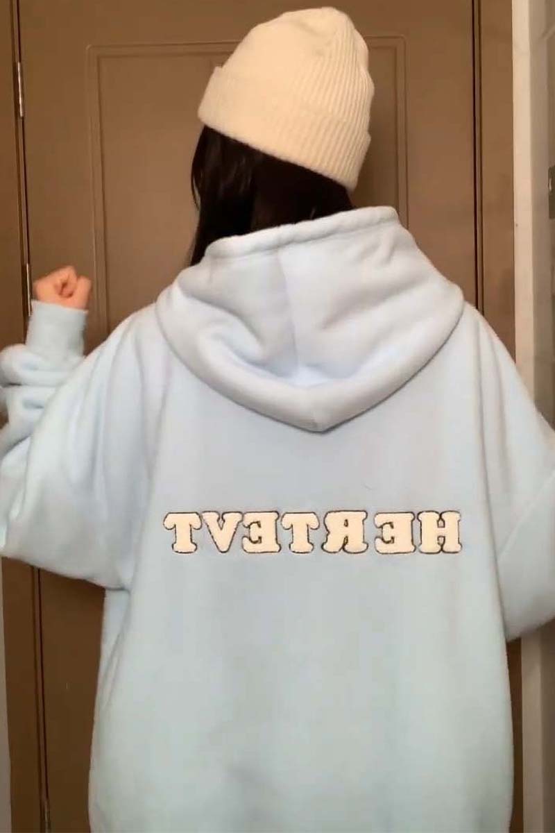 美式奶藍色字母刺繡外套女冬季加絨加厚寬鬆百搭拉鍊連帽運動衫ins