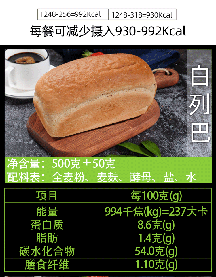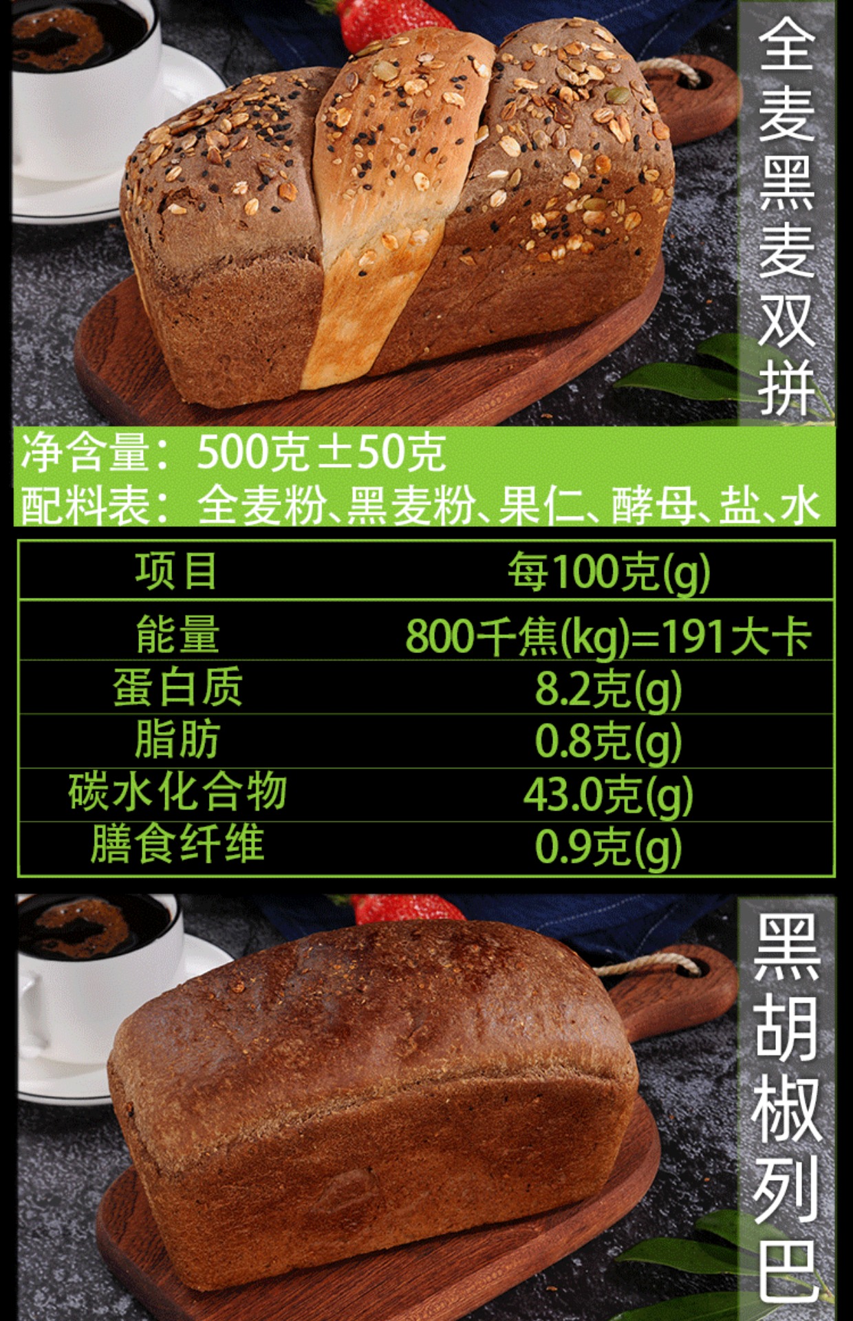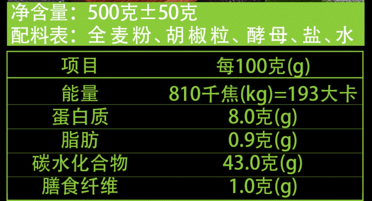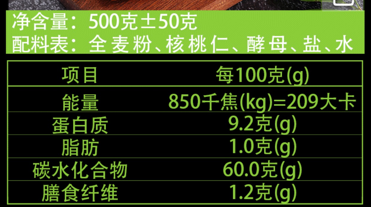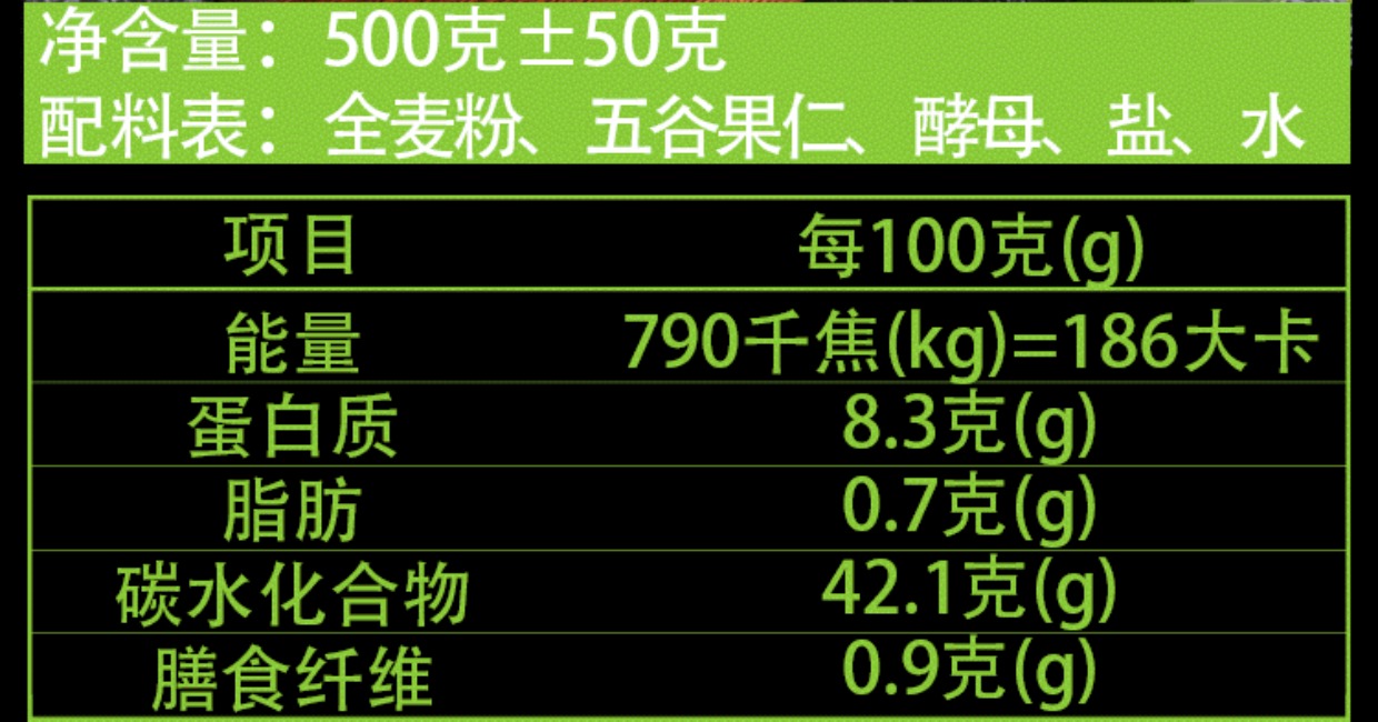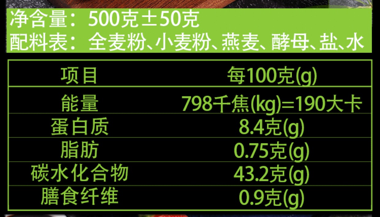 配料表 全麥麵包粉(全麥粉≥40%)、全麥粉(添加量≥22%)、黑麥麥芽酚、飲用水、細麥麩、食鹽、酵母