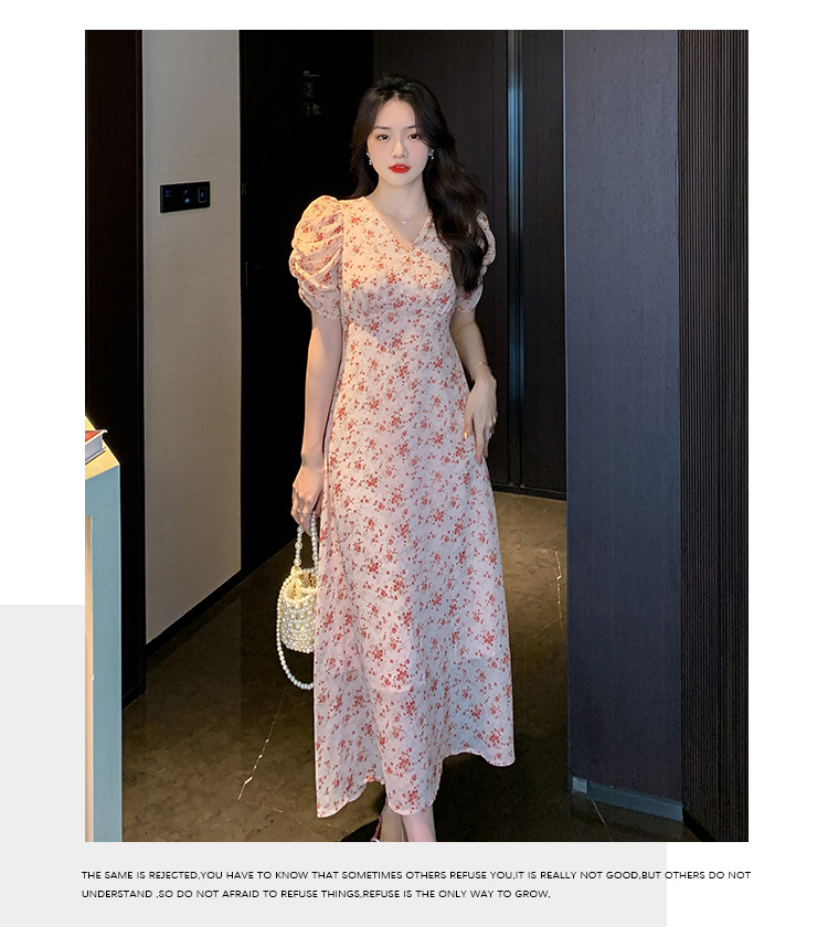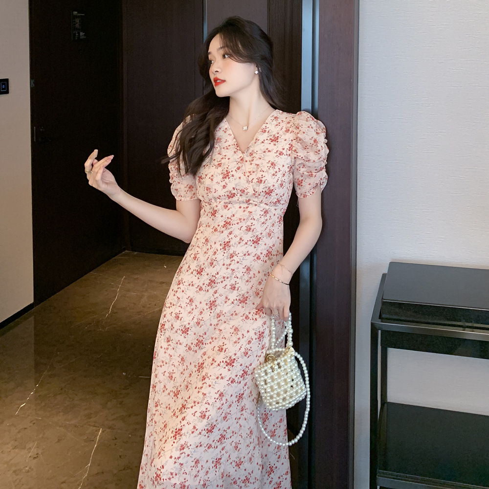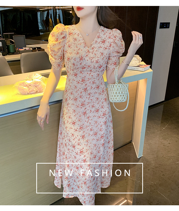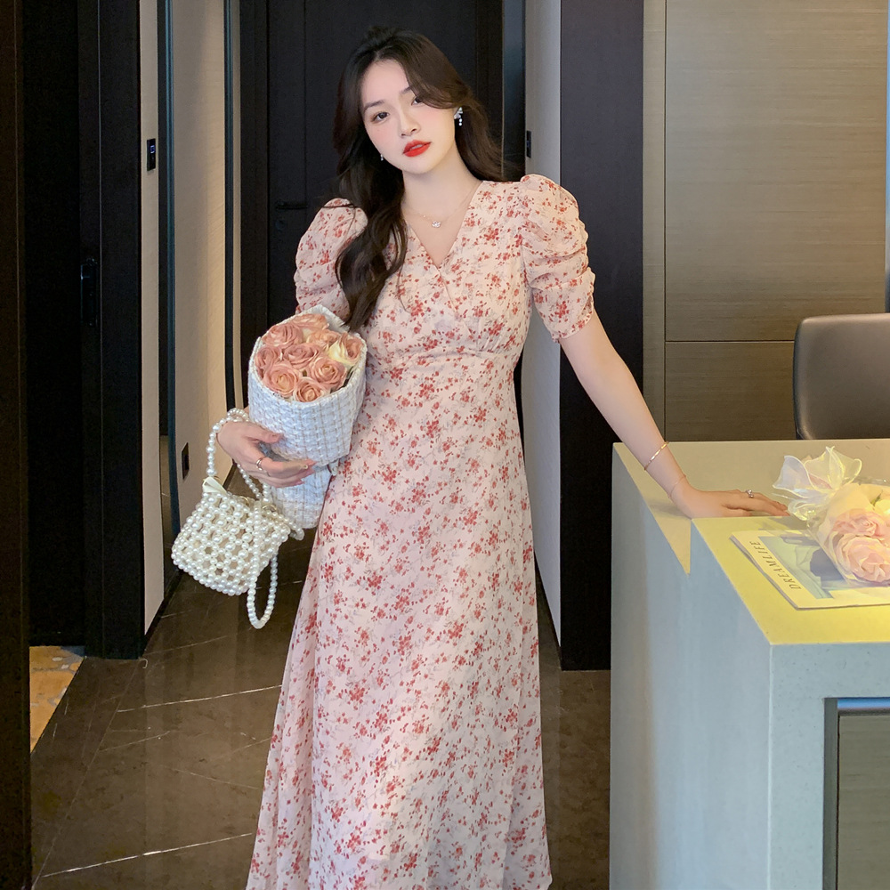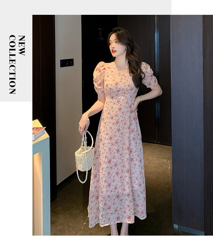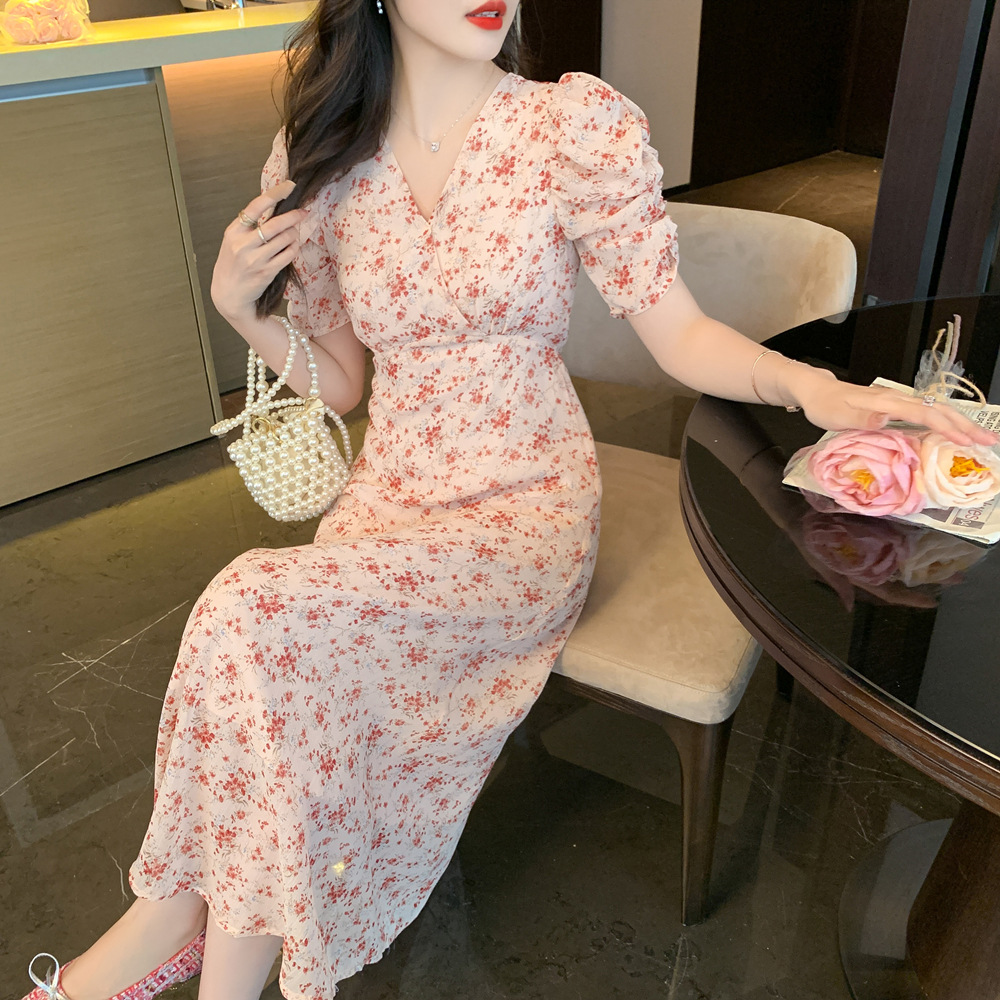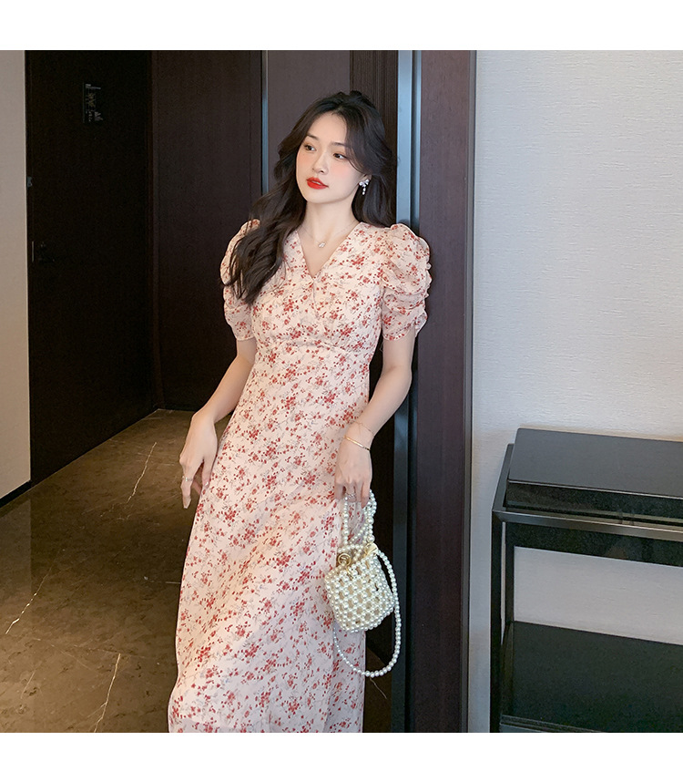 2023夏季新款法式田园V领泡泡袖碎花雪纺收腰显瘦长款连衣裙