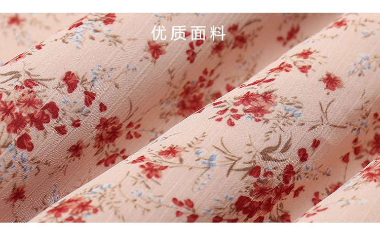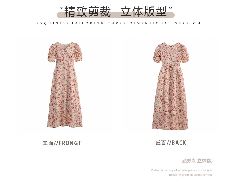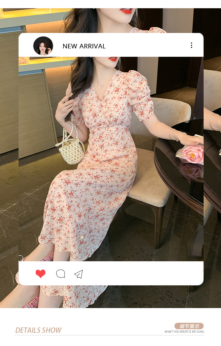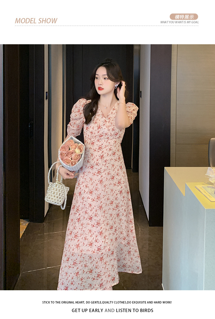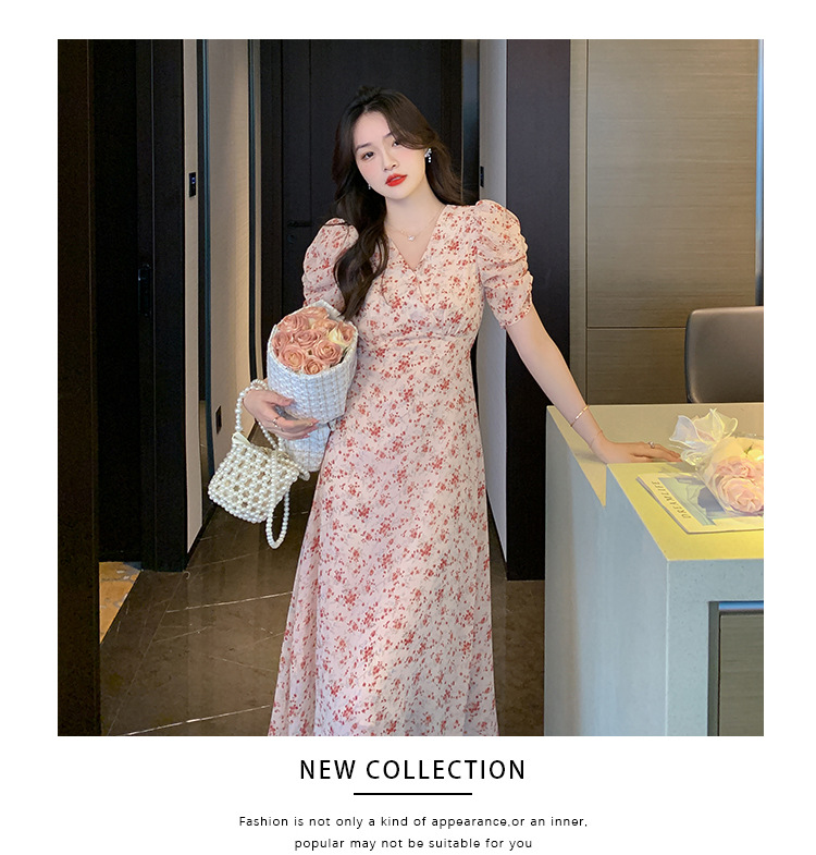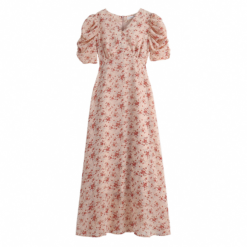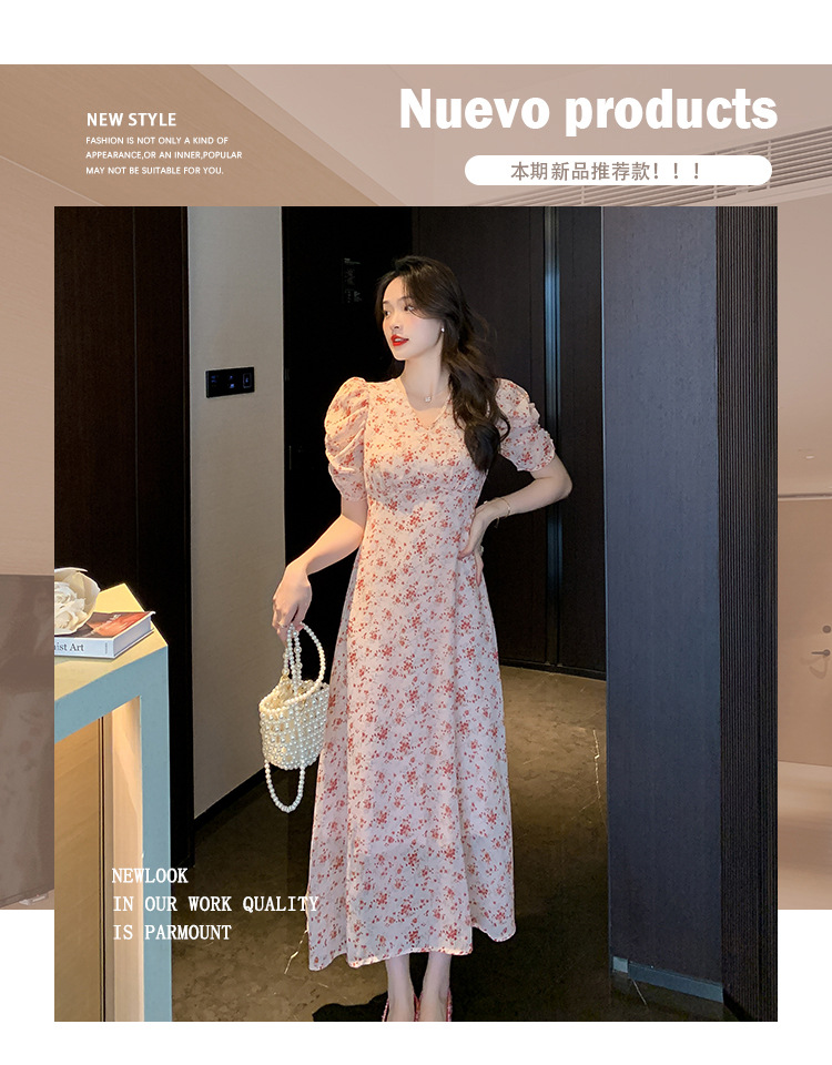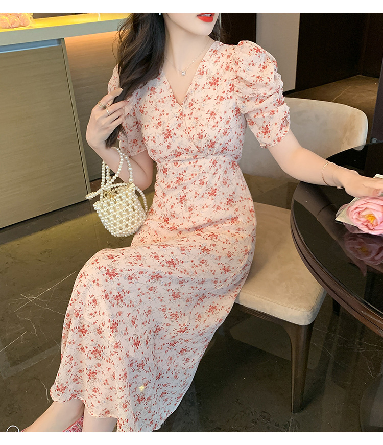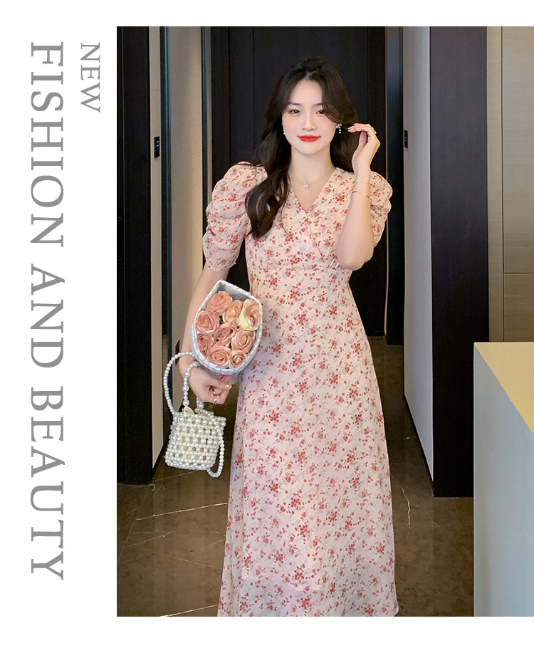 2023夏季新款法式田园V领泡泡袖碎花雪纺收腰显瘦长款连衣裙