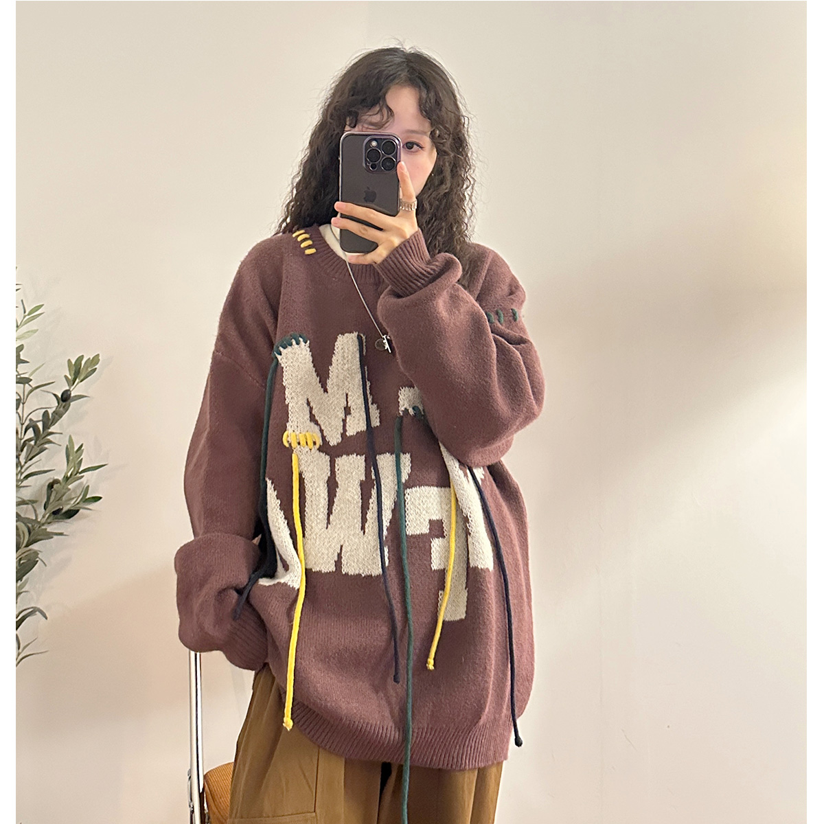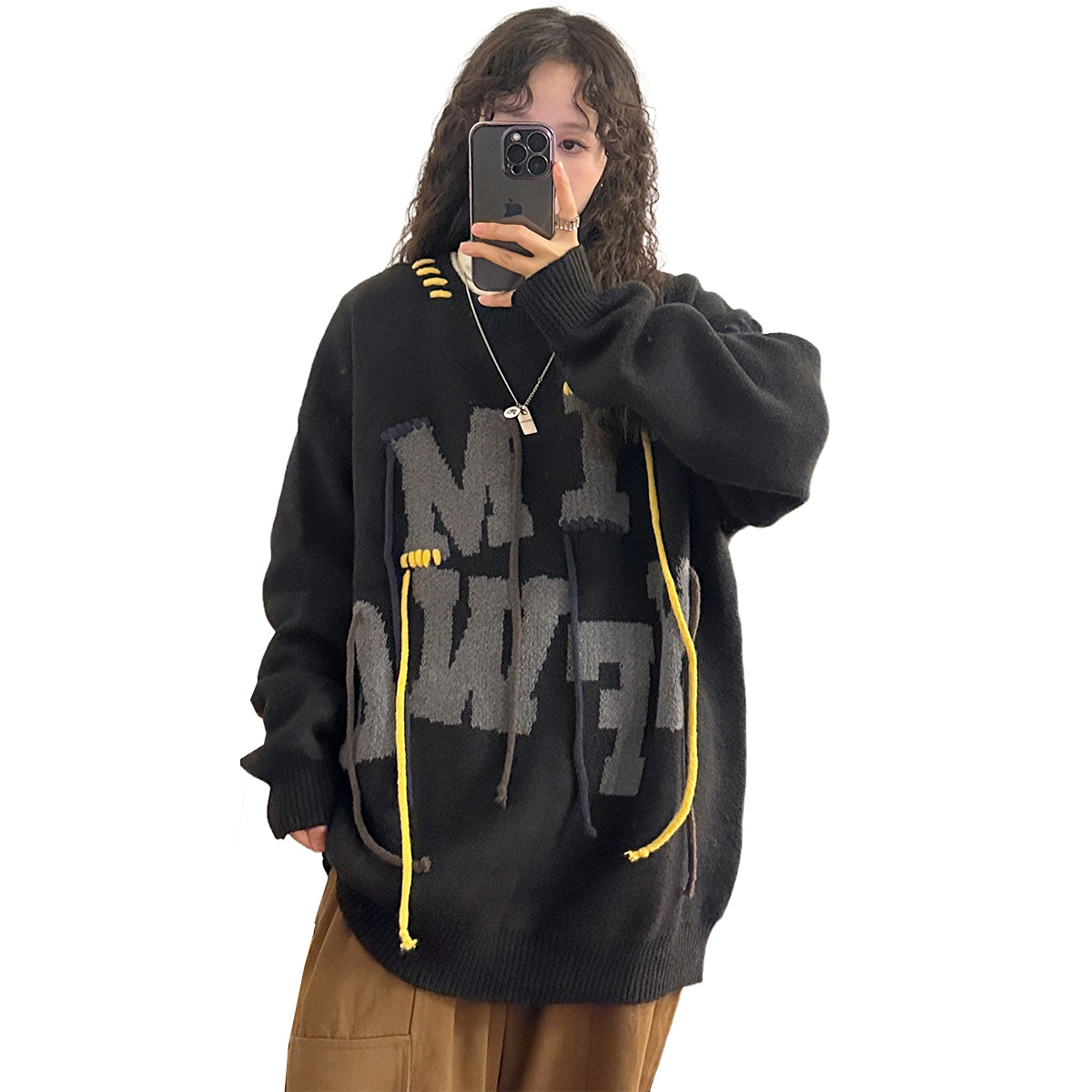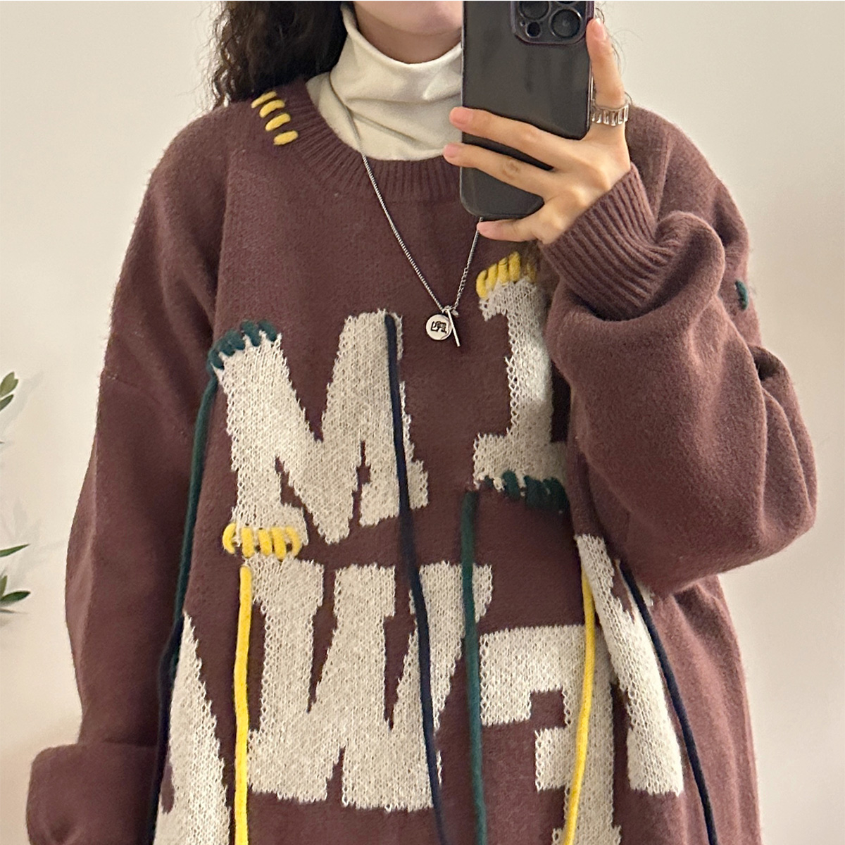 UATONLINE秋冬美式復古穿繩字母圓領毛衣針織衫百搭休閒上衣女潮