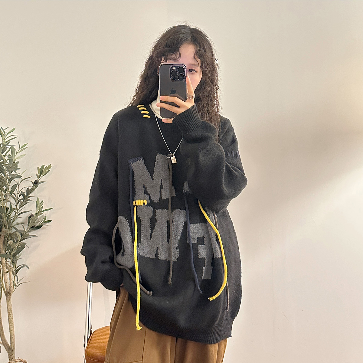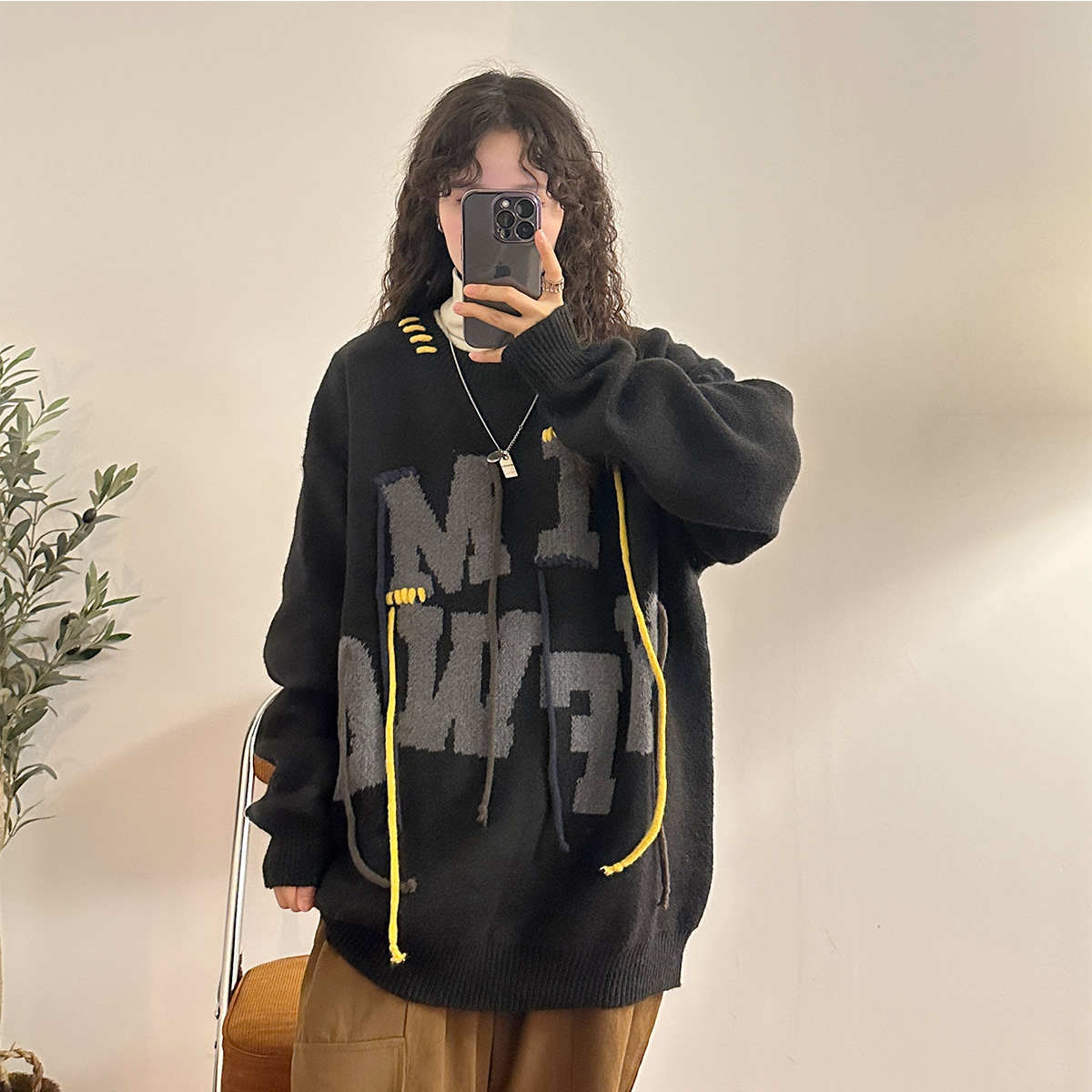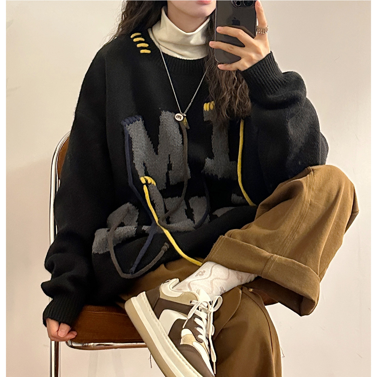 UATONLINE秋冬美式復古穿繩字母圓領毛衣針織衫百搭休閒上衣女潮
