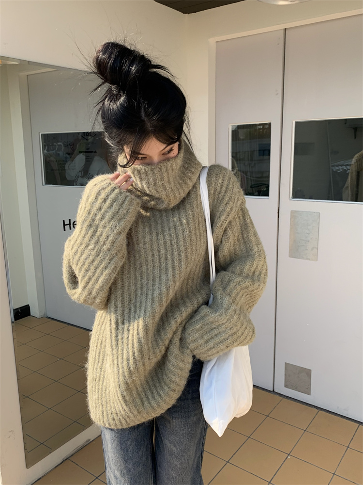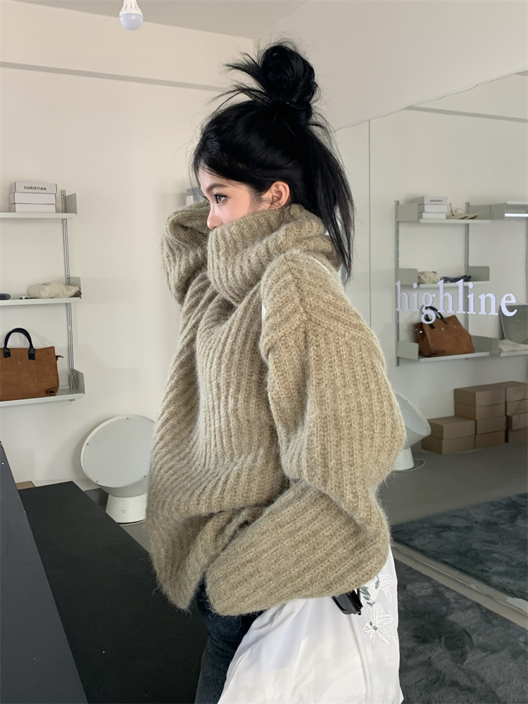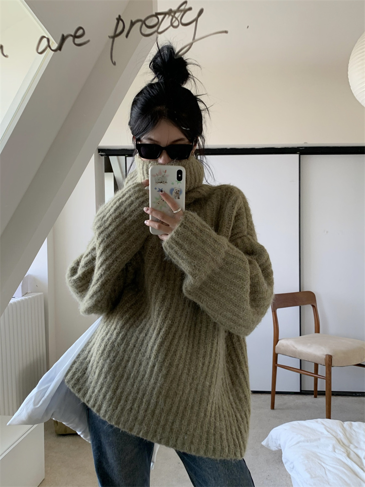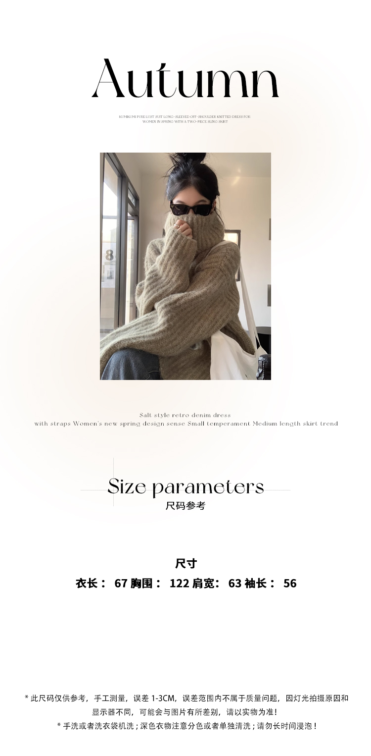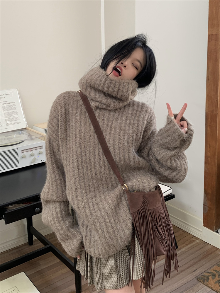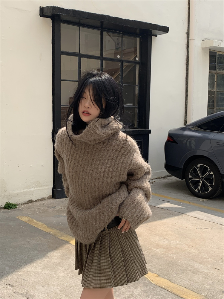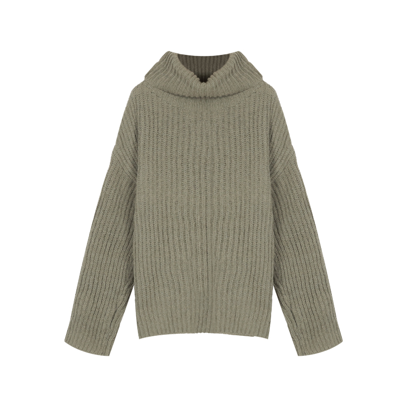kumikumi慵懶風純色高領坑條長袖毛衣女2023早秋寬鬆顯瘦百搭上衣
