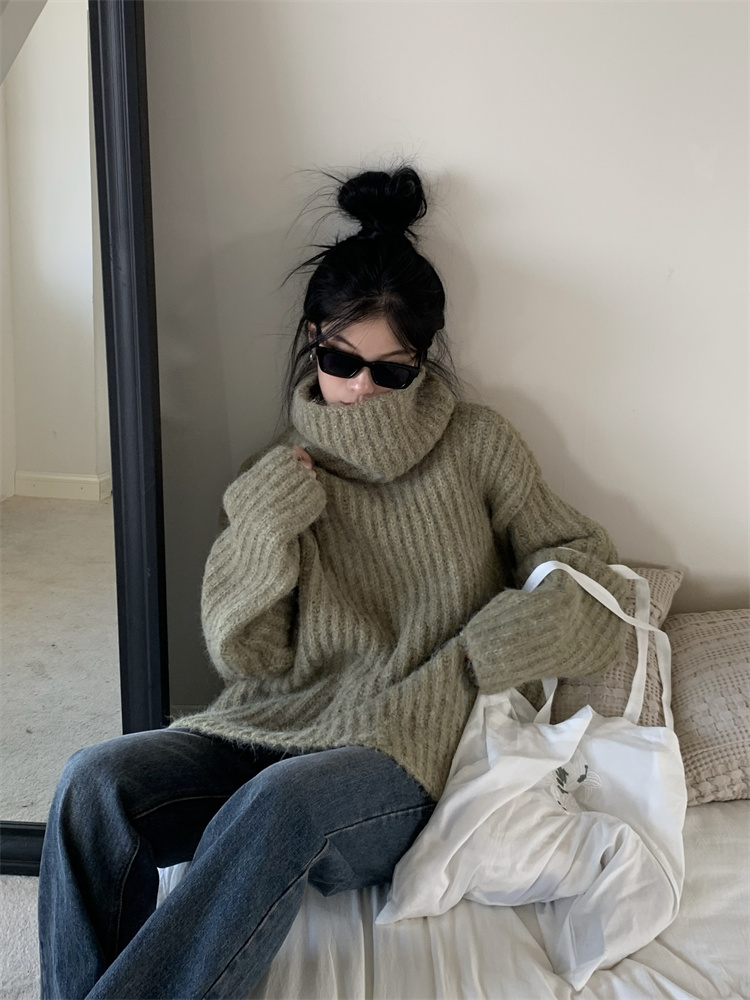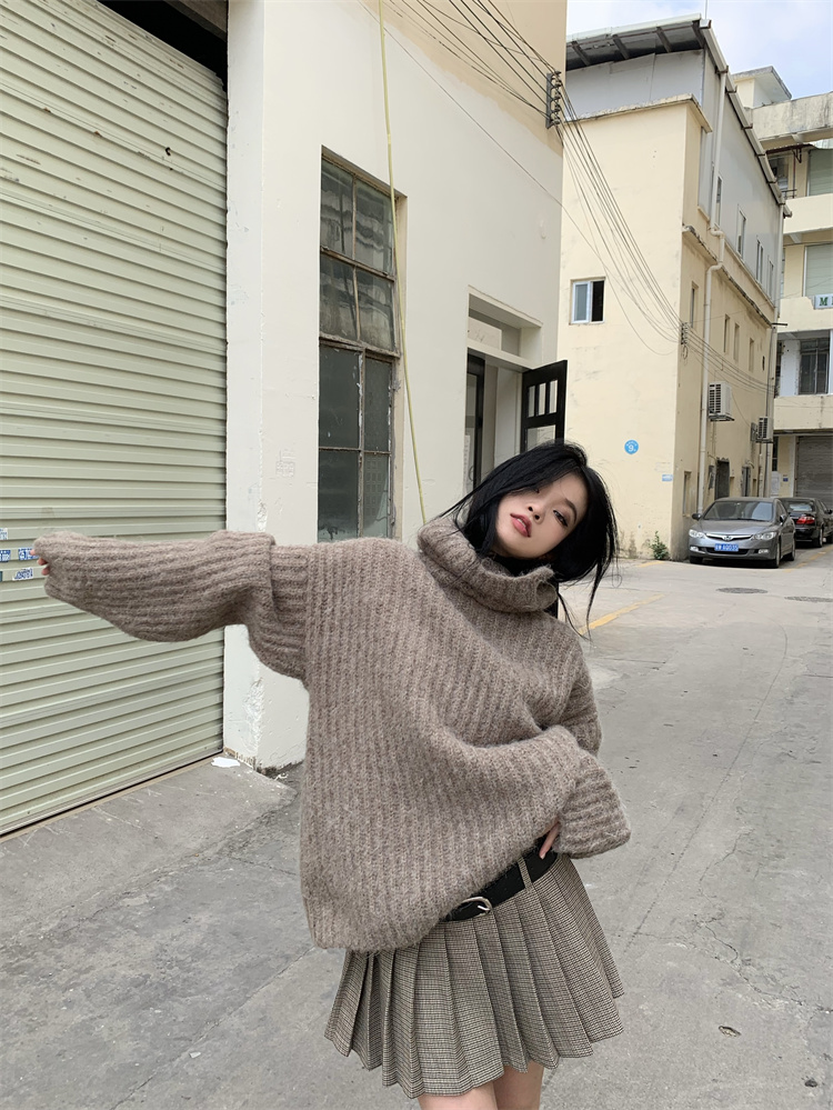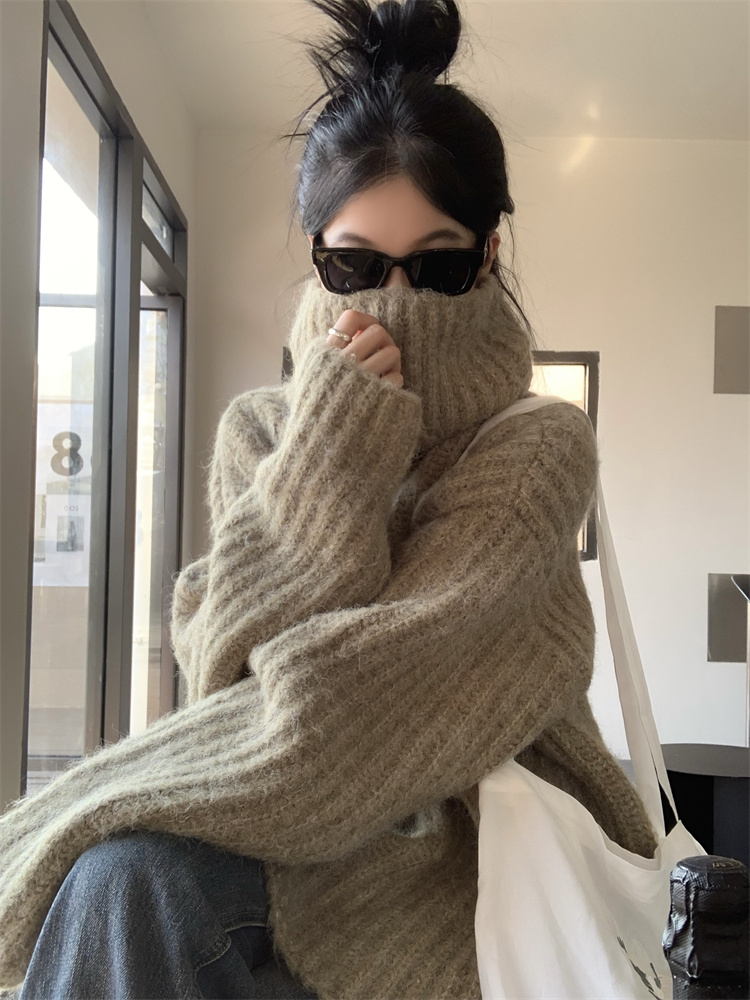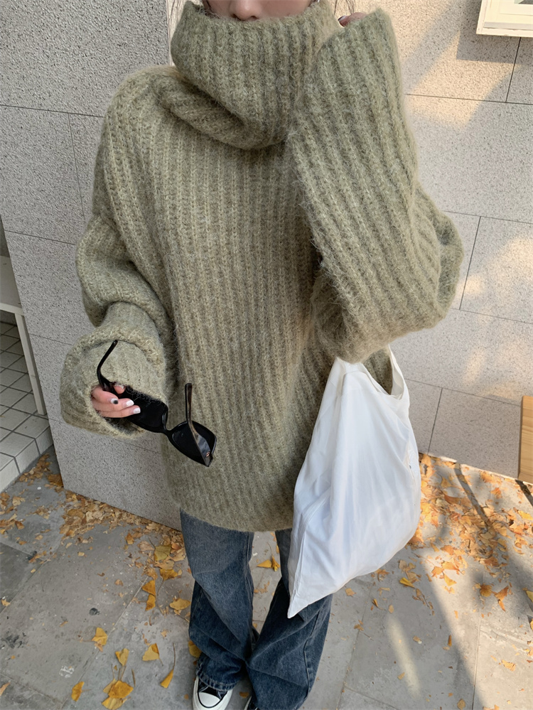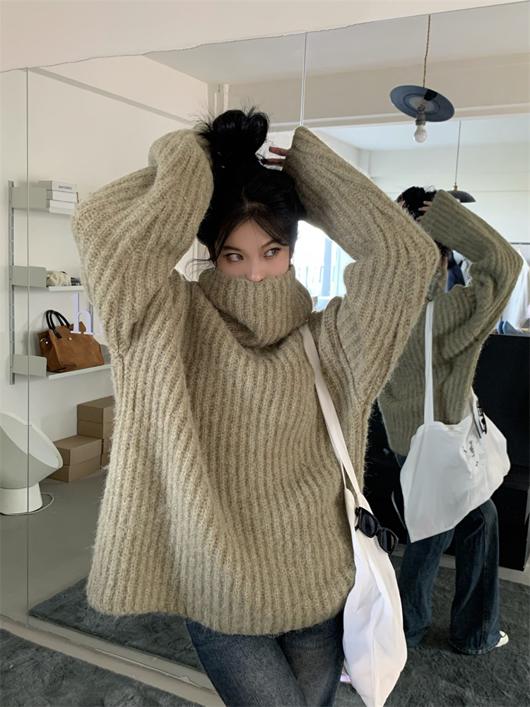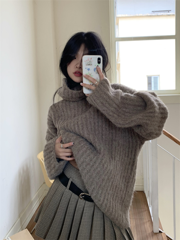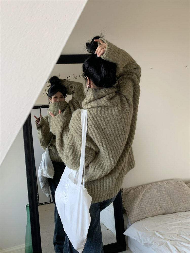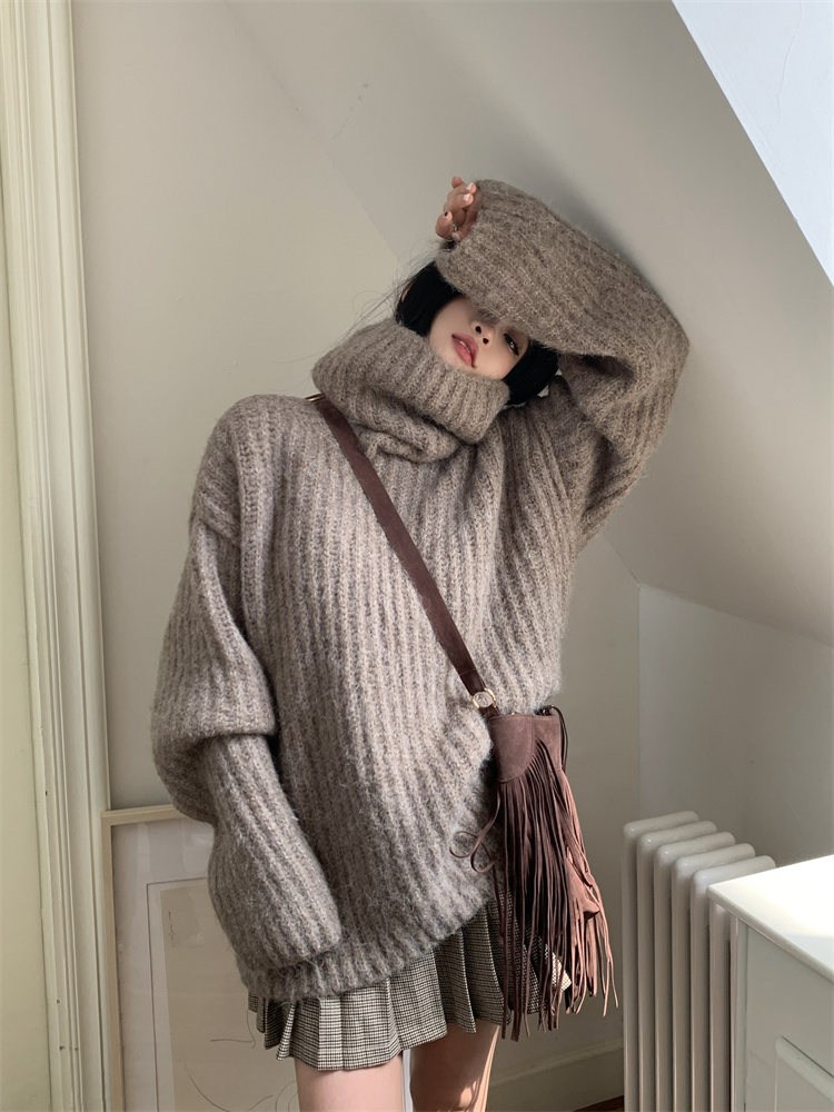 kumikumi慵懶風純色高領坑條長袖毛衣女2023早秋寬鬆顯瘦百搭上衣
