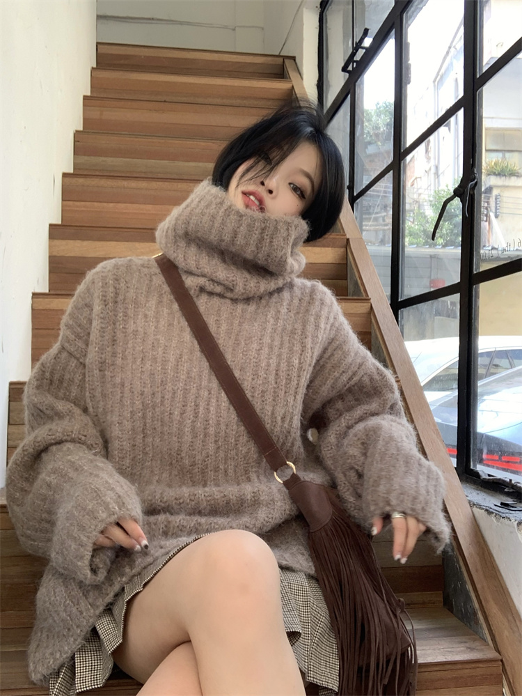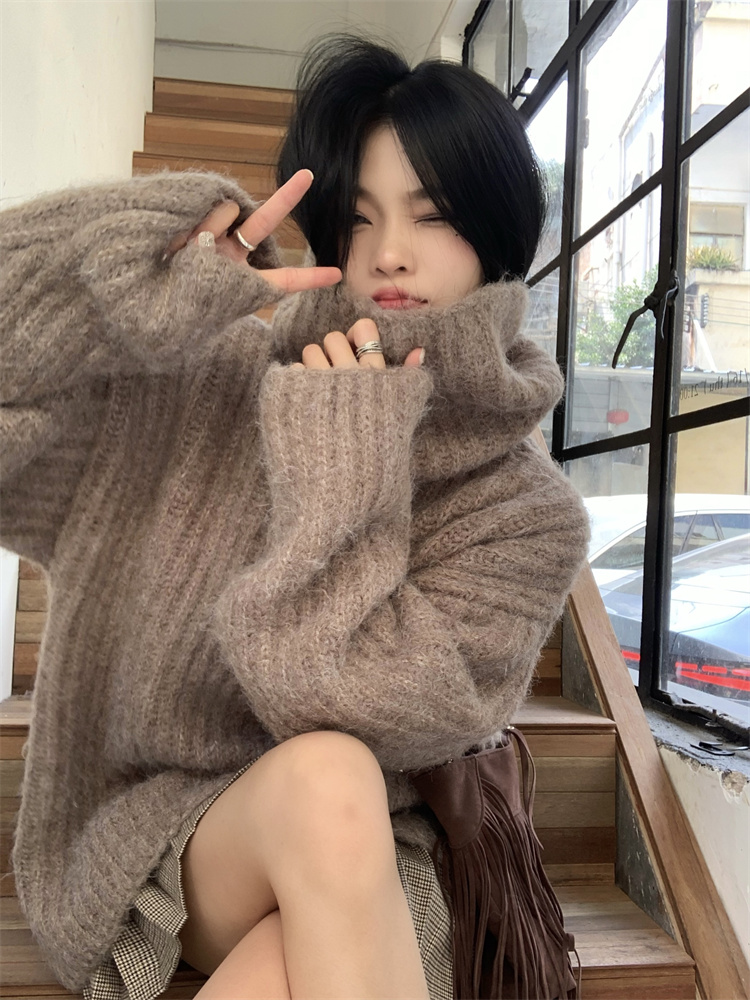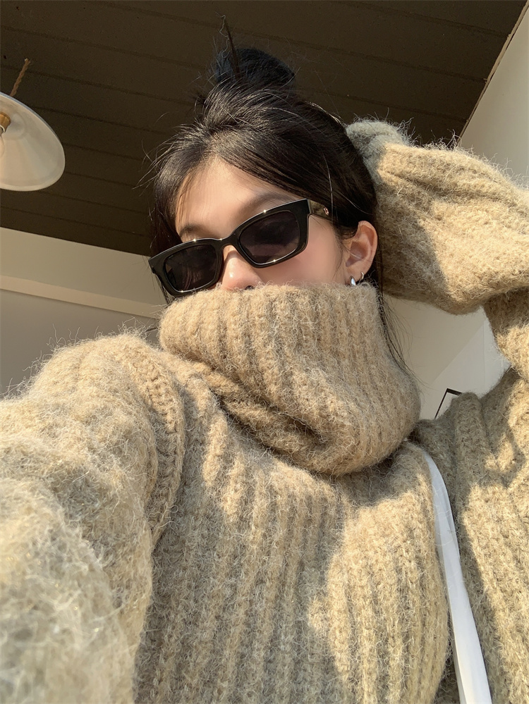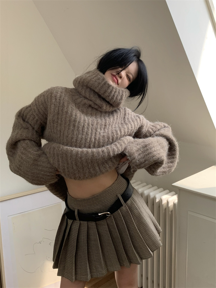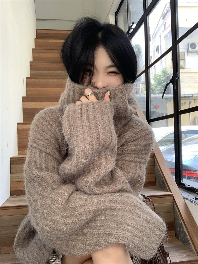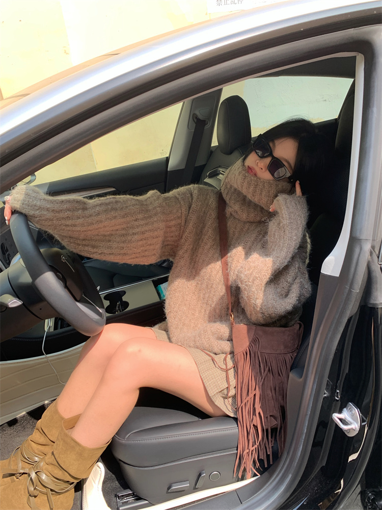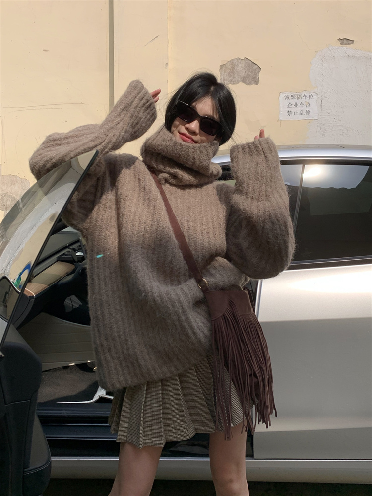 kumikumi慵懶風純色高領坑條長袖毛衣女2023早秋寬鬆顯瘦百搭上衣