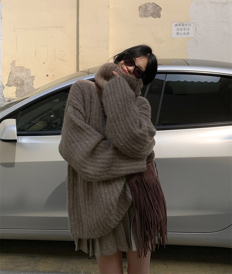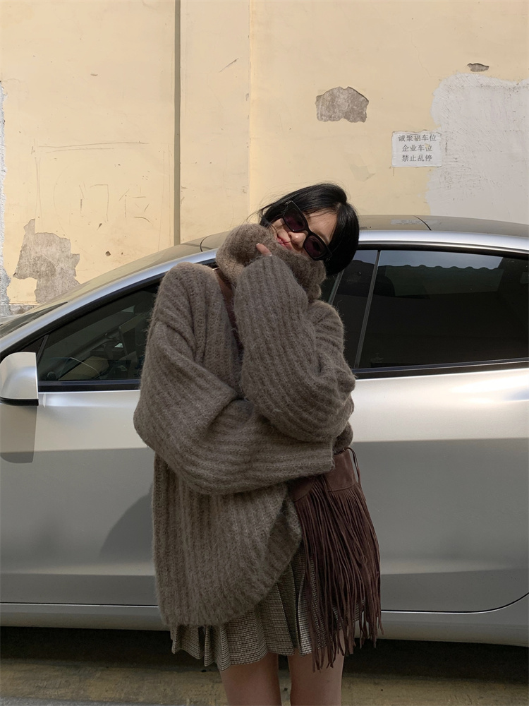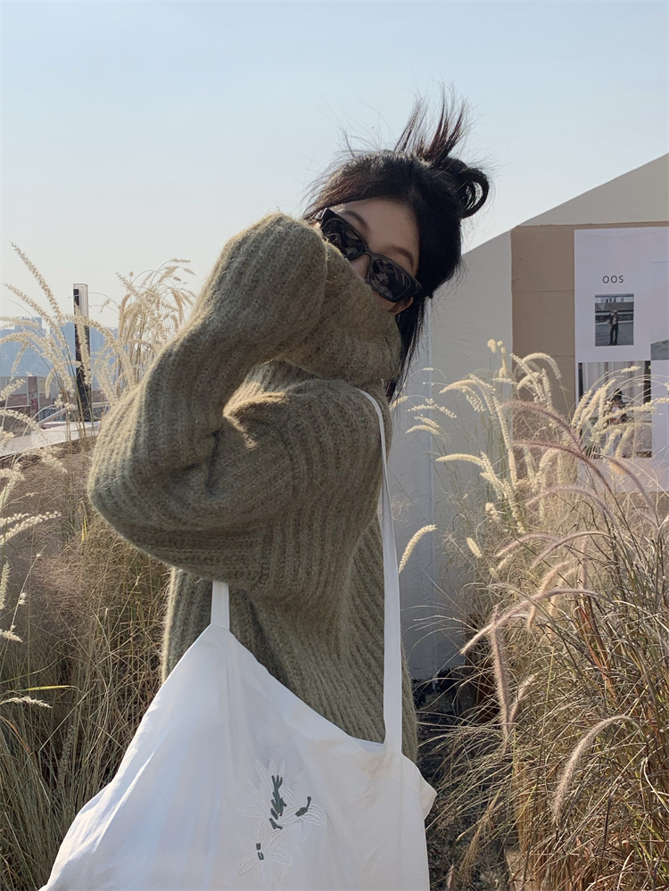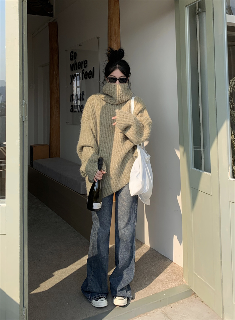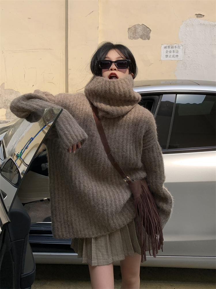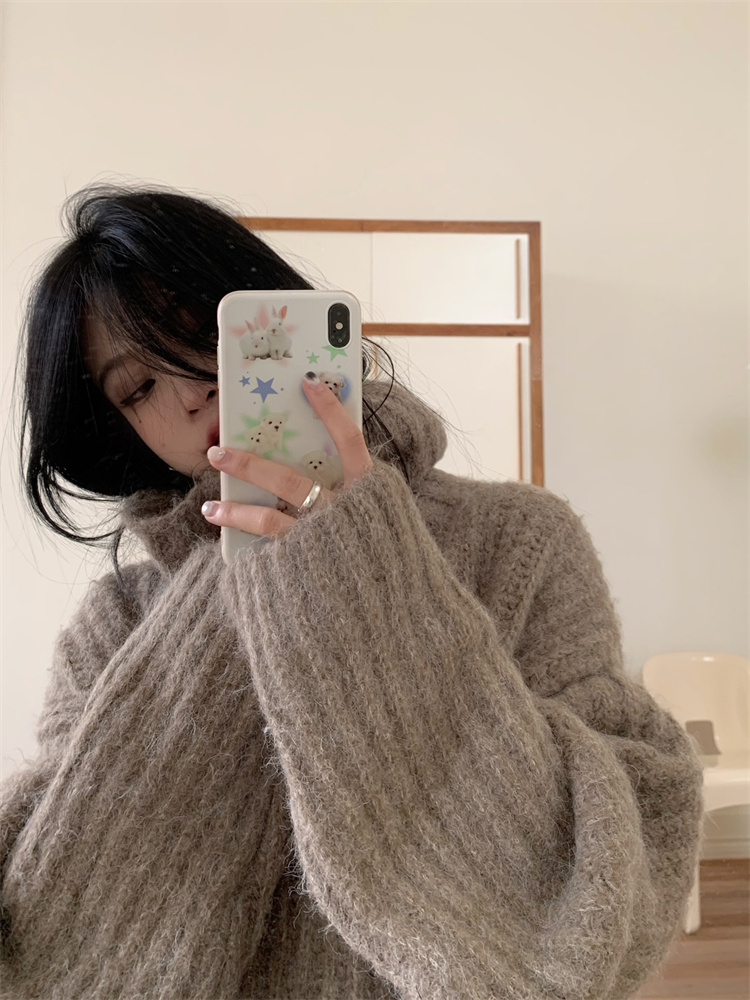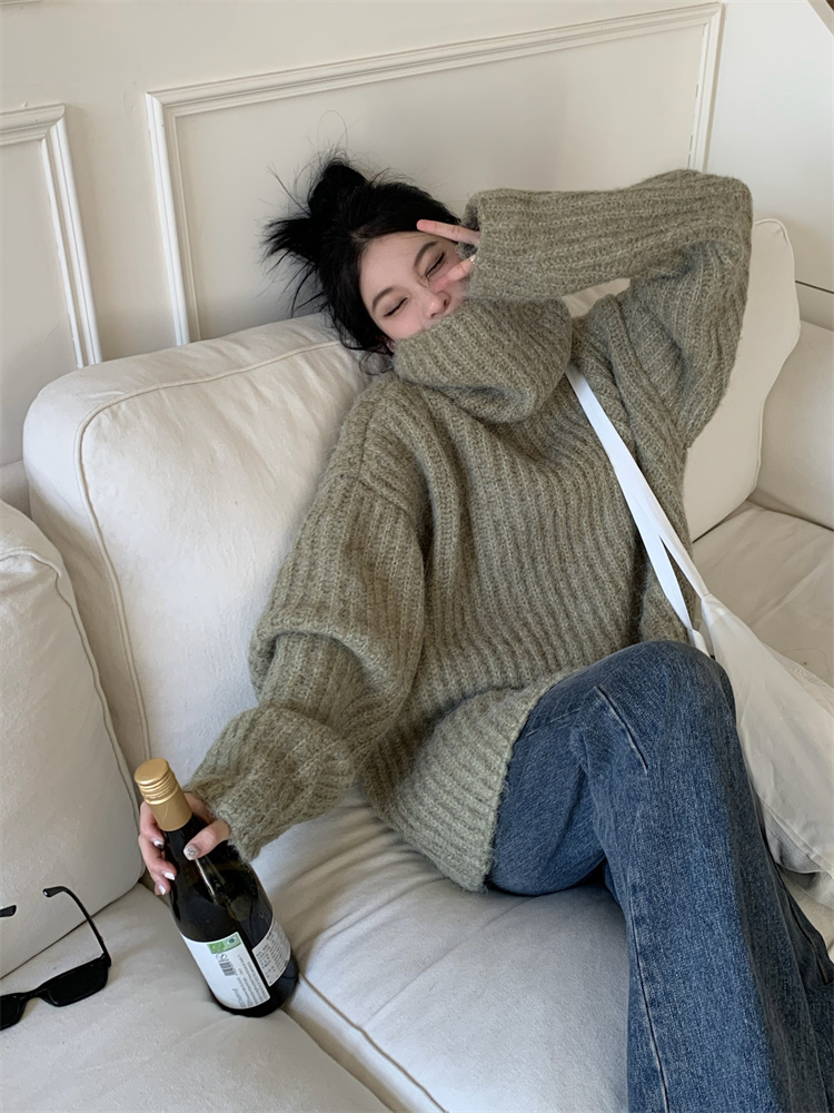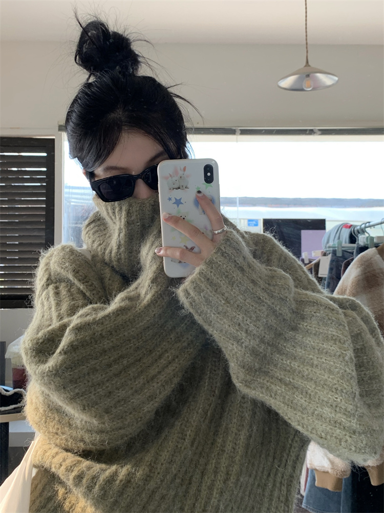 kumikumi慵懶風純色高領坑條長袖毛衣女2023早秋寬鬆顯瘦百搭上衣