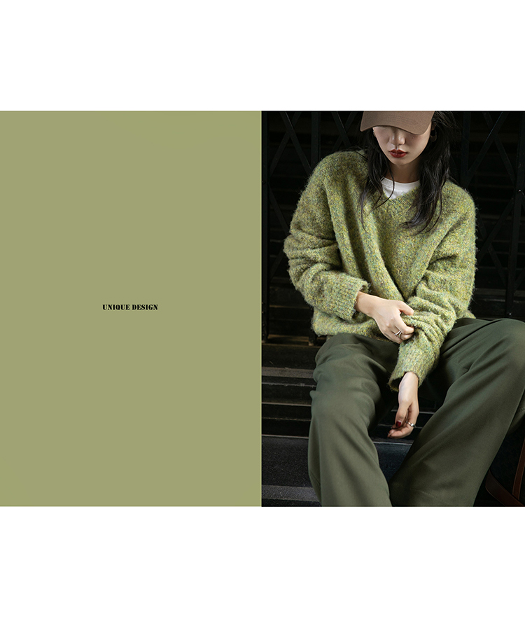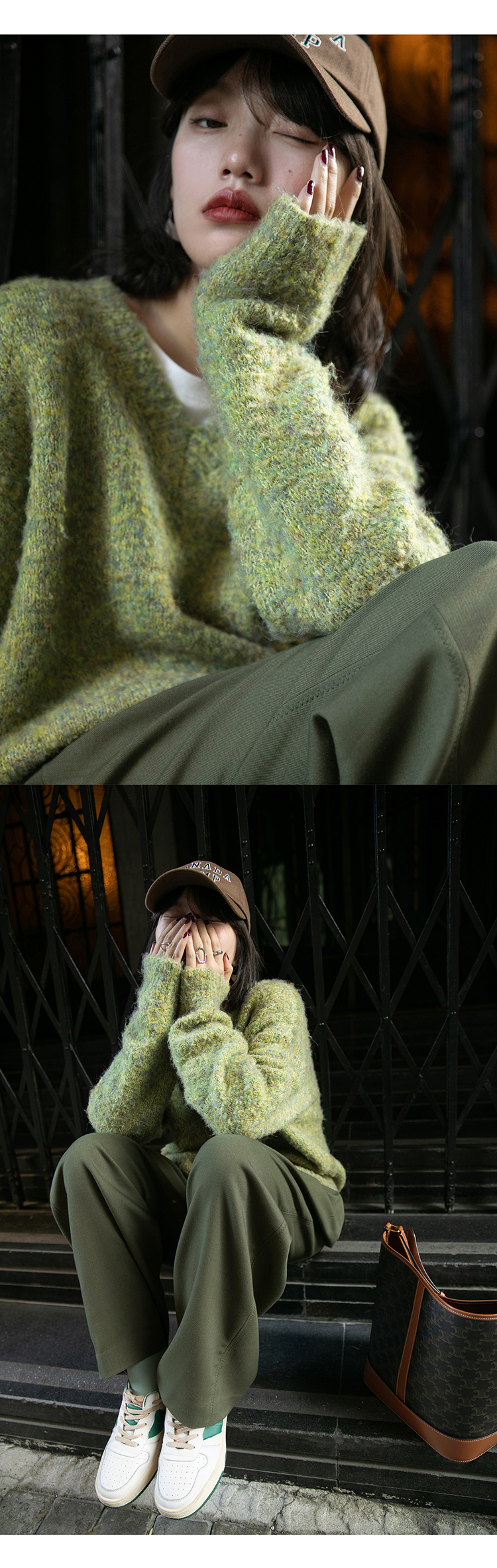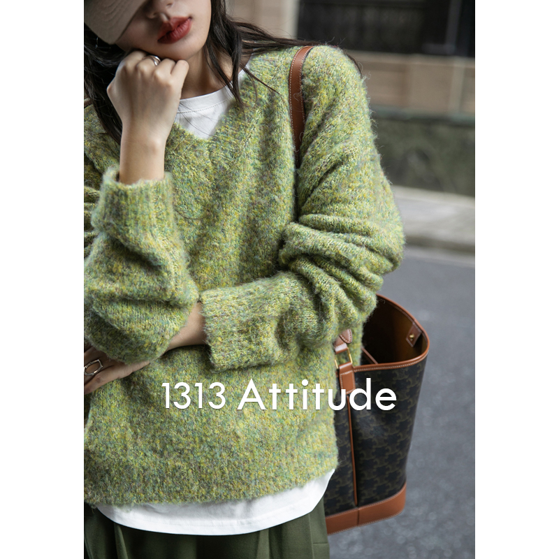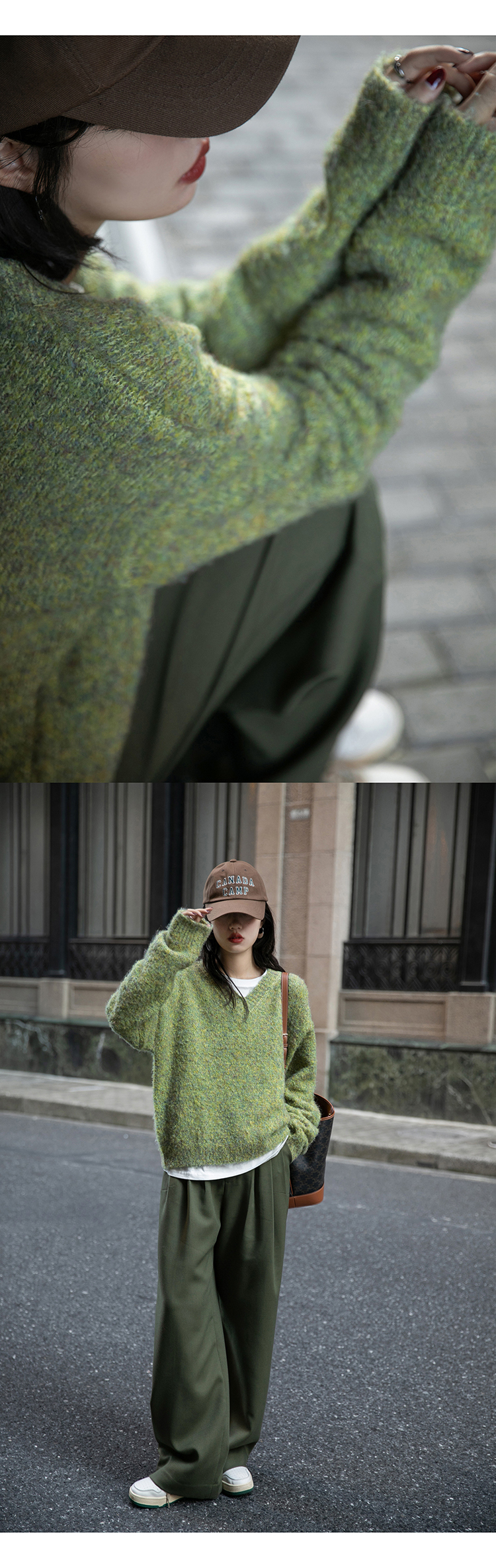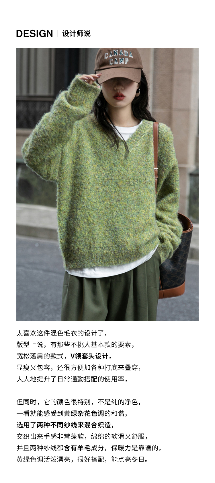 【現貨】1313慵懶復古黃綠雜花紗V領套頭針織羊毛衫糯軟寬鬆毛衣