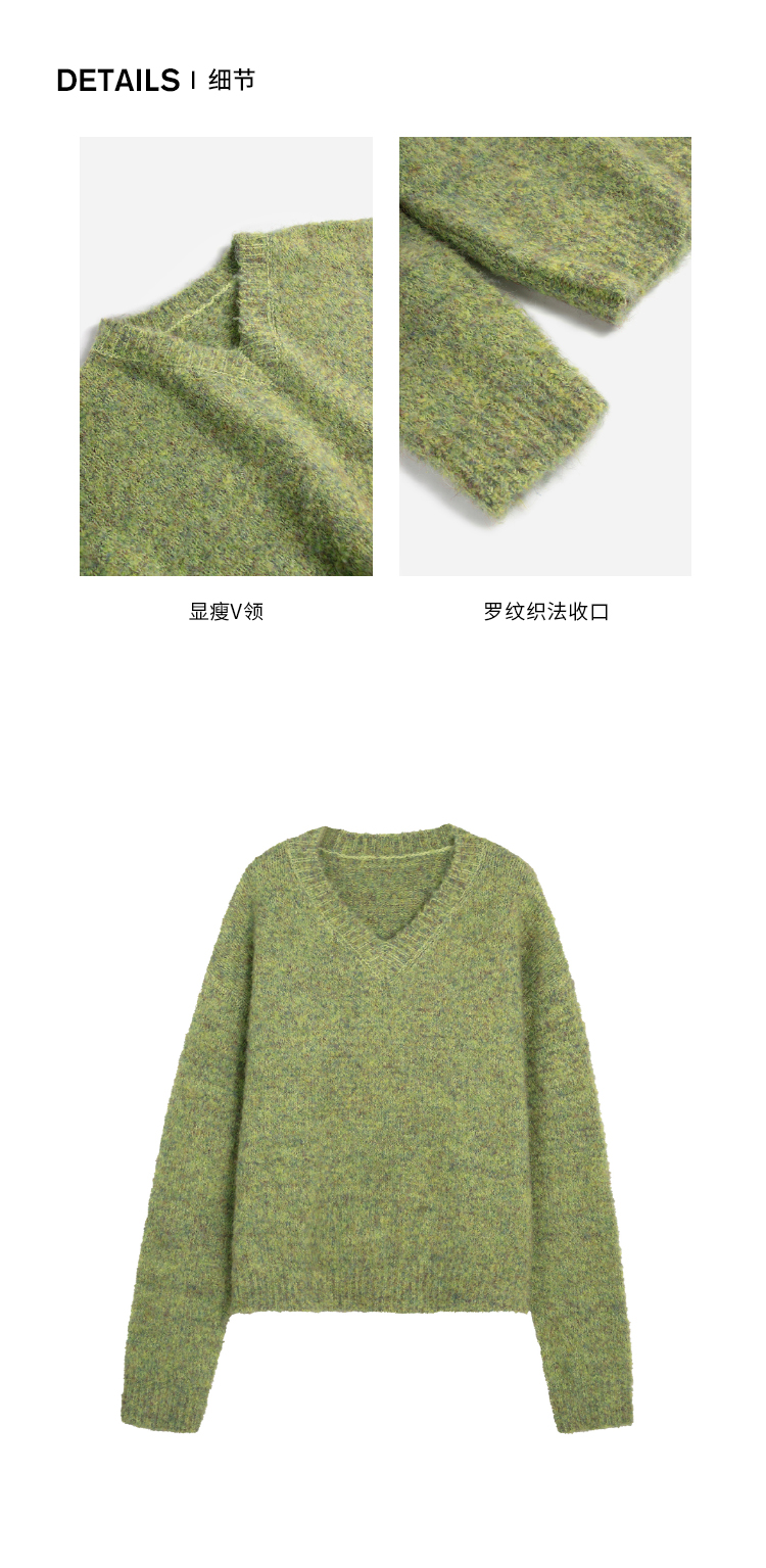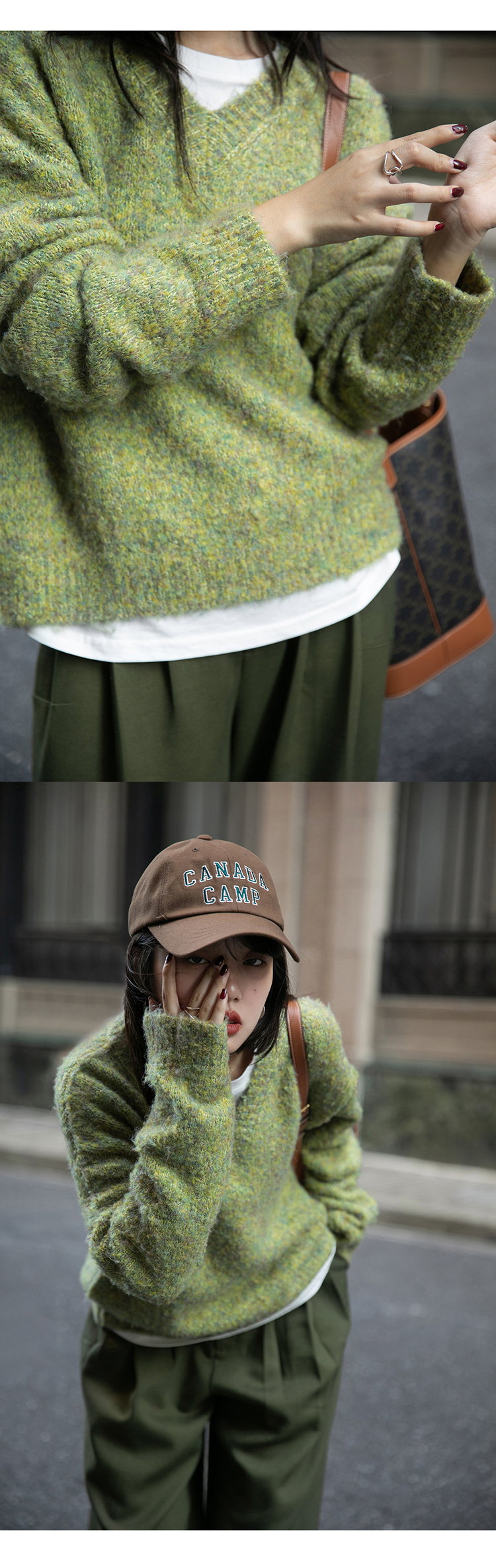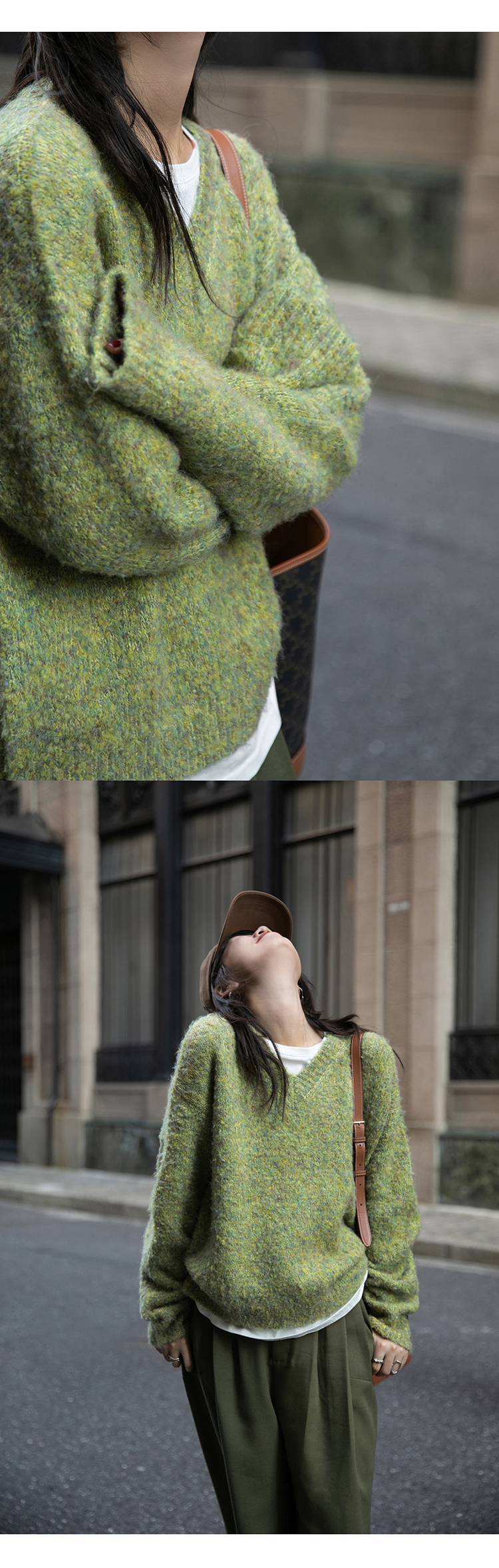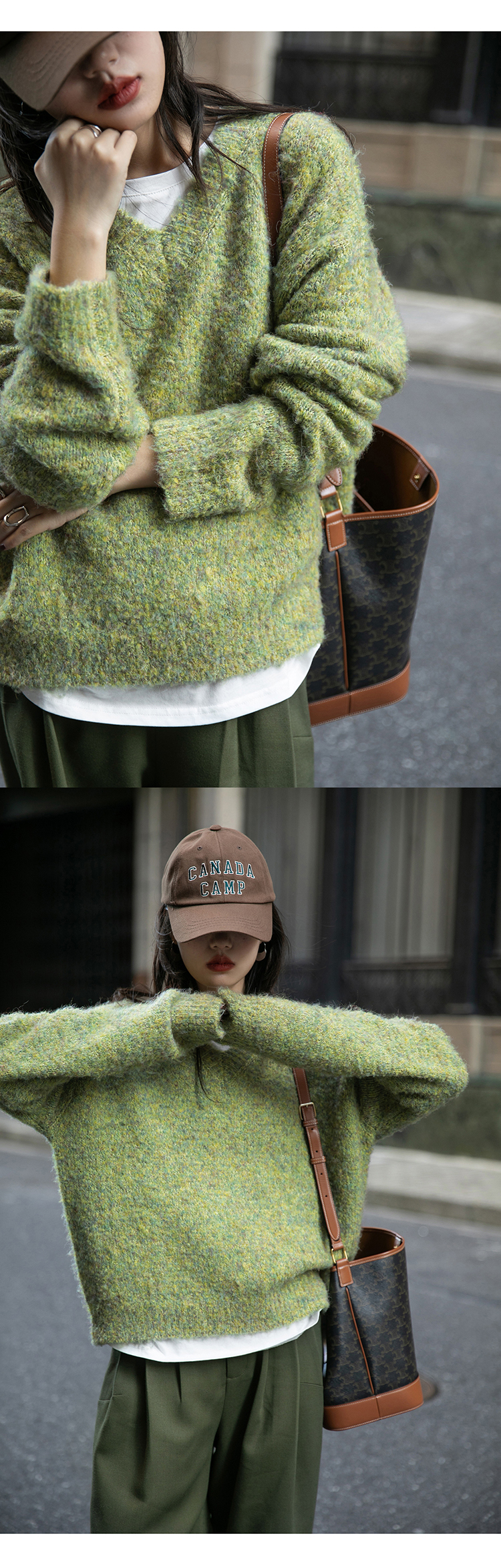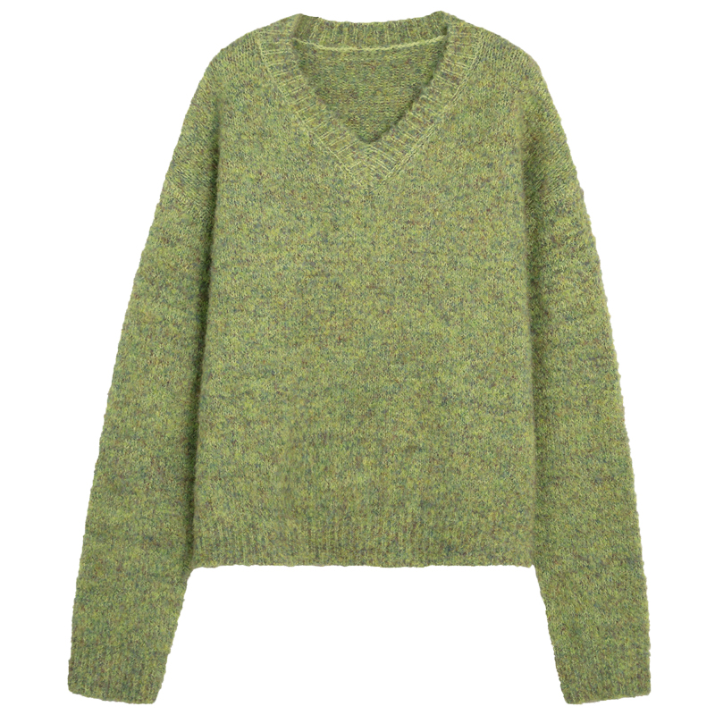 【現貨】1313慵懶復古黃綠雜花紗V領套頭針織羊毛衫糯軟寬鬆毛衣