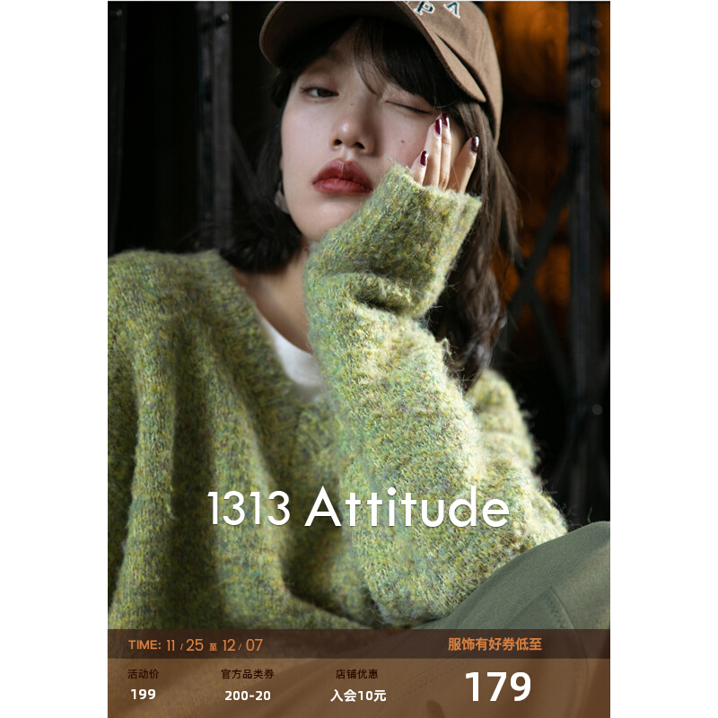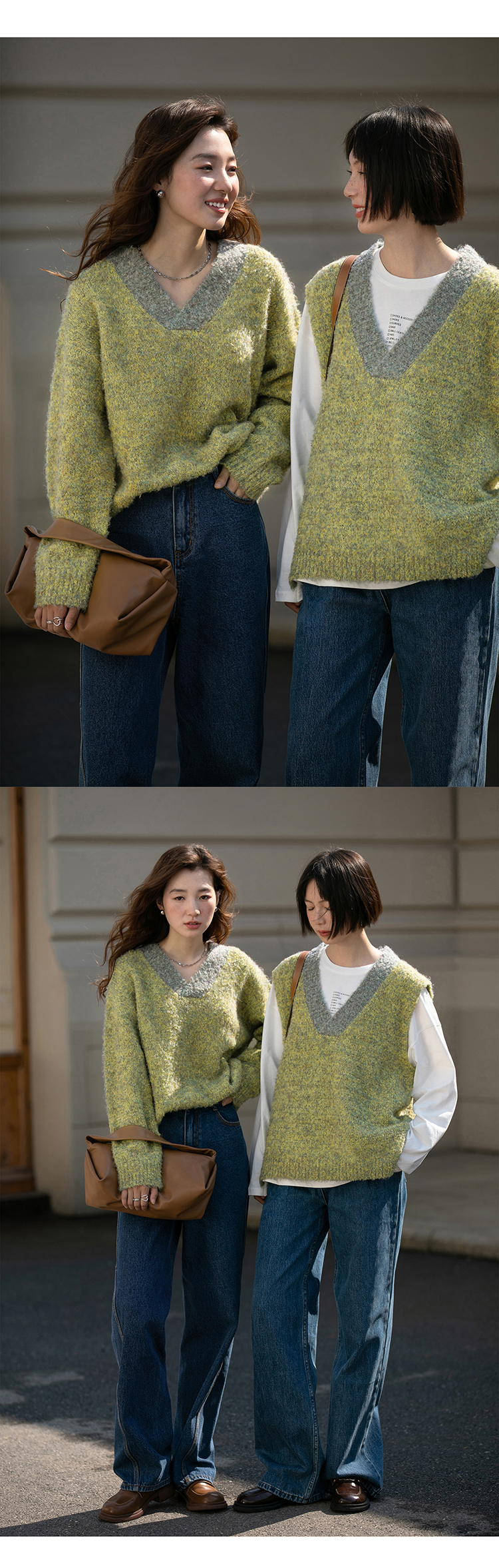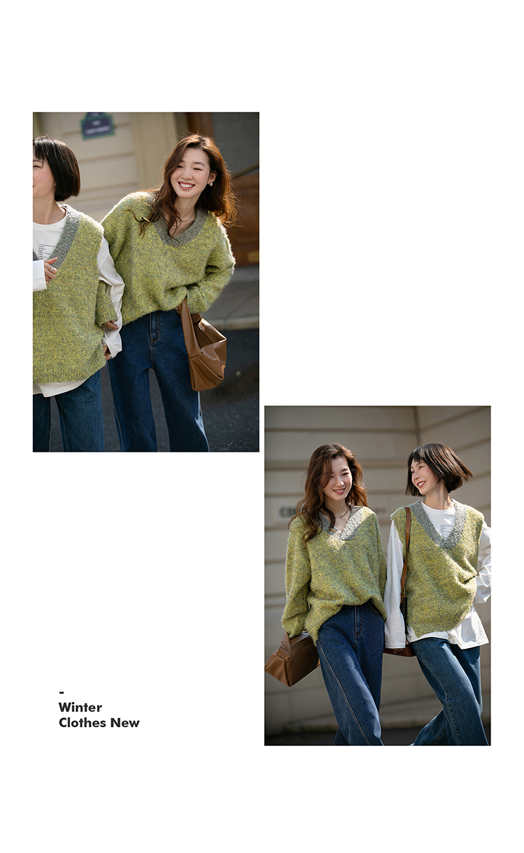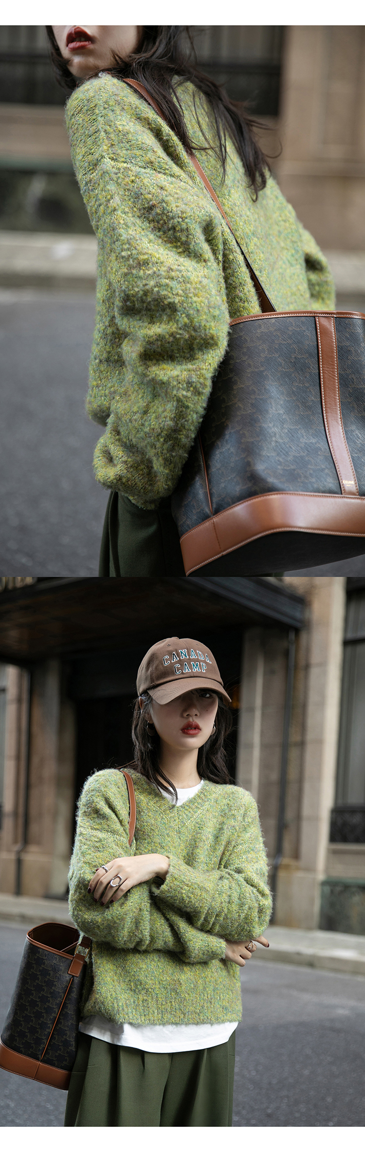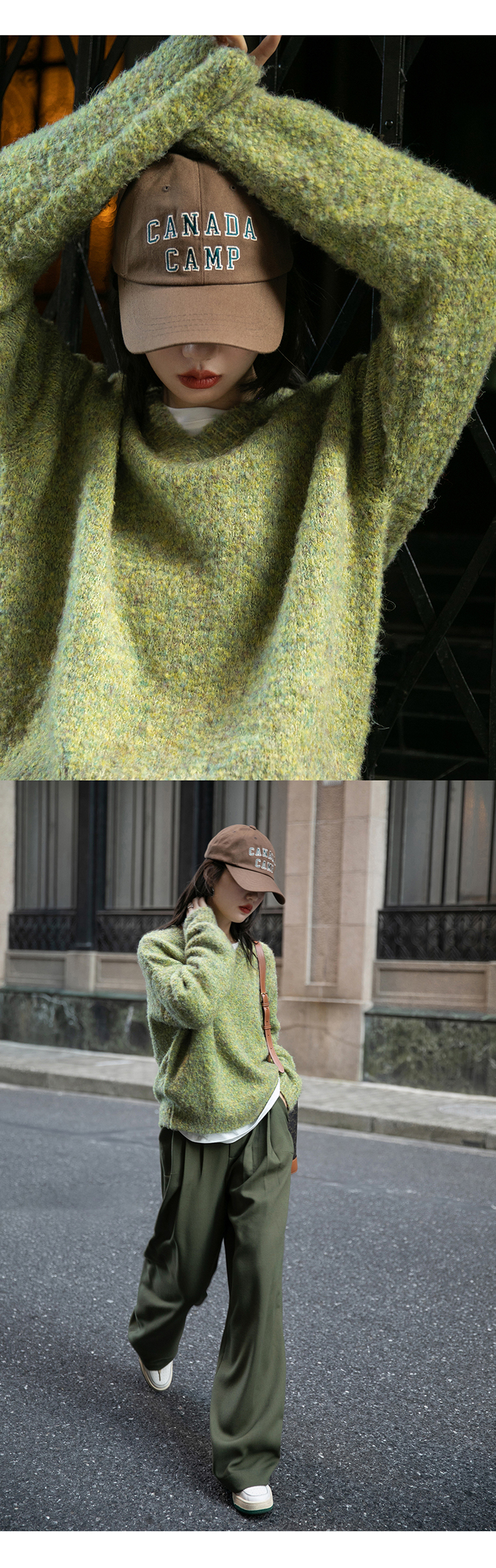 【現貨】1313慵懶復古黃綠雜花紗V領套頭針織羊毛衫糯軟寬鬆毛衣