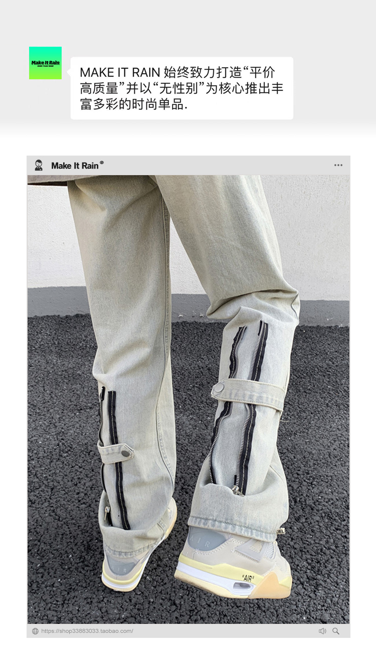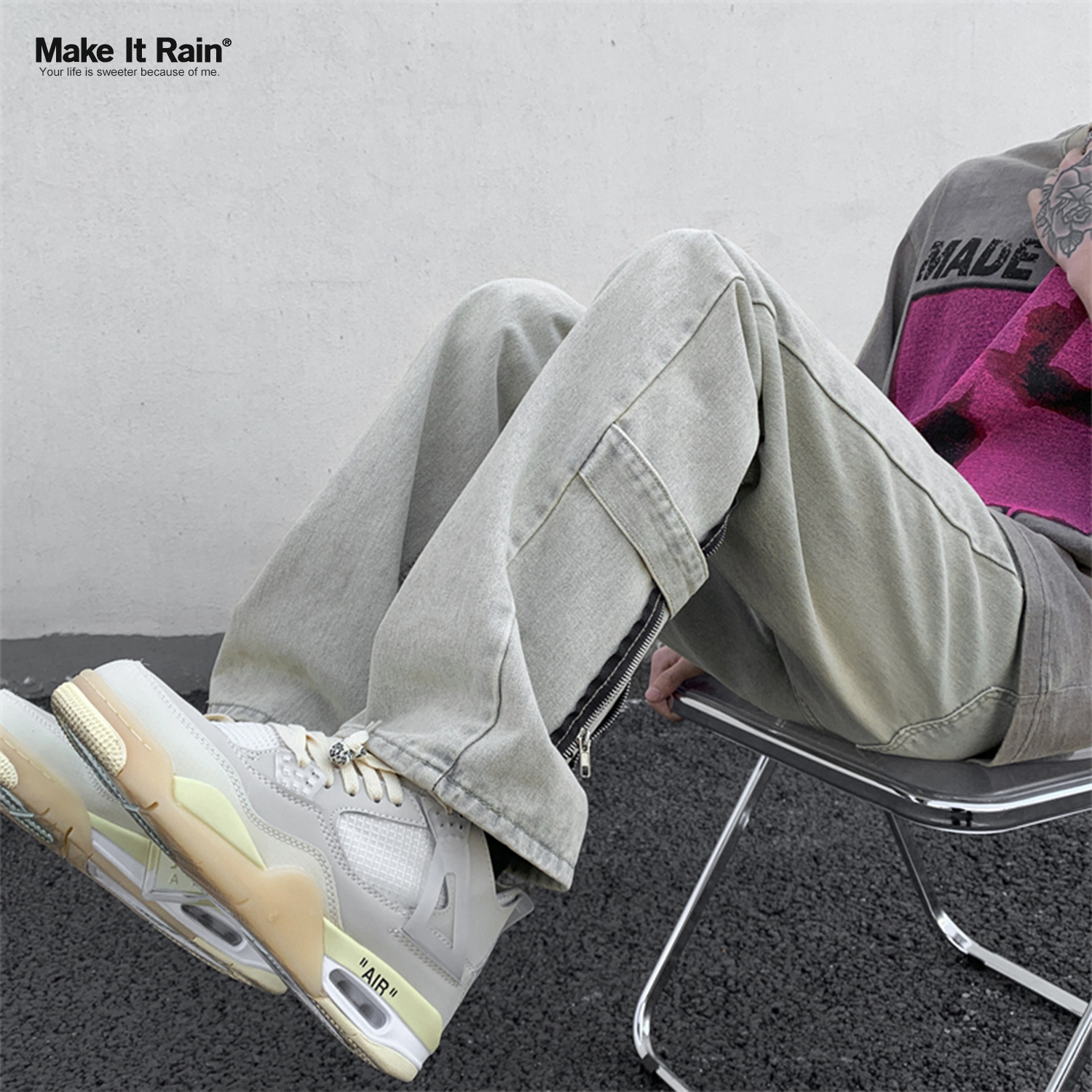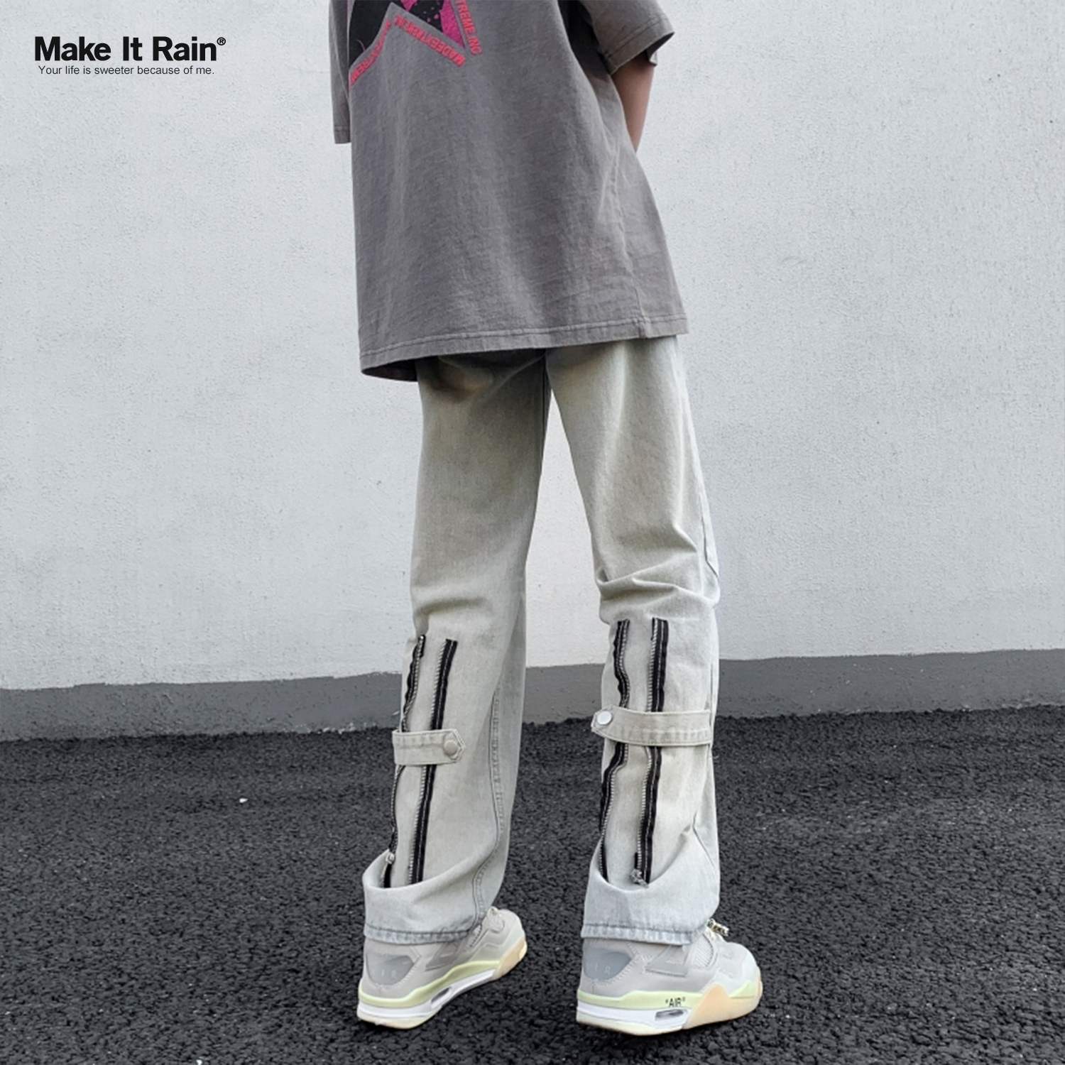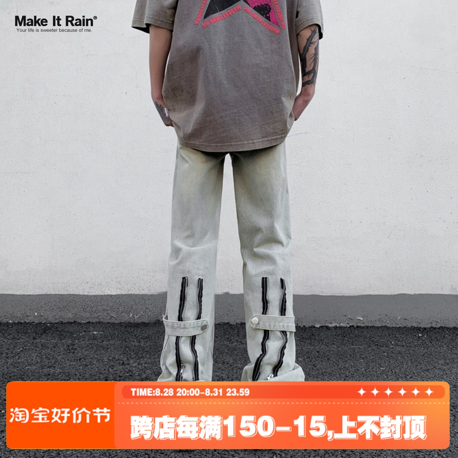 MAKE IT RAIN微喇叭設計感拉鍊牛仔褲男女美式高街秋季直筒長褲子