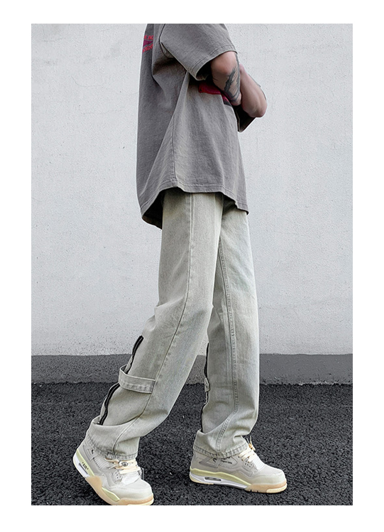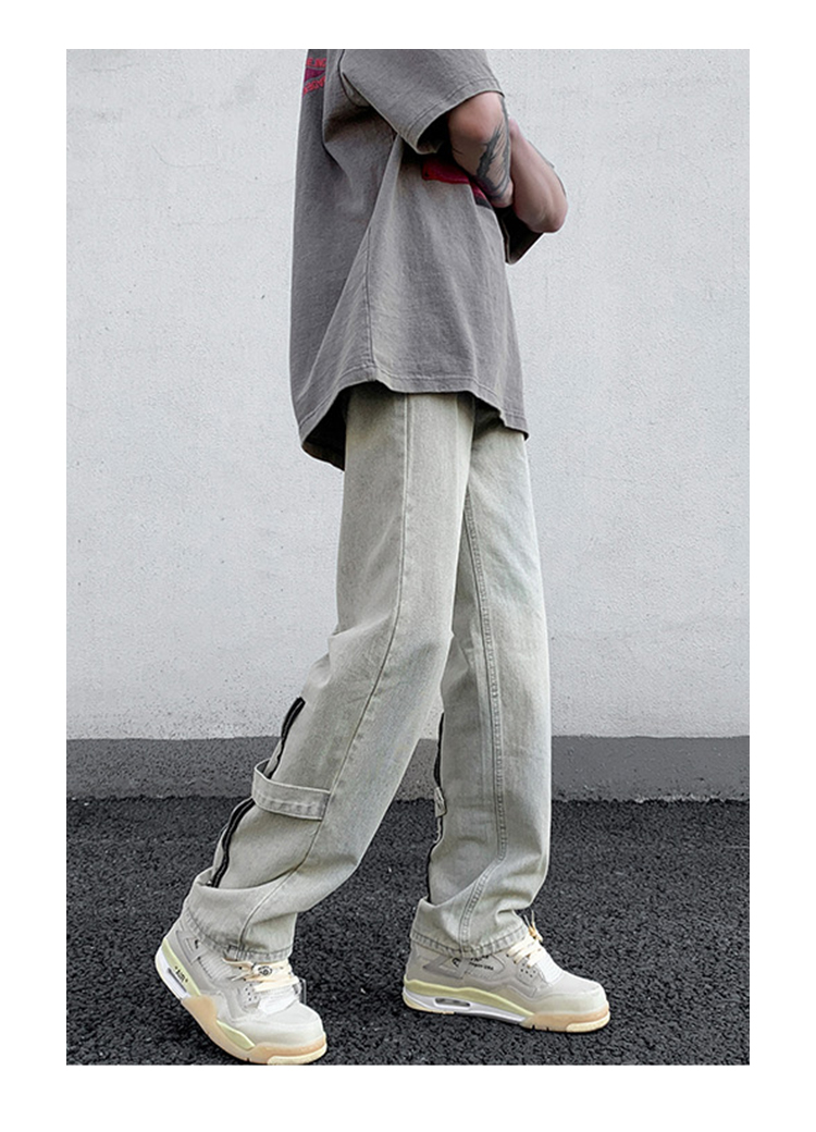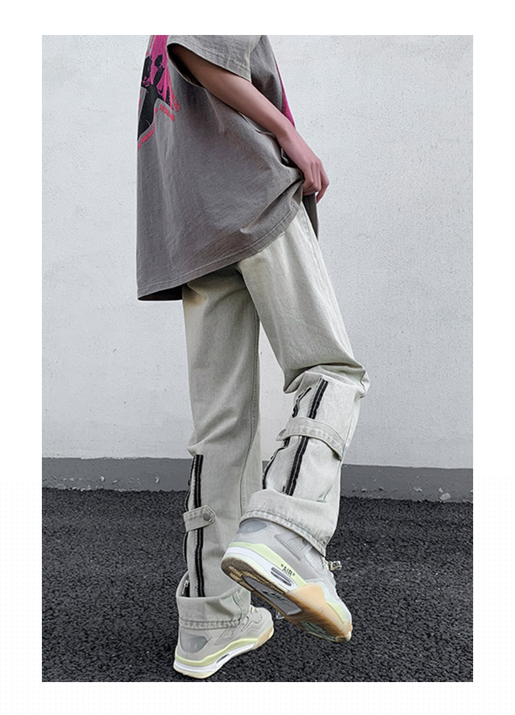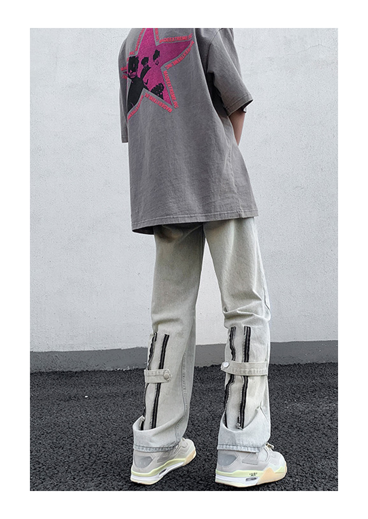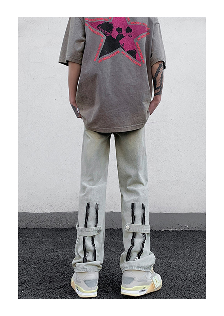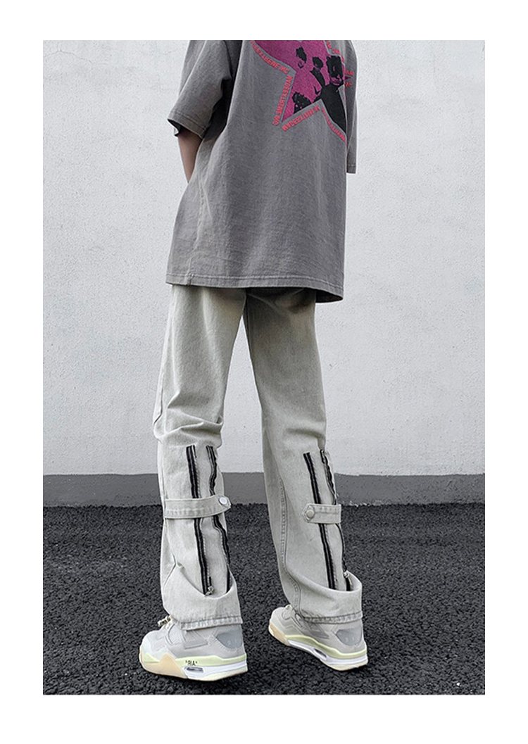 MAKE IT RAIN微喇叭設計感拉鍊牛仔褲男女美式高街秋季直筒長褲子