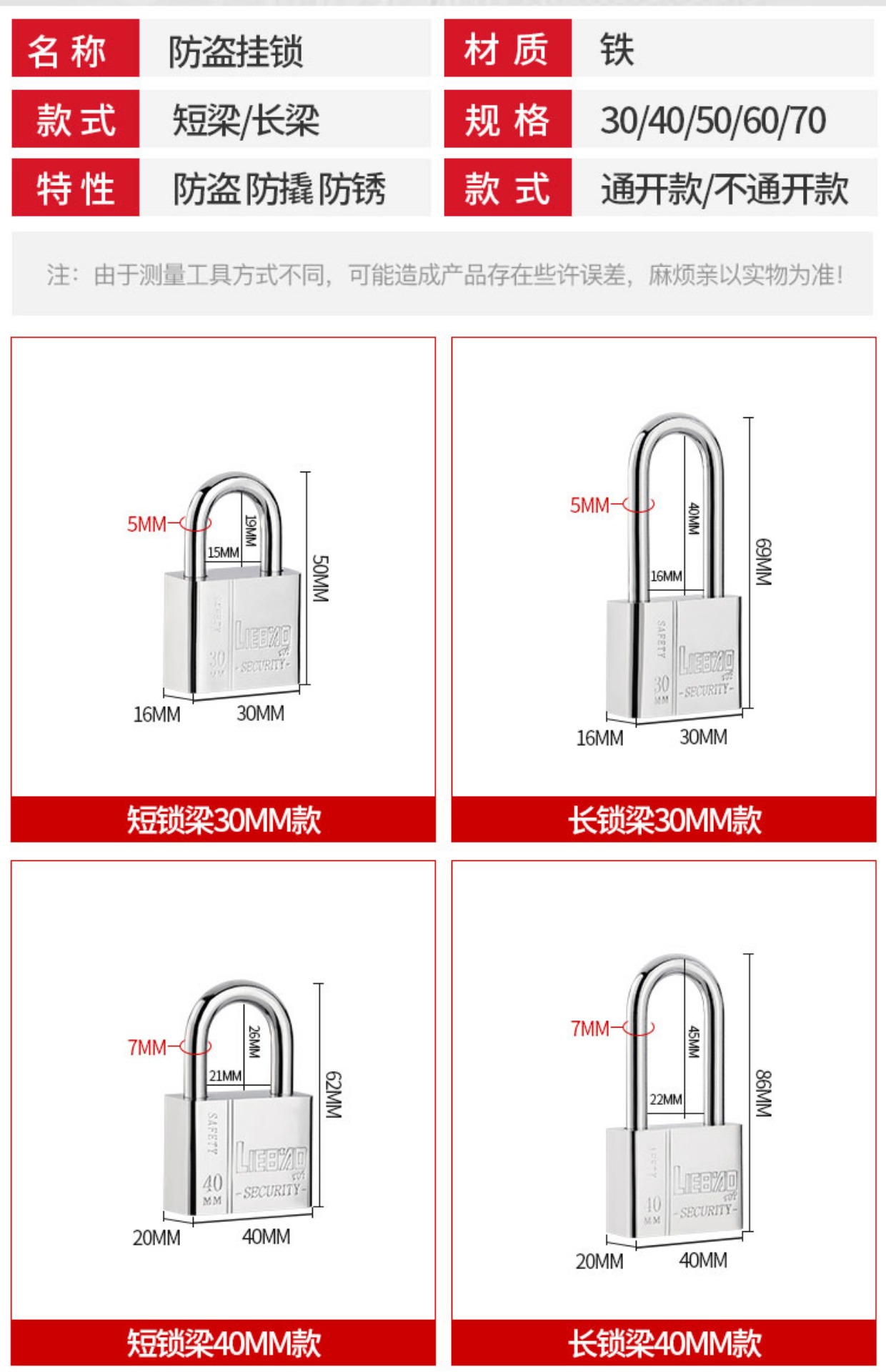 规格 30短款挂锁【独立】4把钥匙 【热卖款】,30短款挂锁【通开】1把钥匙 【工程款】,40短款挂锁【独立】4把钥匙 【热卖款】,40短款挂锁【通开】1把钥匙 【工程款】,50短款挂锁【独立】4把钥匙 【热卖款】,50短款挂锁【通开】1把钥匙 【工程款】,60短款挂锁【独立】4把钥匙 【热卖款】,60短款挂锁【通开】1把钥匙 【工程款】,70短款挂锁【独立】4把钥匙 【热卖款】,70短款挂锁【通开】1把钥匙 【工程款】,30长梁挂锁【独立】4把钥匙 【热卖款】,30长梁挂锁【通开】1把钥匙 【工程款】,40长梁挂锁【独立】4把钥匙 【热卖款】,40长梁挂锁【通开】1把钥匙 【工程款】,50长梁挂锁【独立】4把钥匙 【热卖款】,50长梁挂锁【通开】1把钥匙 【工程款】,60长梁挂锁【独立】4把钥匙 【热卖款】,60长梁挂锁【通开】1把钥匙 【工程款】,70长梁挂锁【独立】4把钥匙 【热卖款】,70长梁挂锁【通开】1把钥匙 【工程款】