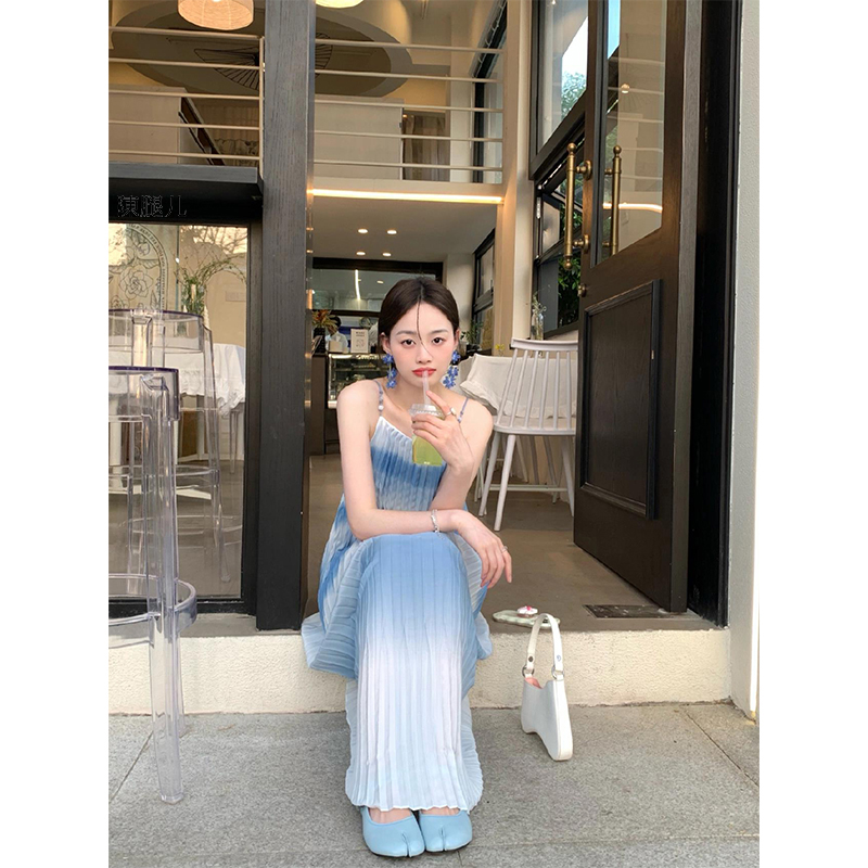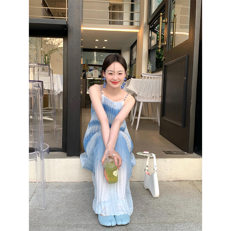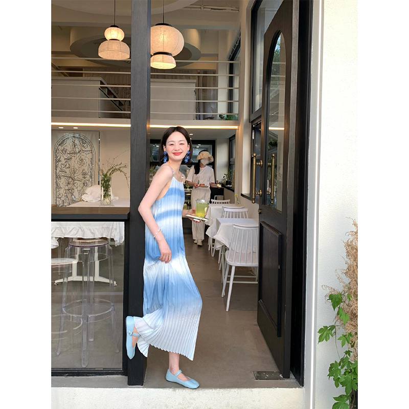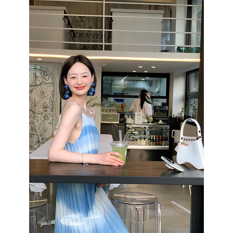 Turn right/陳大腿 法式藍色漸層吊帶洋裝2023夏海邊度假沙灘裙