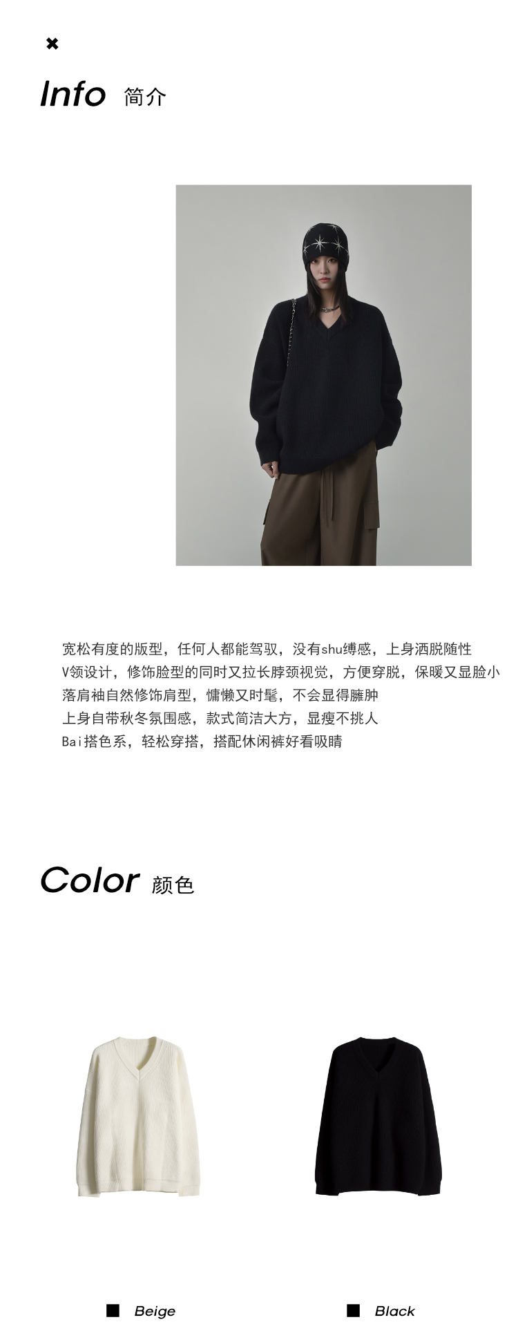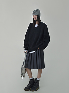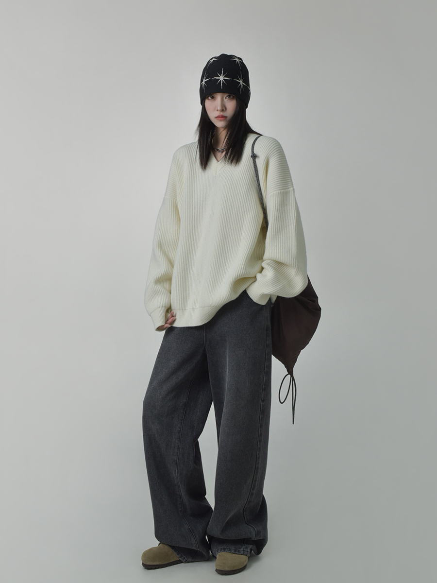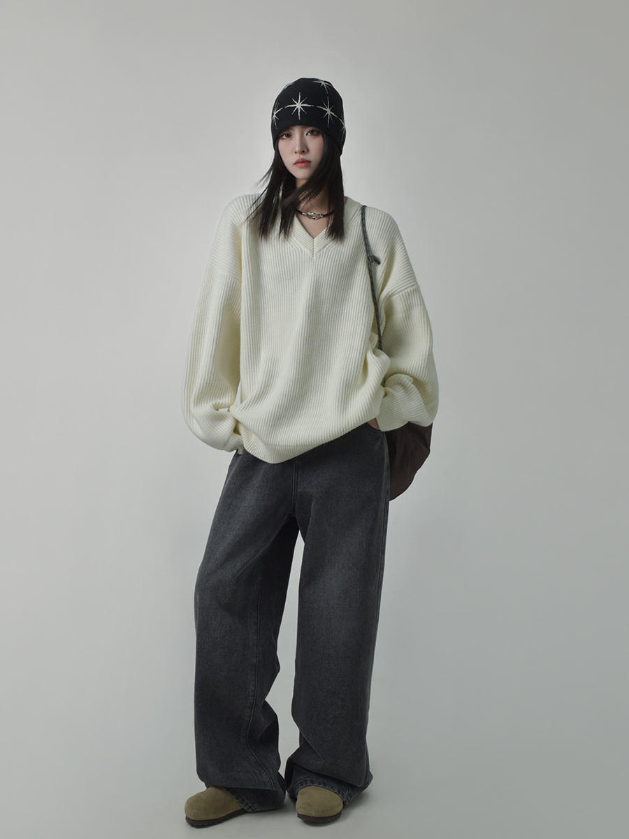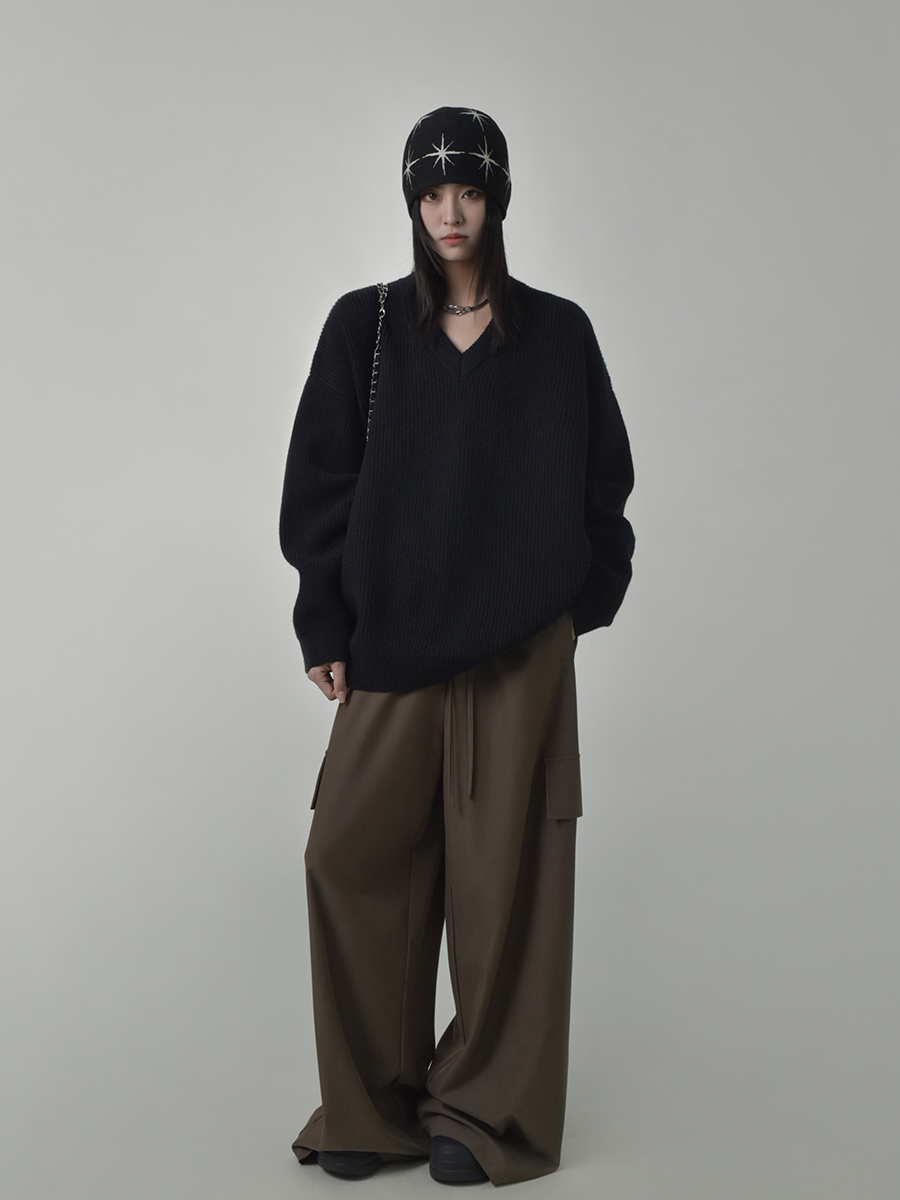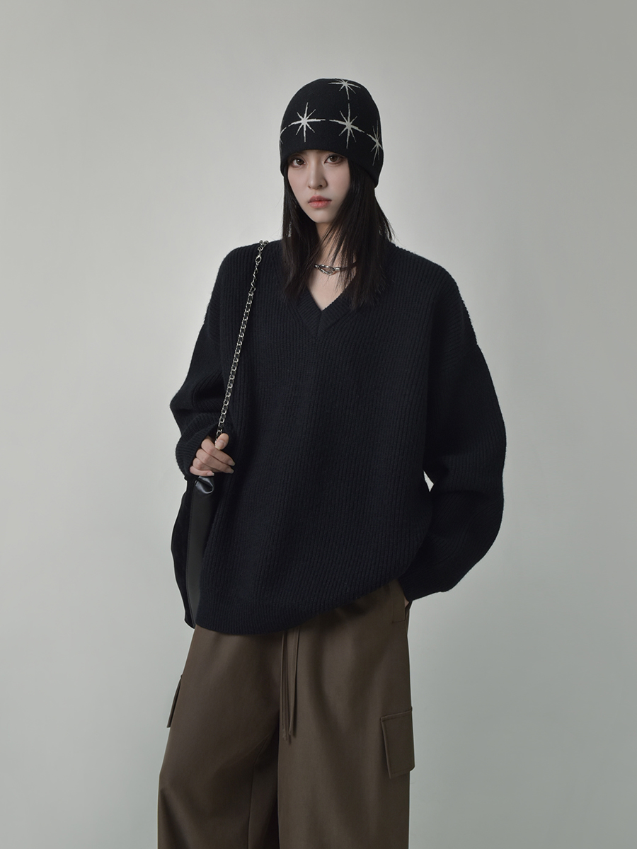 SIXI四喜家秋季 時髦慵懶感軟糯V領毛衣女顯瘦套頭廓形毛針織衫