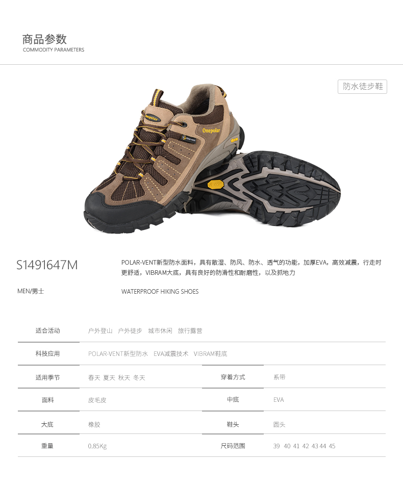 ONEPOLAR極地夏季防滑透氣戶外鞋防水戶外登山鞋男輕耐磨徒步鞋