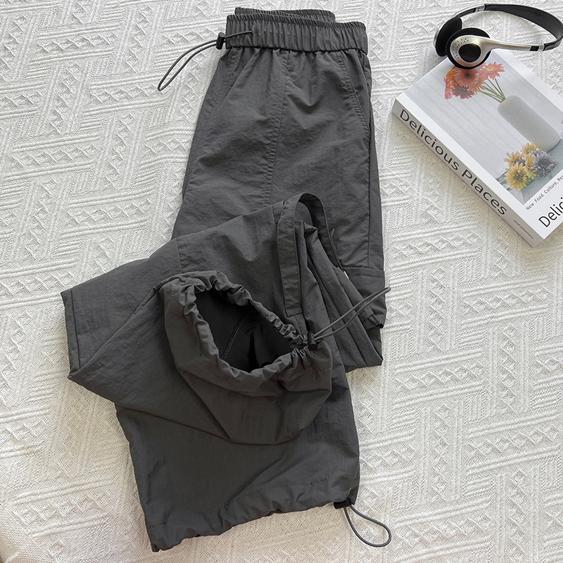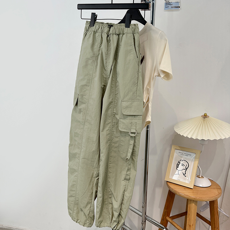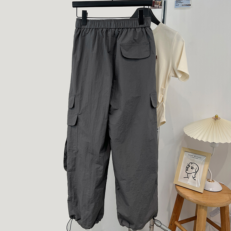 美式機能風辣妹運動工裝褲女夏季薄款鬆緊高腰抽繩束腳闊腿長褲女