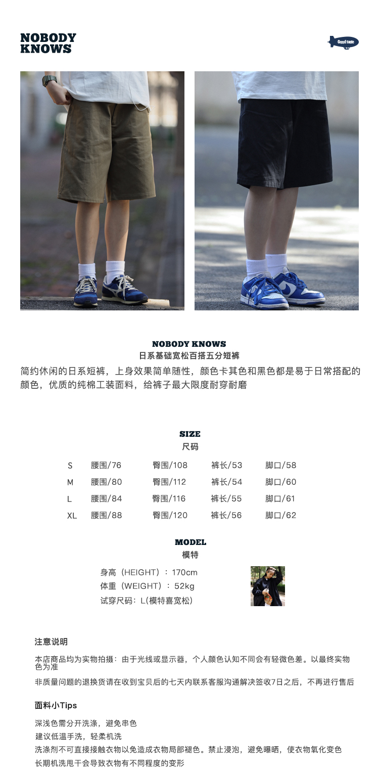 Nobodyknows 夏季日系基礎百搭休閒工作服簡約男女寬鬆五分五分褲短褲