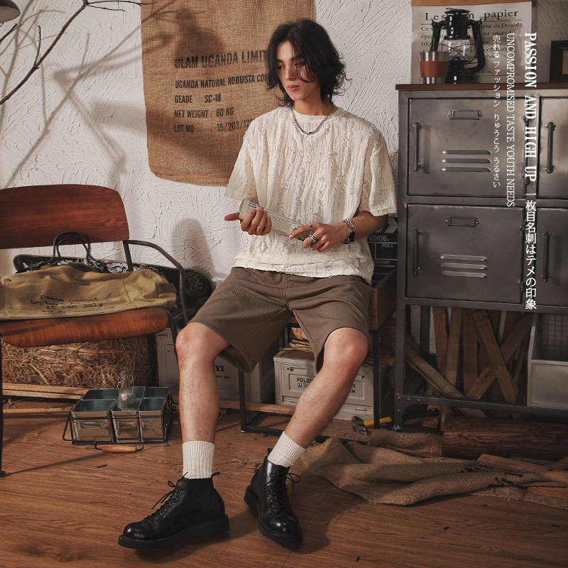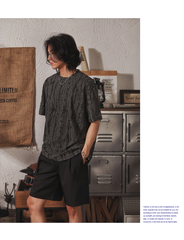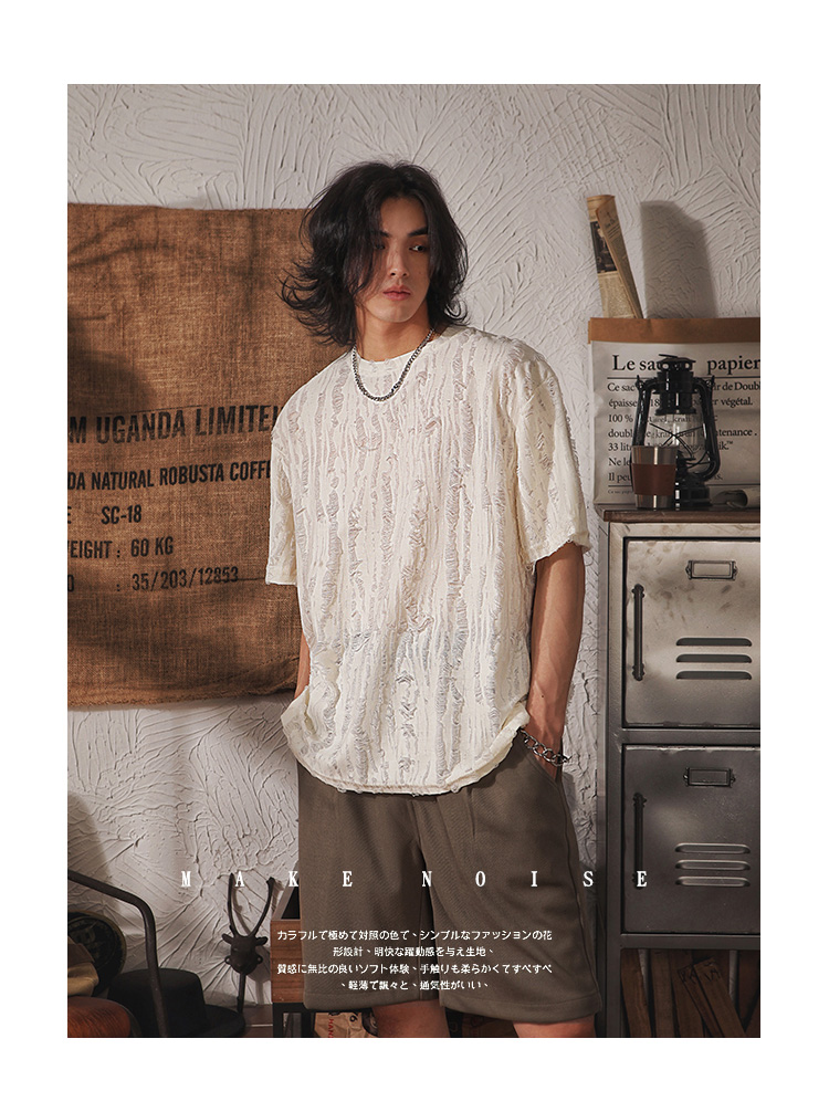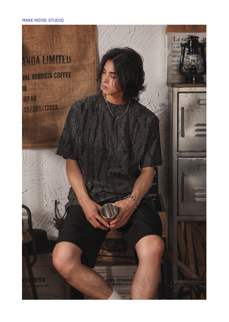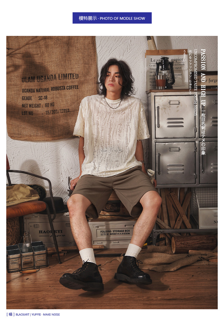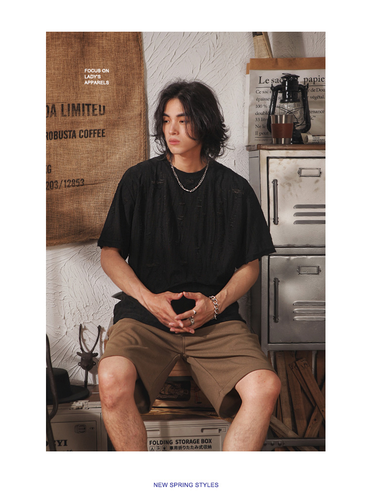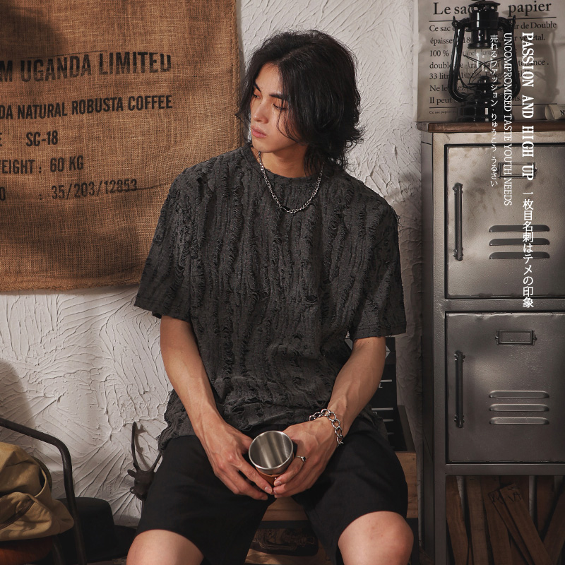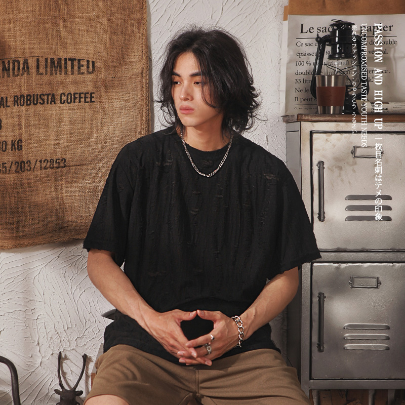 日系復古小眾設計感鏤空破洞短袖T恤男夏季潮牌純色休閒半袖T恤