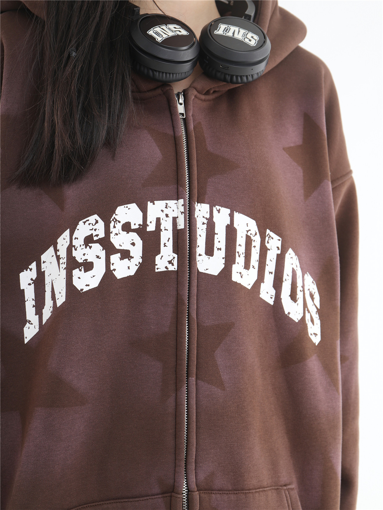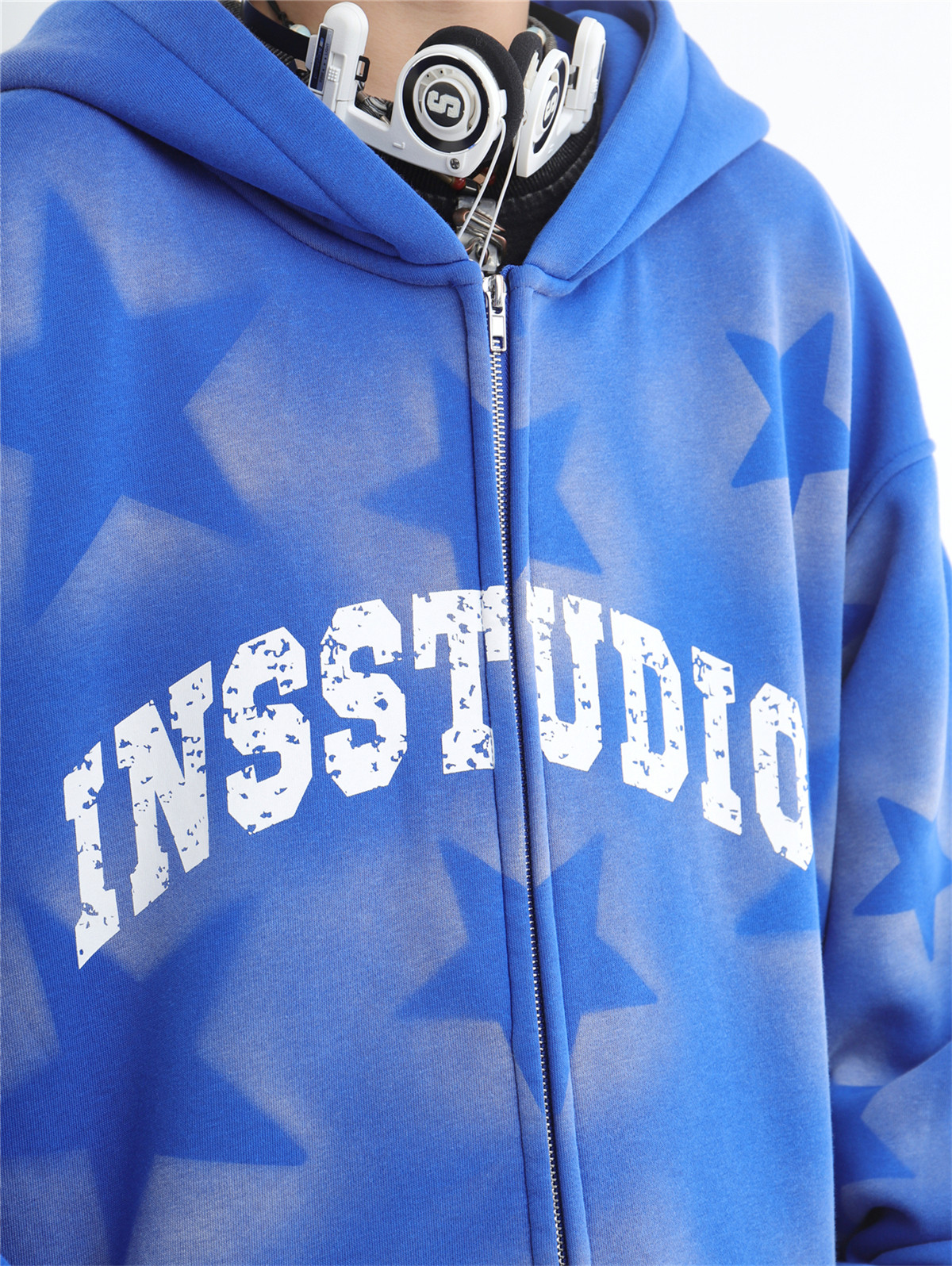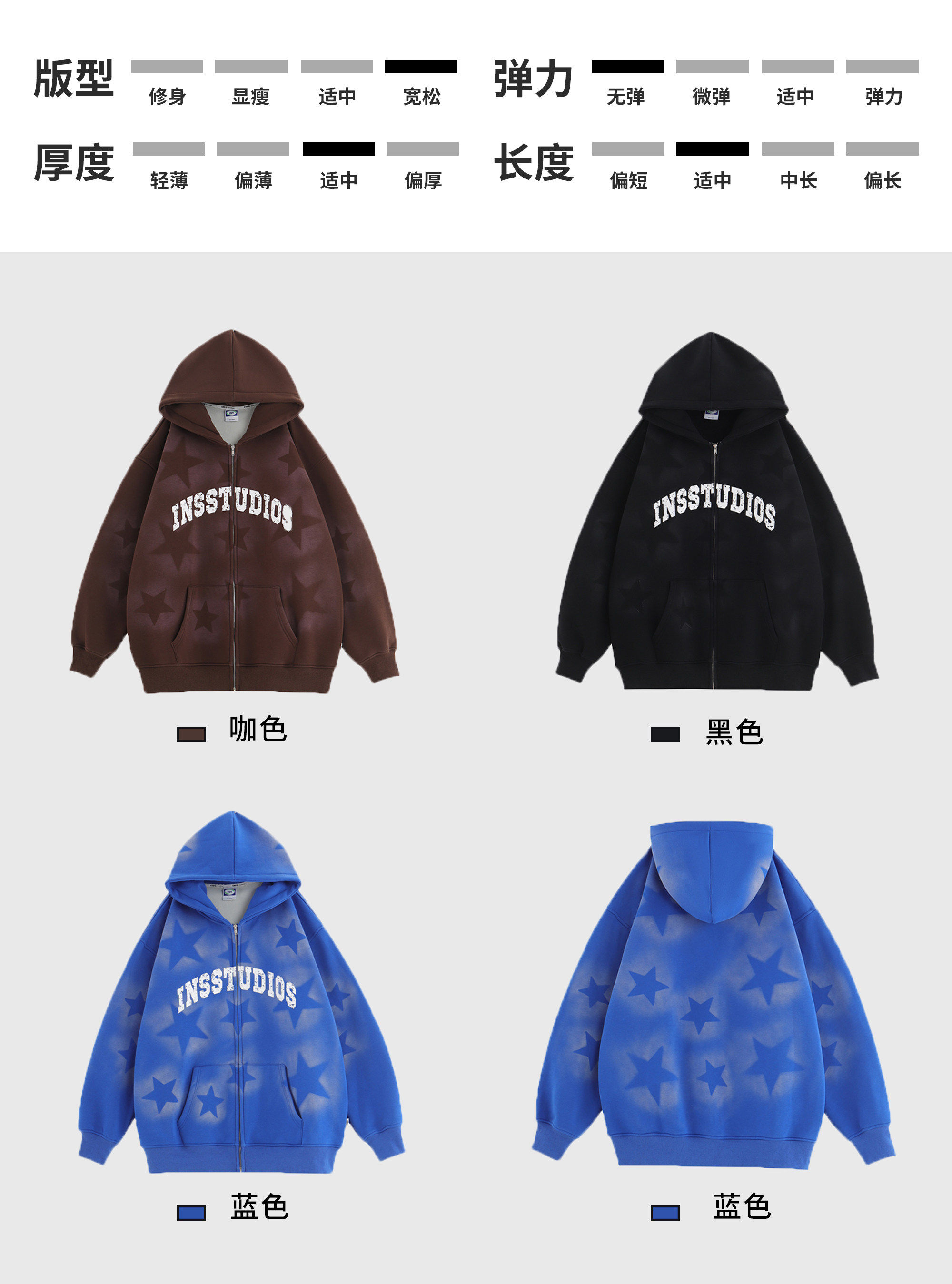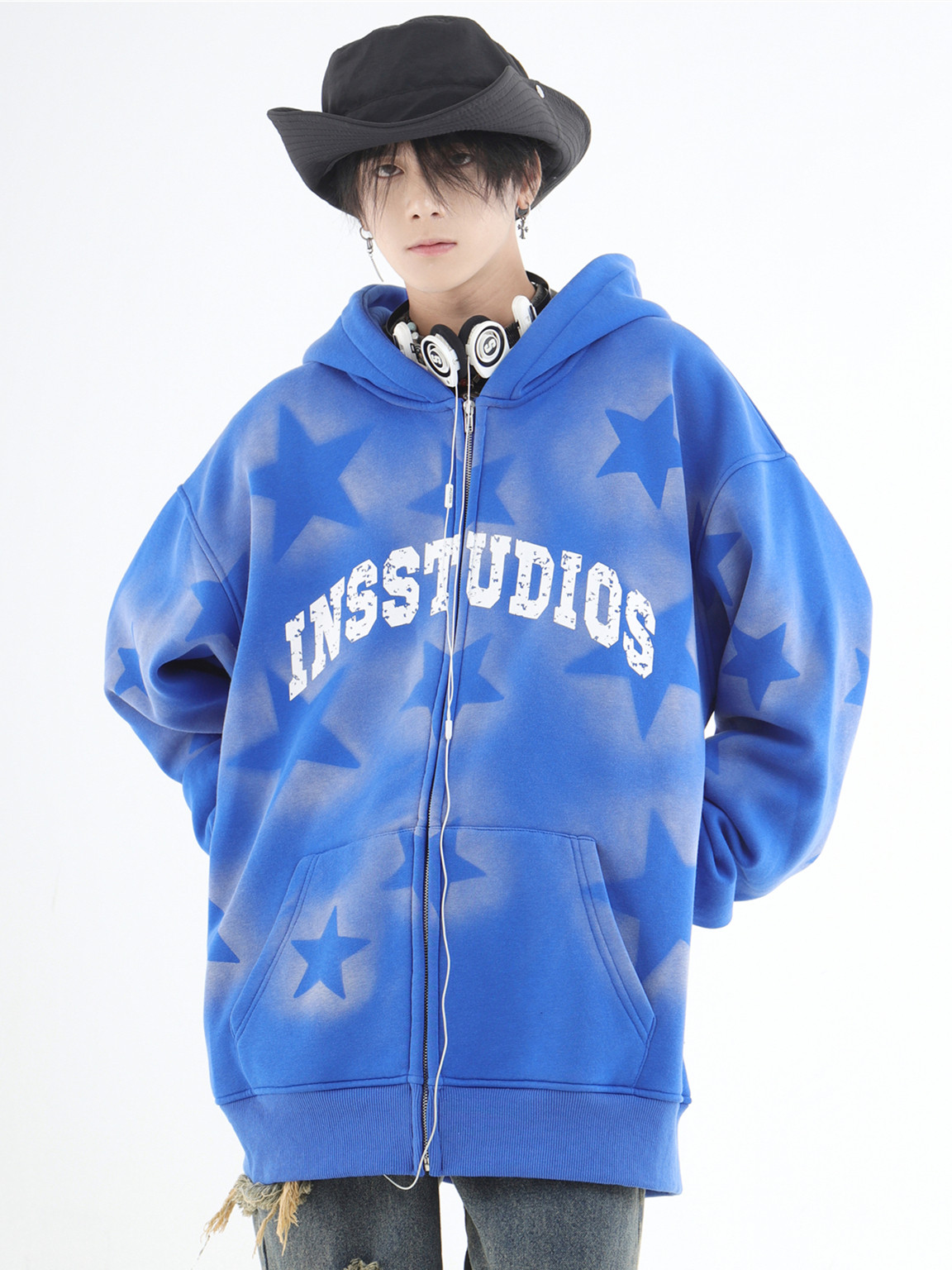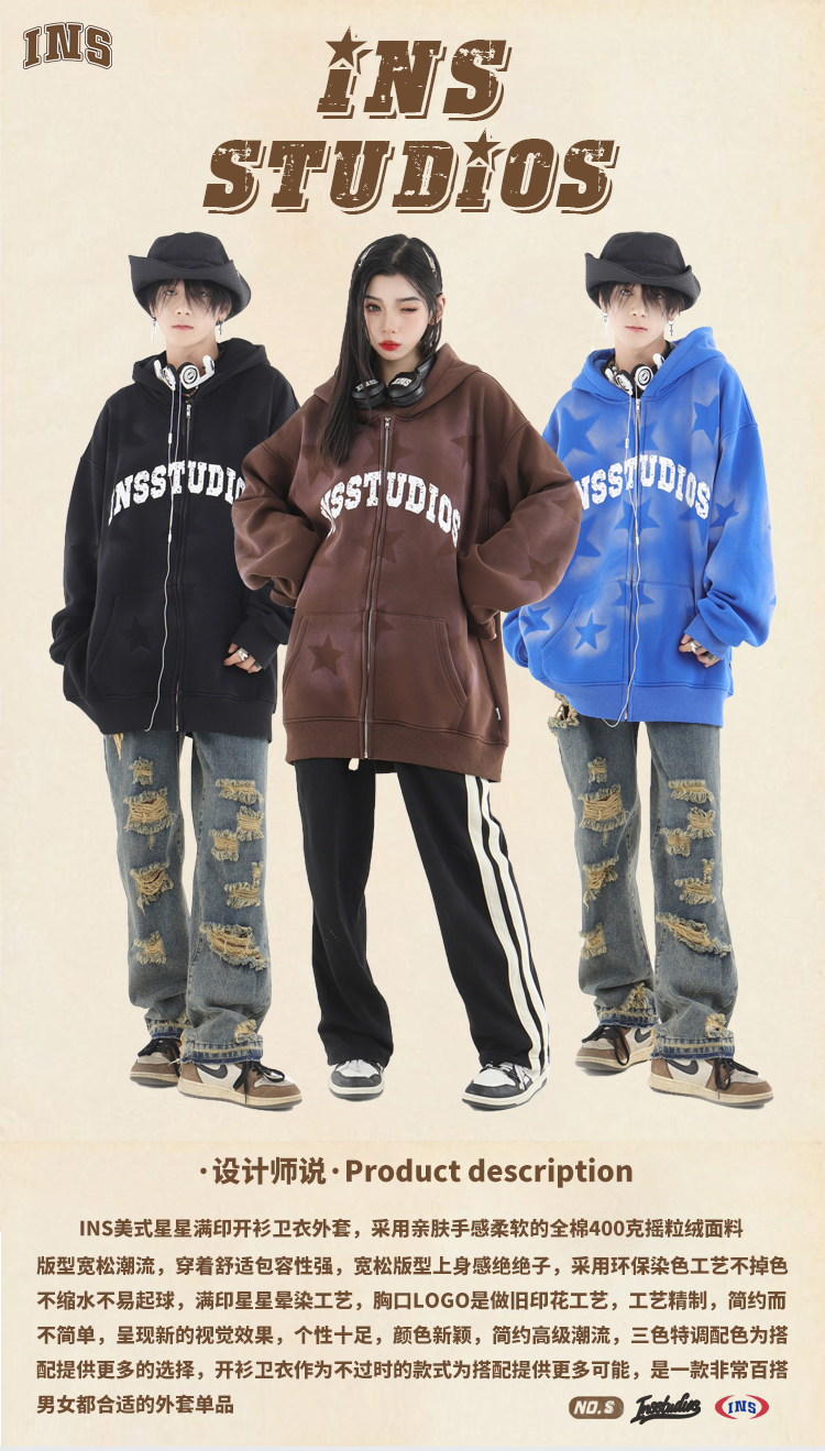 INSstudios 國潮牌情侶美式星星滿印暈染開衫厚棉T加絨拉鍊外套男