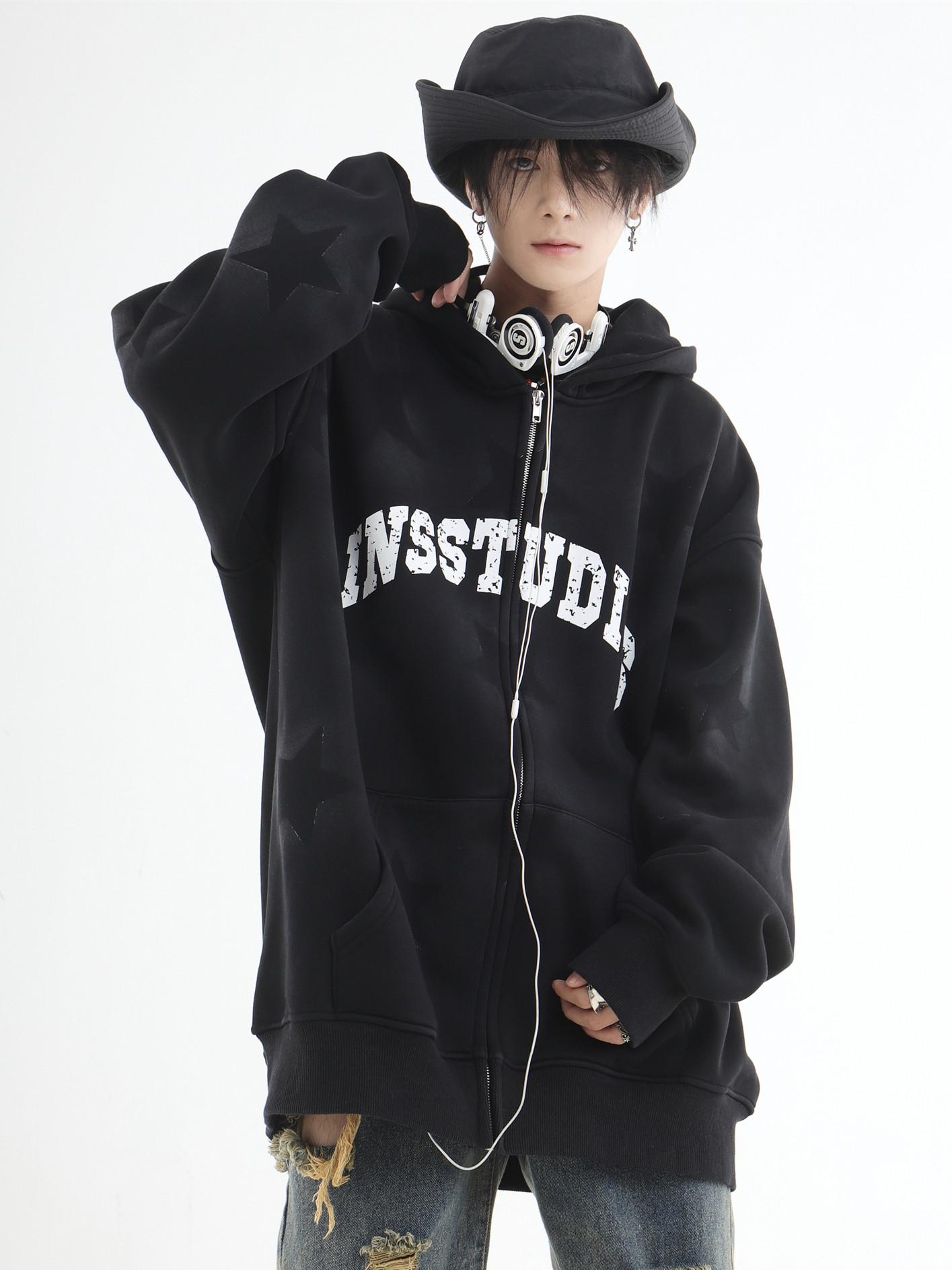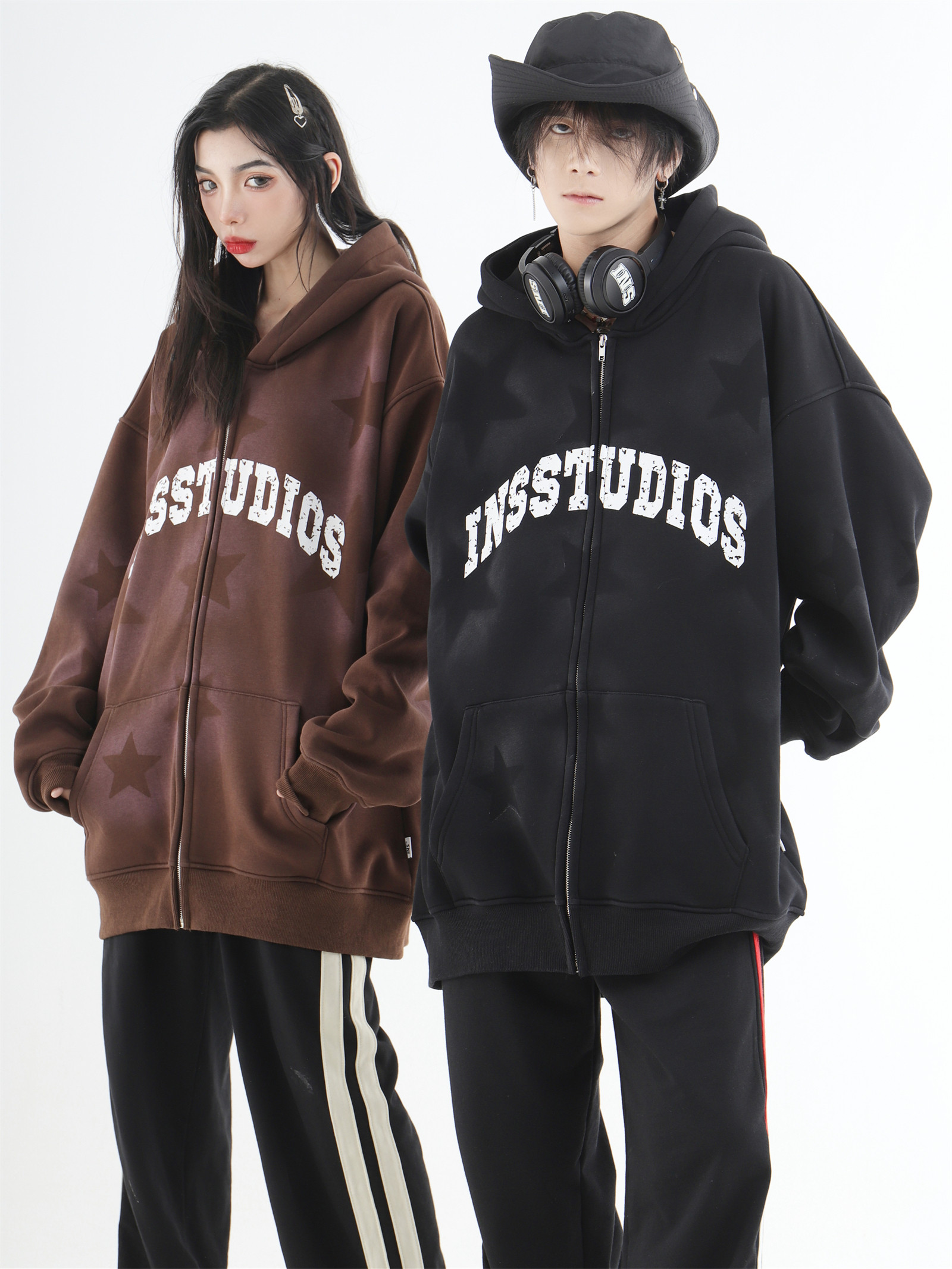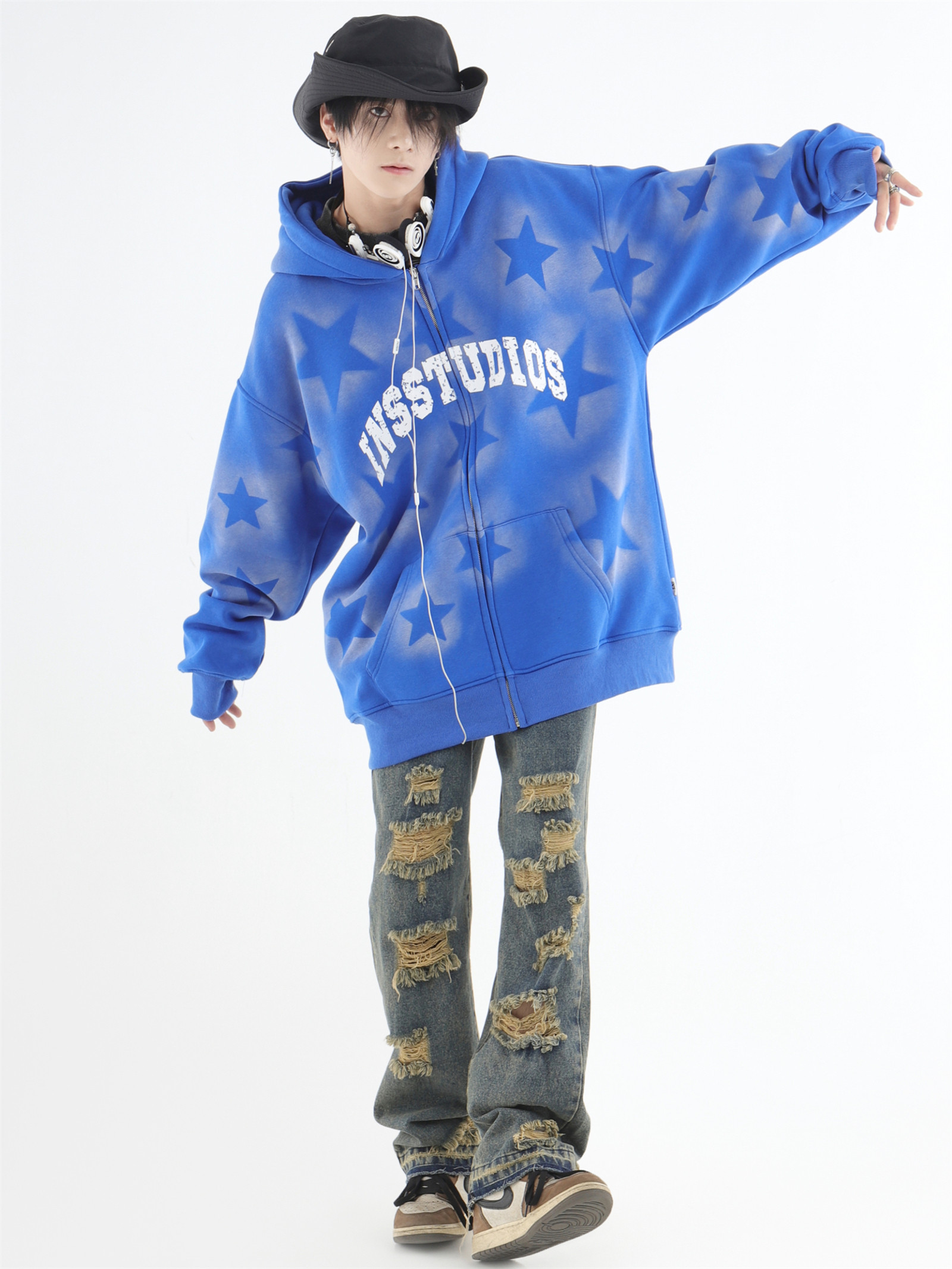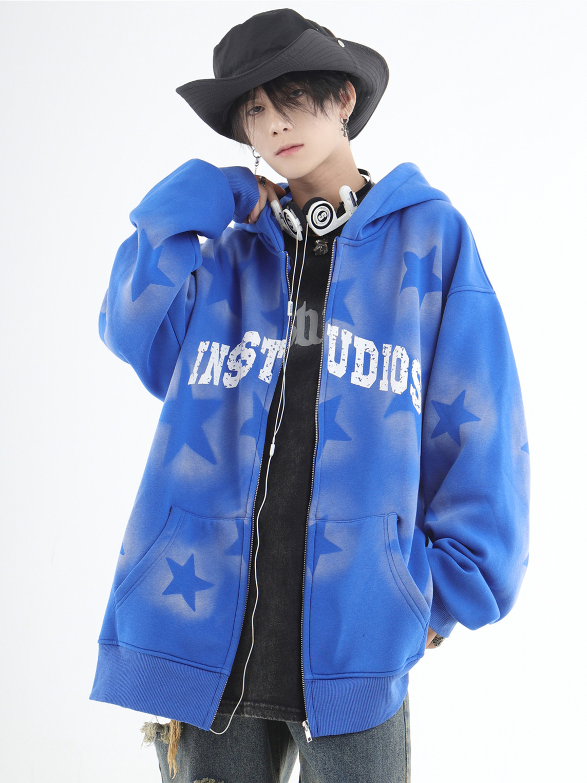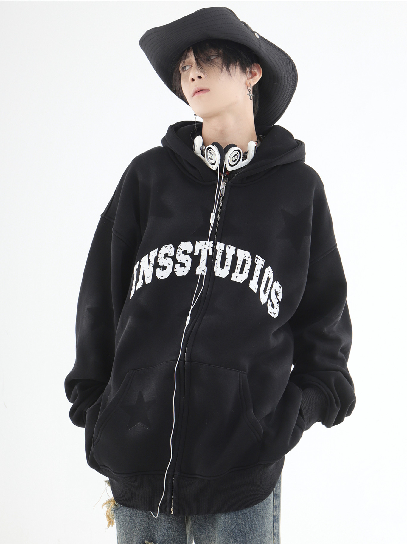 INSstudios 國潮牌情侶美式星星滿印暈染開衫厚棉T加絨拉鍊外套男