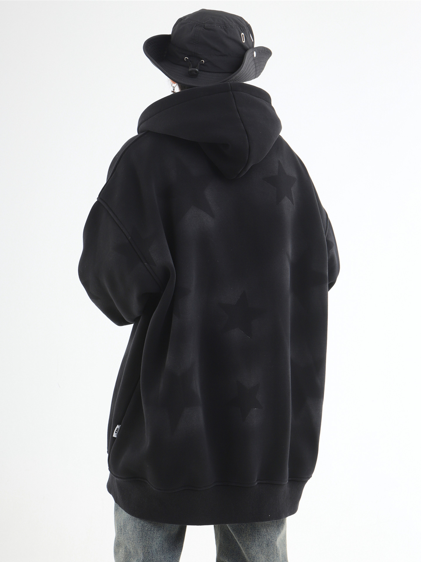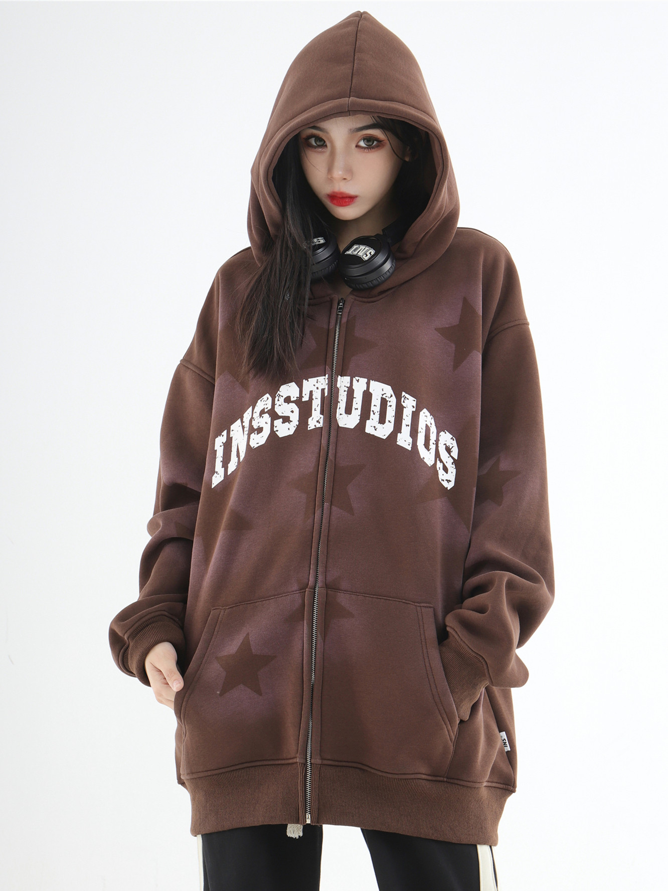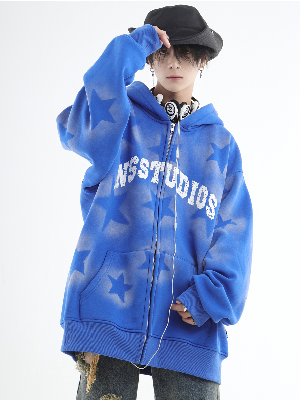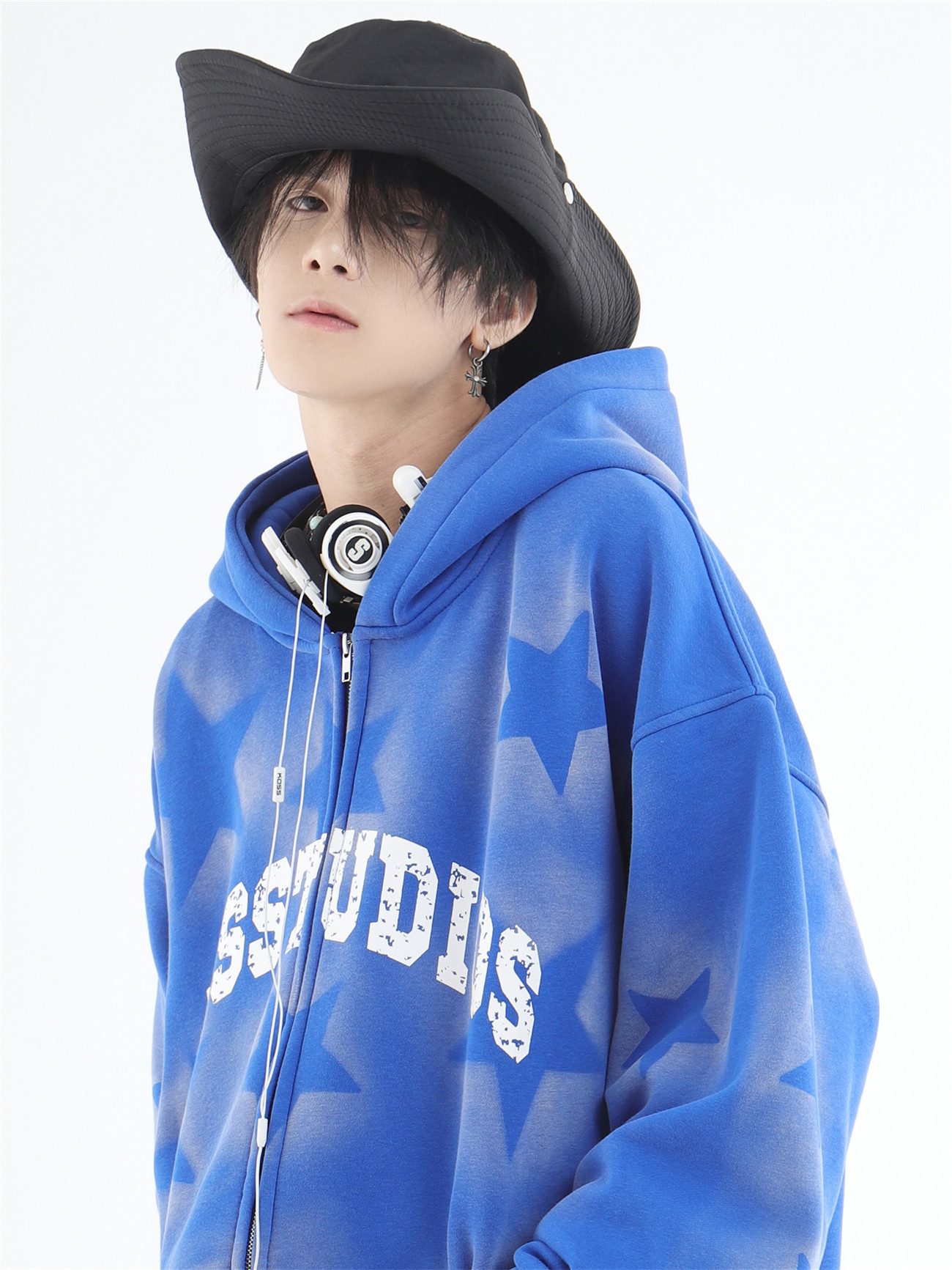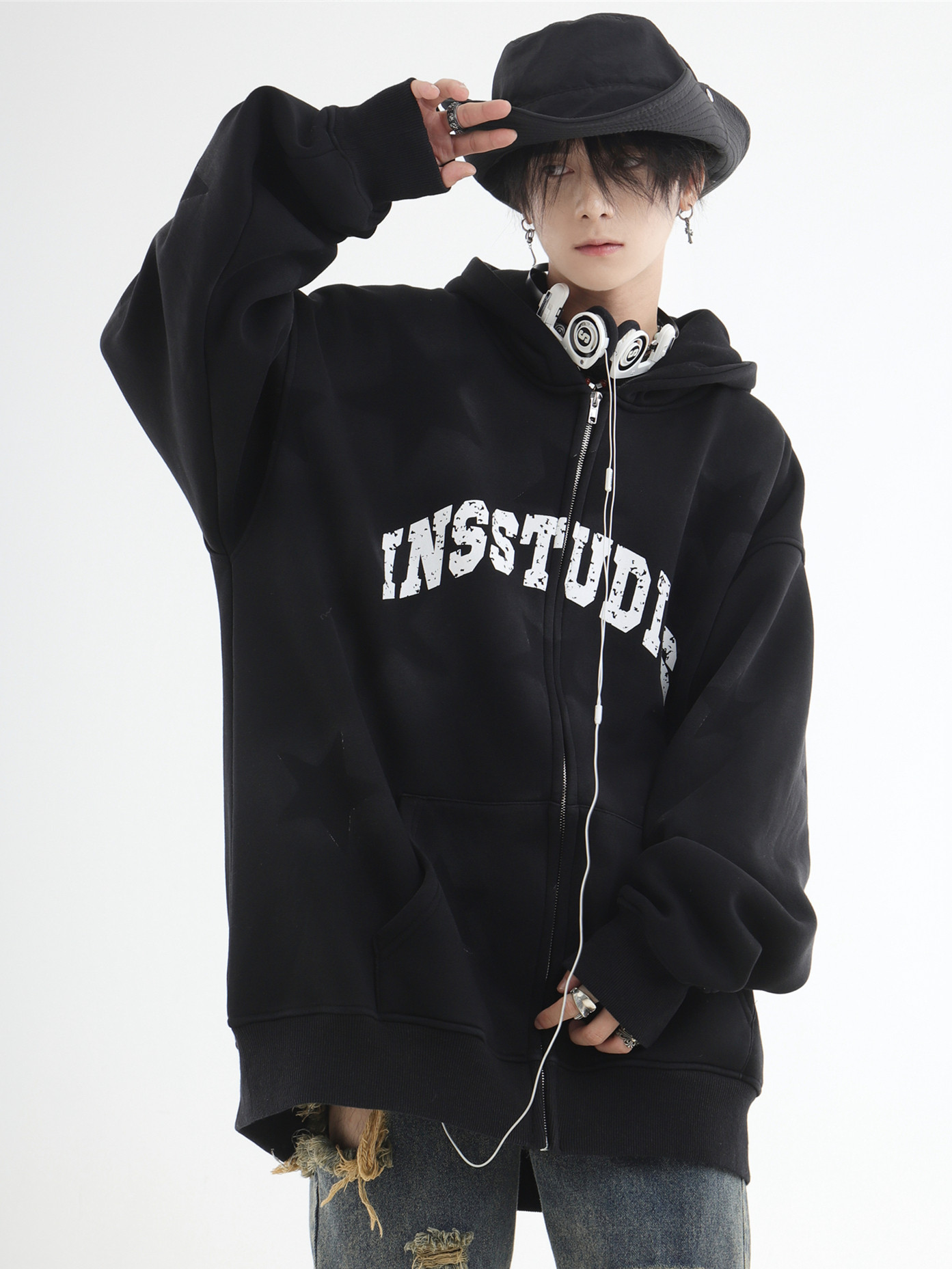 INSstudios 國潮牌情侶美式星星滿印暈染開衫厚棉T加絨拉鍊外套男