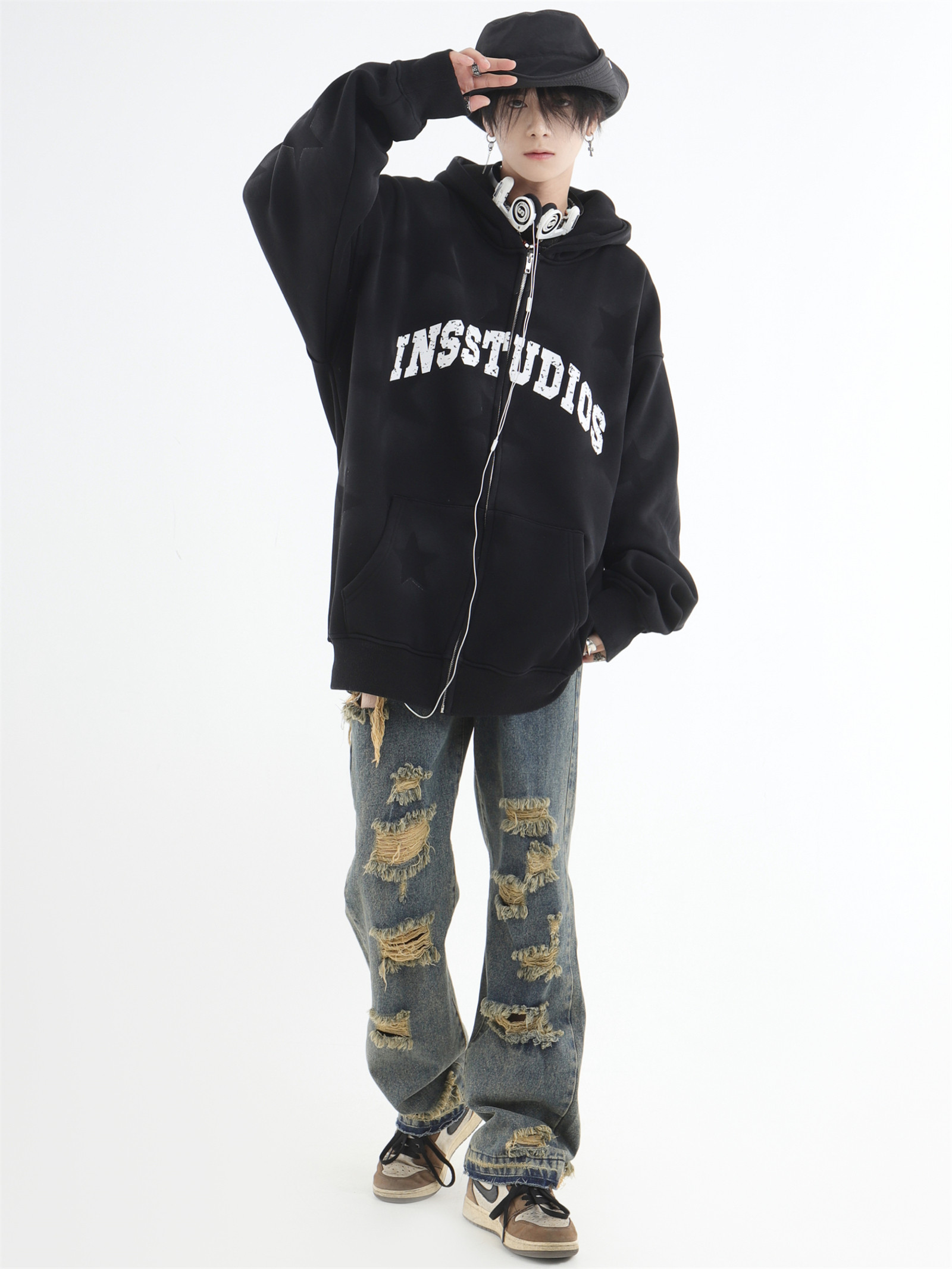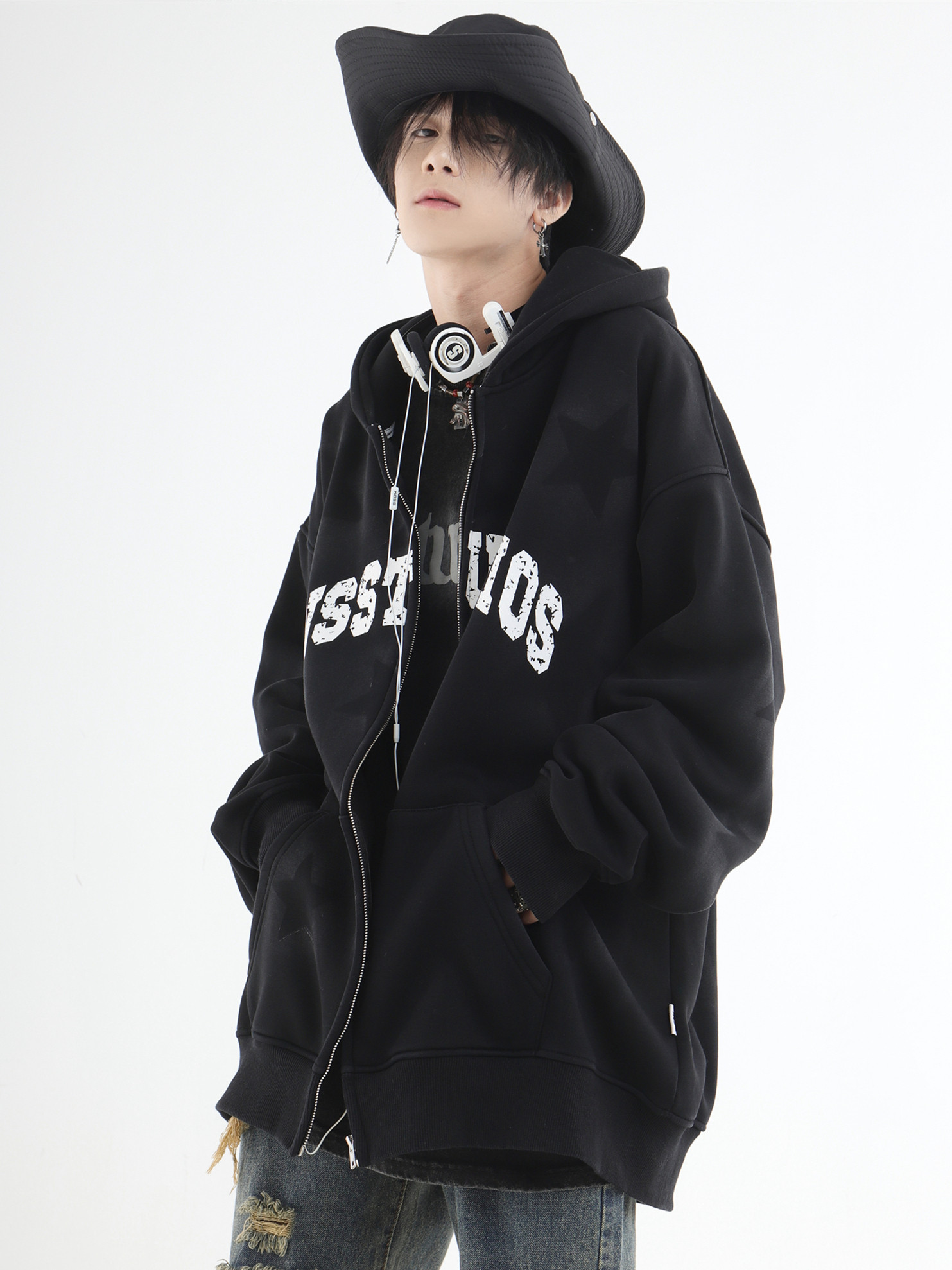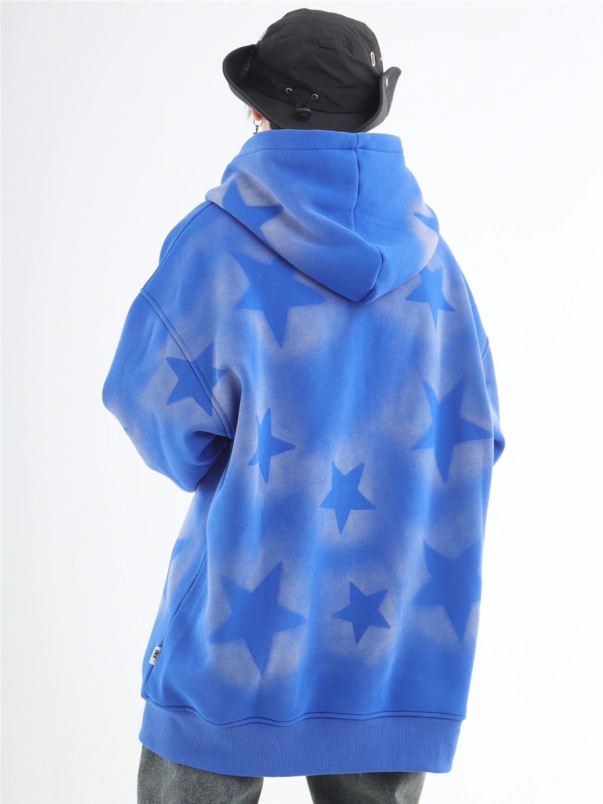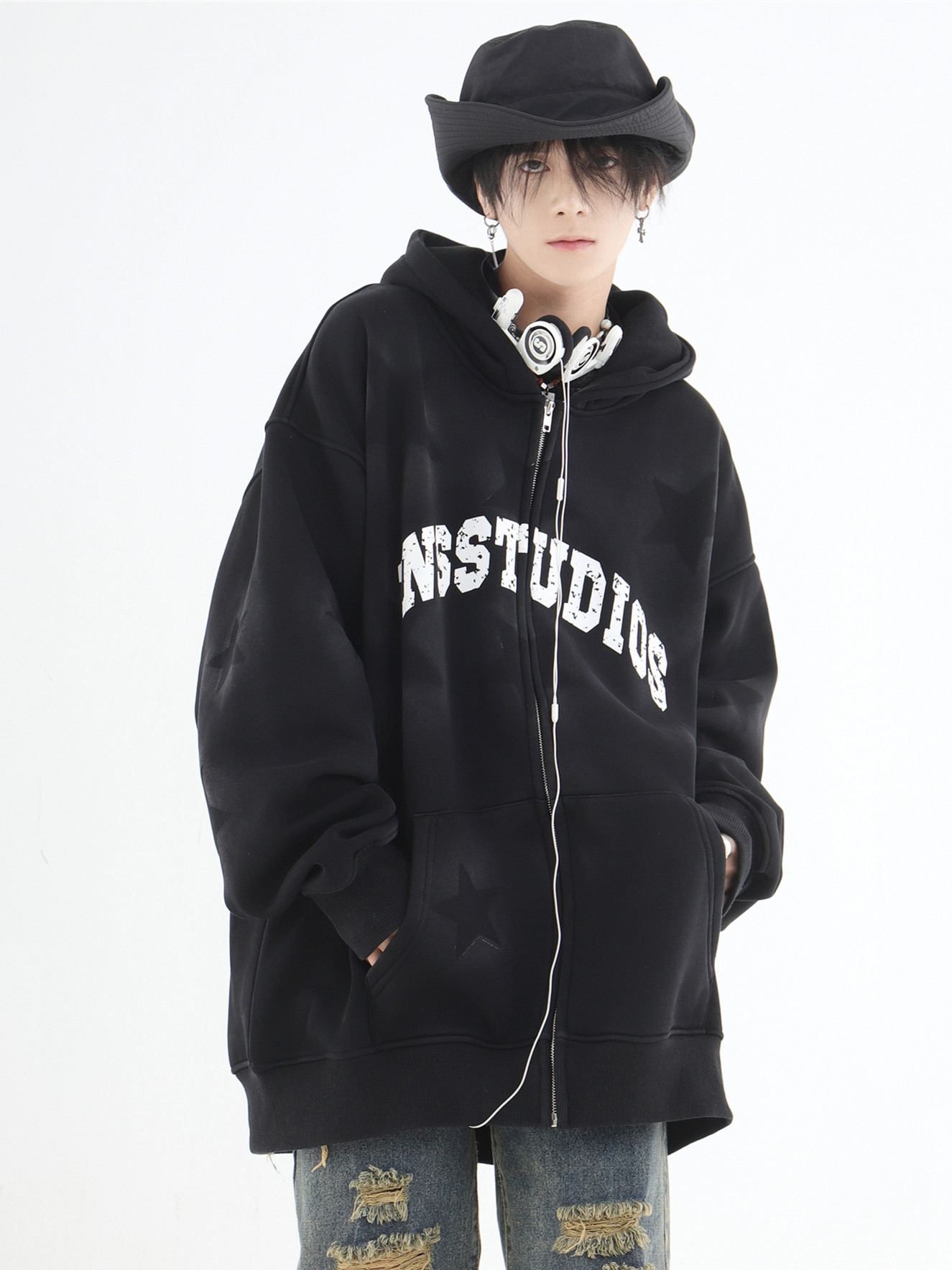 INSstudios 國潮牌情侶美式星星滿印暈染開衫厚棉T加絨拉鍊外套男